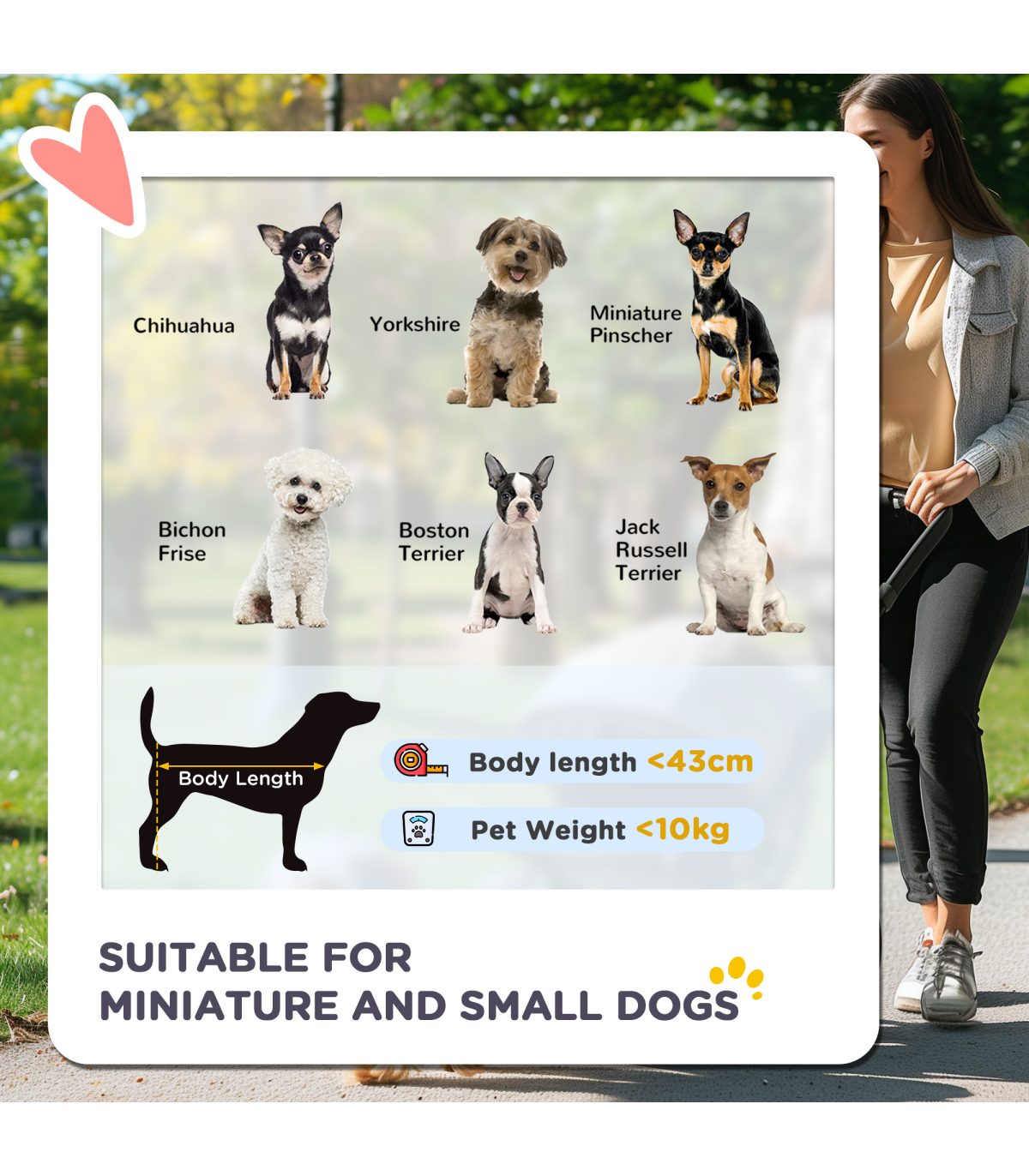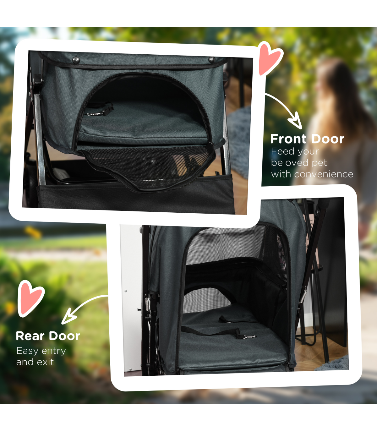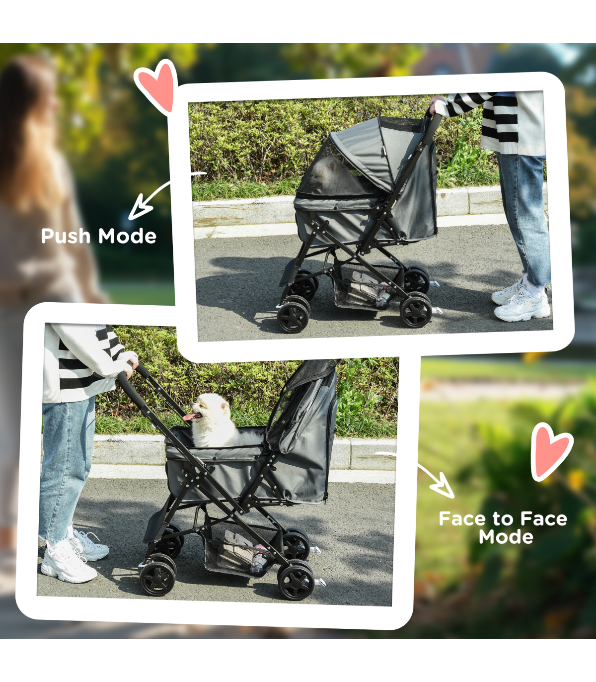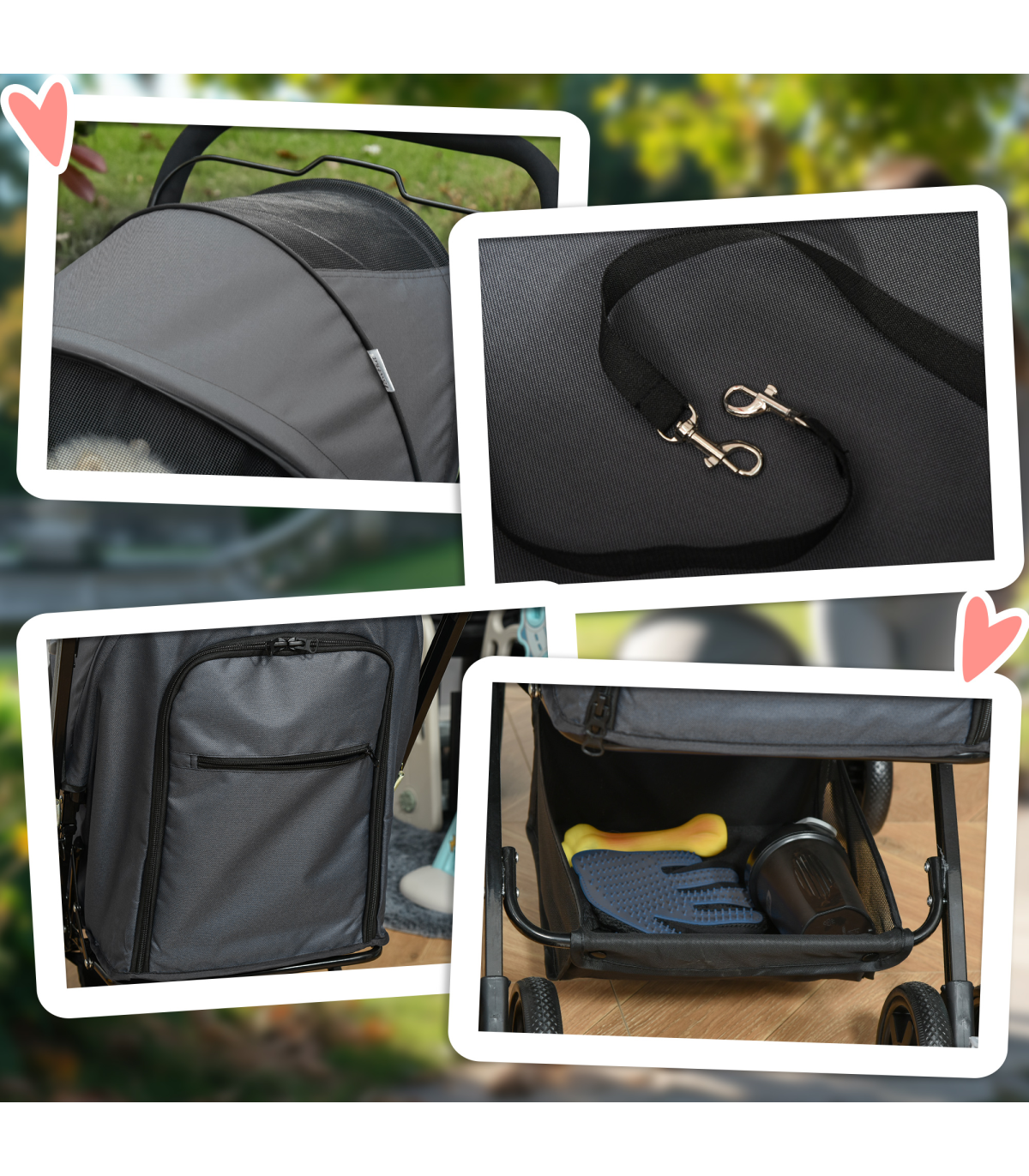 - Oxford cloth shell covers basket, with a mesh window to let air inside. Adjustable canopy to protect - Two inner leashes to keep pet safely strapped in - Four wheels and handlebar to push easily - two with brakes - Bottom basket and zipped bag for storage - Handlebar position is reversible - can face pet whilst pushing stroller along - Suitable for small and miniature dogs less than 43 cm in length and less than 10 kg in weight - Easy to fold and carry, assembly required- Colour: Grey - Material: Steel, Oxford Fabric - Overall Dimension: 76.5L x 52W x 95H cm - Internal Dimension: 63L x 36W x 51/20H cm(Canopy included/not included) - Folded Size: 80L x 52W x 27H cm - Rear Door Size: 29W x 38.5H cm - Top Mesh Skylight Size: 24L x 19W cm - Front Zipped Mesh Window Size: 26L x 14.5W cm - Basket Size: 34L x 27.5W x 14H cm - Front Wheel Size: 6" - Rear Wheel Size: 6" - Item Label: D00-126GY