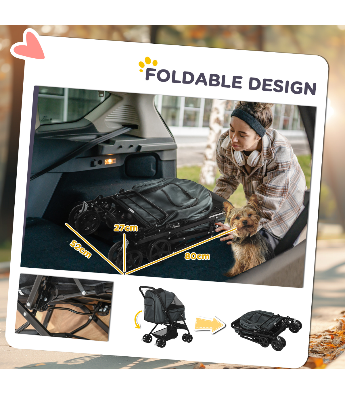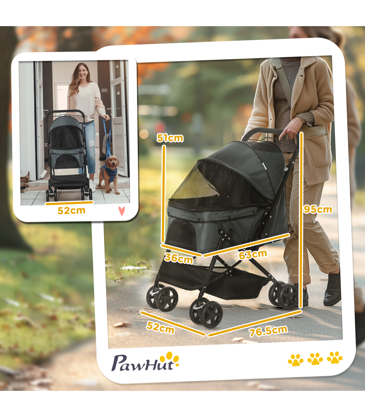 Designed for cats or small dogs, this trendy pet stroller from PawHut is the ideal accessory for your adventures together. With its reversible push handle, you can easily switch between facing your pet or letting them enjoy the view. The interior is spacious and cosy, giving your pet a comfortable and safe place to relax while you travel. It's also equipped with a handy storage basket for your pet's essentials. With its stylish design, this dog pram is sure to turn heads wherever you go.
