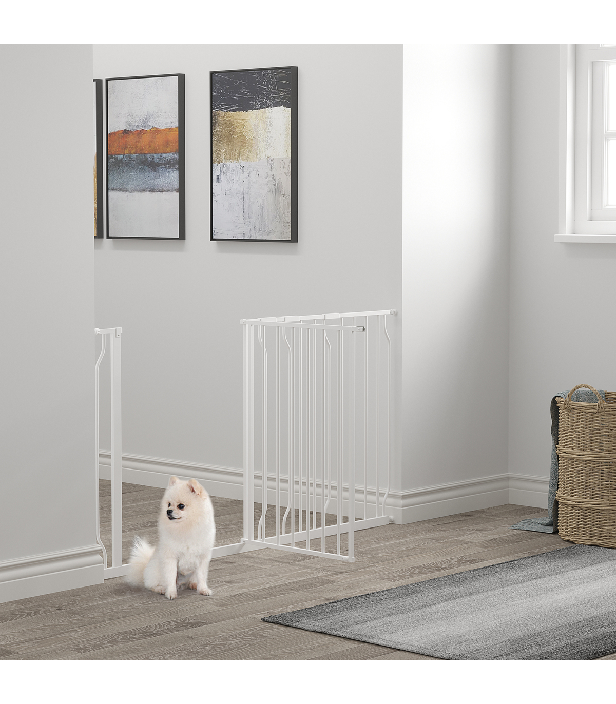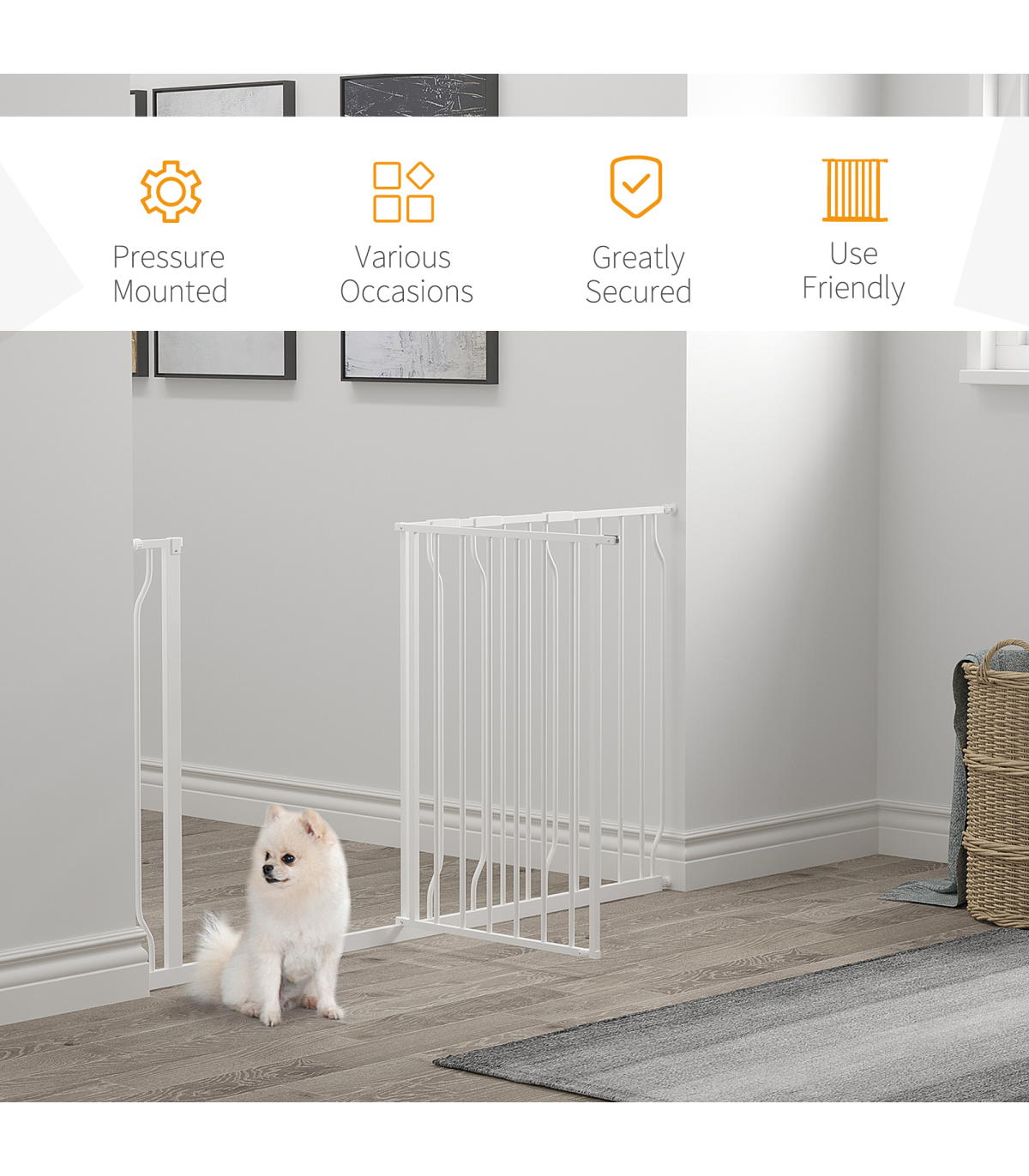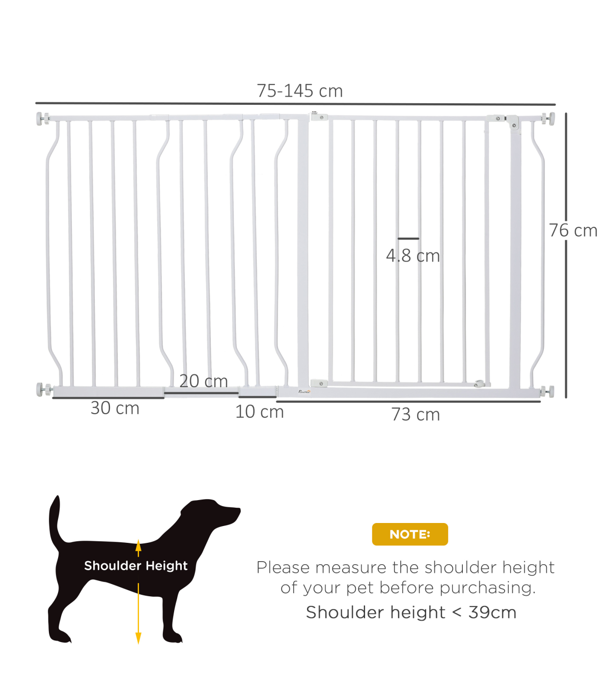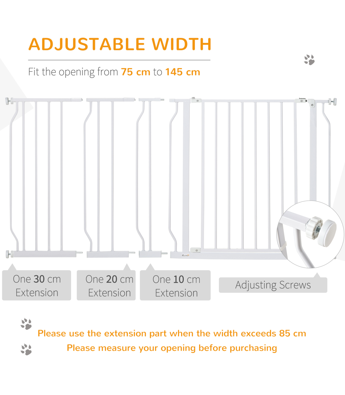 you can block different areas in your home.Double-locking system: Open the dog gate with one hand by pressing and lifting the button. A lock block at the bottom for added stability.Durable material: Made from sturdy steel, this puppy gate is strong and stays firmly upright when in use.Easy access: Opens in both directions to easily get through. Suitable for doorways, hallways and staircases.Dimensions: 76H x 75-145Wcm. Suitable for openings of 75-145cm. Please measure your opening before purchasing. Assembly required.