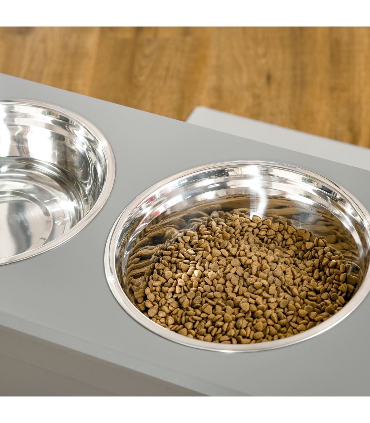 - Colour: Grey - Material: MDF and stainless steel - Dimensions: 41H x 60L x 30Wcm. Bowl platform: 60L x 30Wcm. Bowl size: 7H x Dia24cm. Single bowl capacity: 2L. Storage space: 39H x 58L x 28Wcm. Side handle: 10L x 2.5Wcm - Weight capacity: 30kg - Item Label: D08-021V00GY