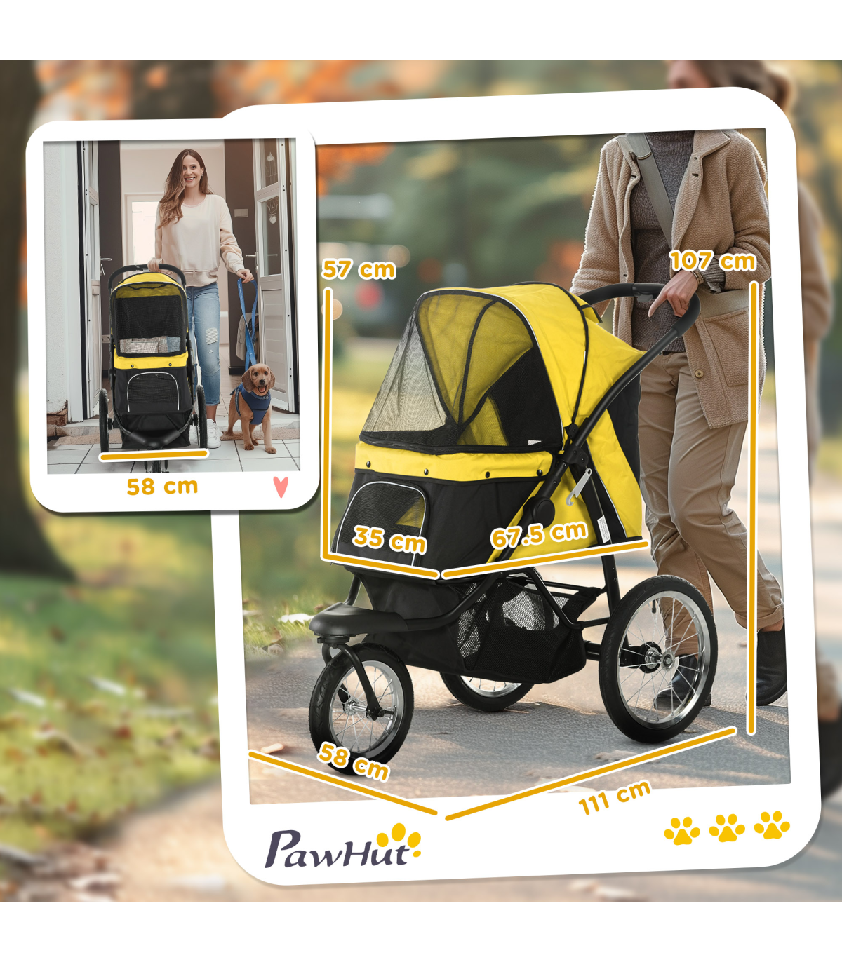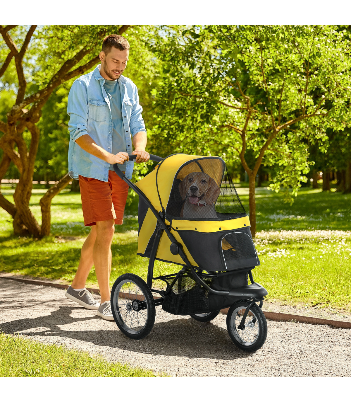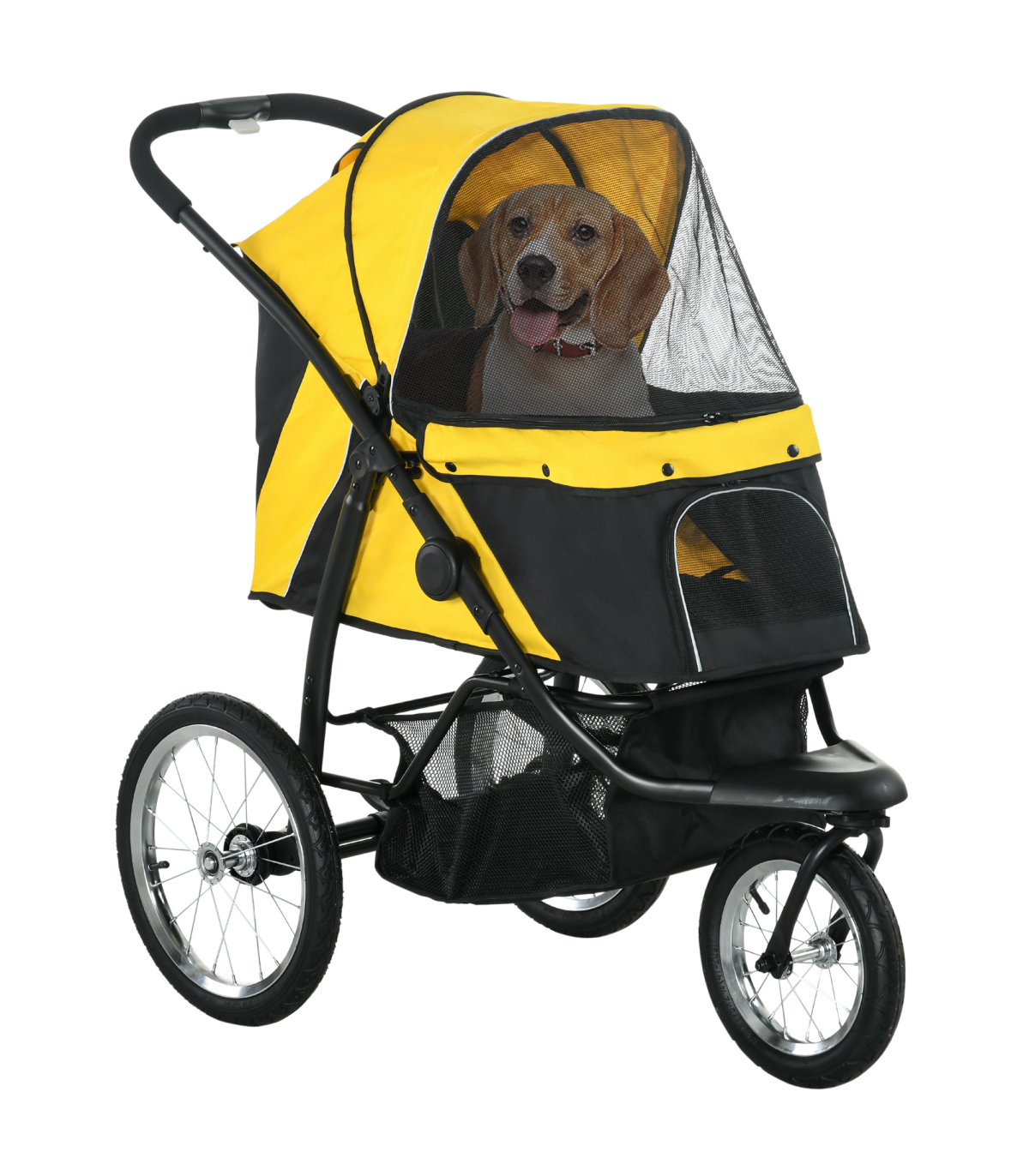 - Three large rubber wheels, suitable for all terrains. The front wheel is lockable - Adjustable canopy to keep pets sheltered - A soft mat inside for added comfort, which is removable and washable, keeping their space clean - Safety leashes, reflective strips and a rear footbrake provide safety and security - Easy to fold, thanks to its one-click design - Includes storage space - ideal for pet supplies and personal belongings - Suitable for small and medium dogs less than 43cm in length and 20kg in weight - Assembly required- Colour: Yellow - Material: Steel tube and oxford cloth - Dimensions: 107H x 111L x 58Wcm. Cabin: With/without canopy: 57/ 25H x 67.5L x 35Wcm. Off the ground: 46cm. Front door: 20H x 27Wcm. Pocket: 15H x 16.5Wcm. Folded: 57H x 110L x 58Wcm. Rear wheels removed: 35.5H x 103L x 40Wcm. Bottom basket: 20H x 50L x 30Wcm. Safety leash length: 28-53.5cm. Mat: 65L x 33.5Wcm. Front wheel: Dia30 x 4.5Wcm. Rear wheel: Dia40 x 4.5Wcm - Item label: D00-164V00YL
