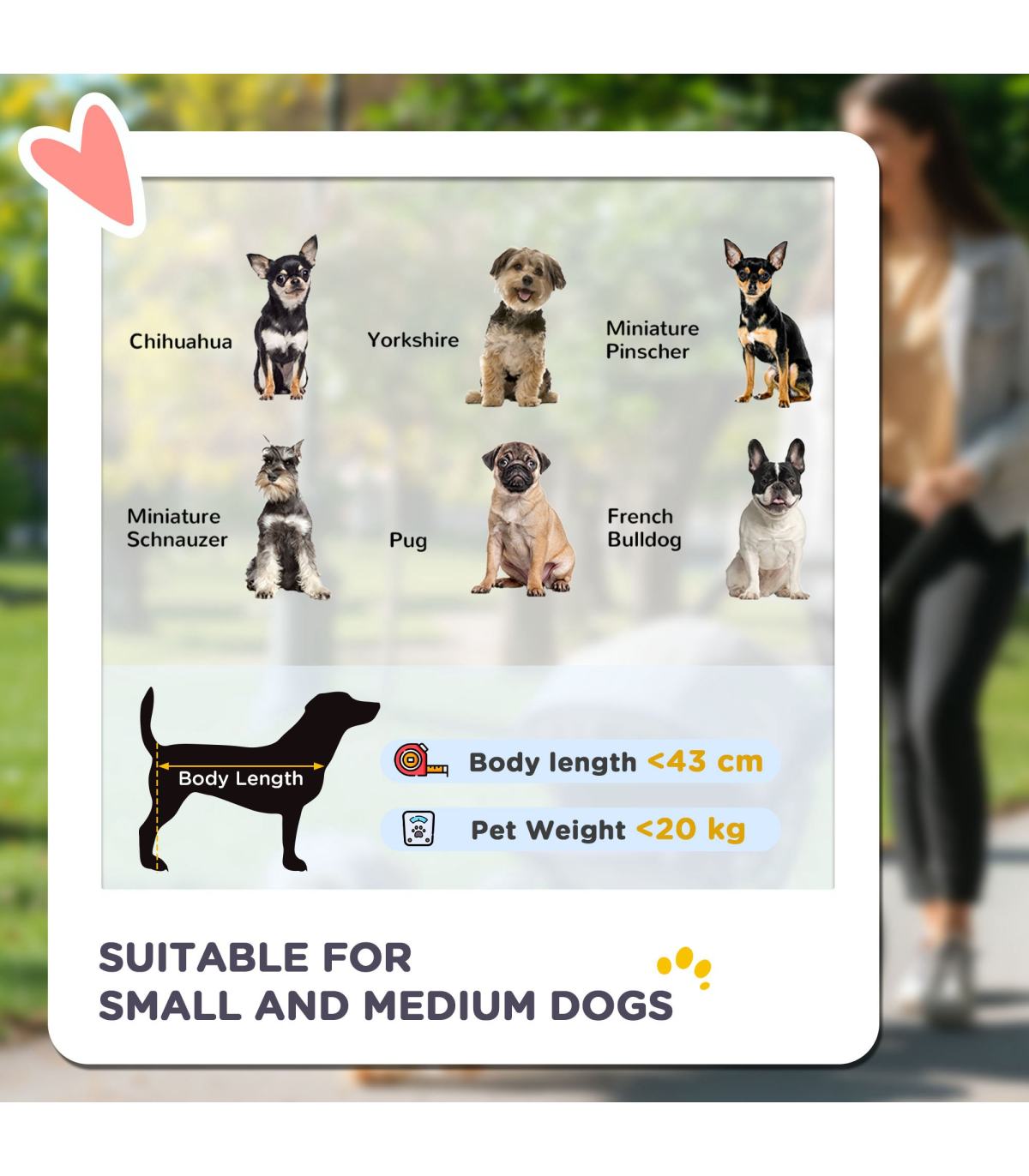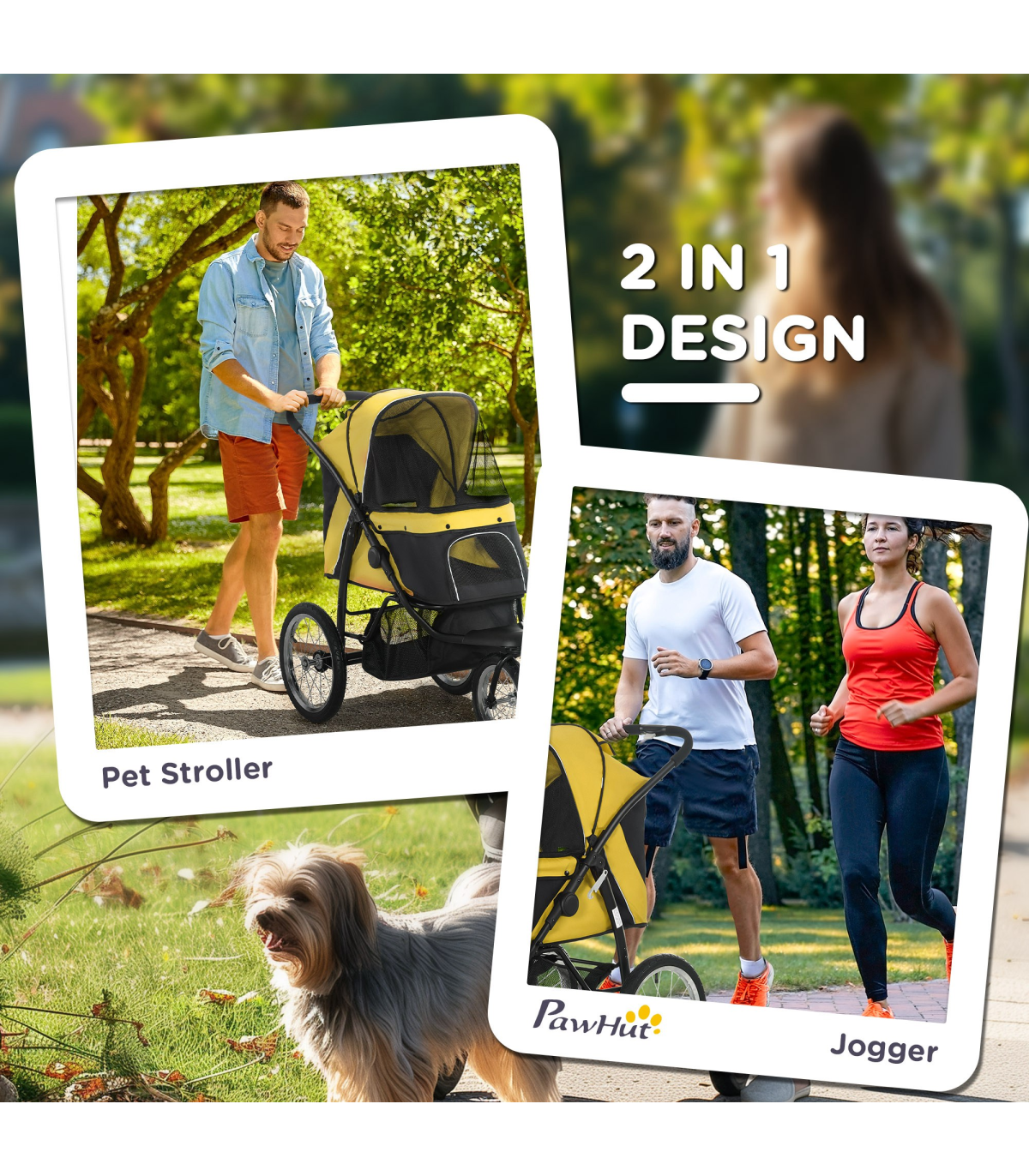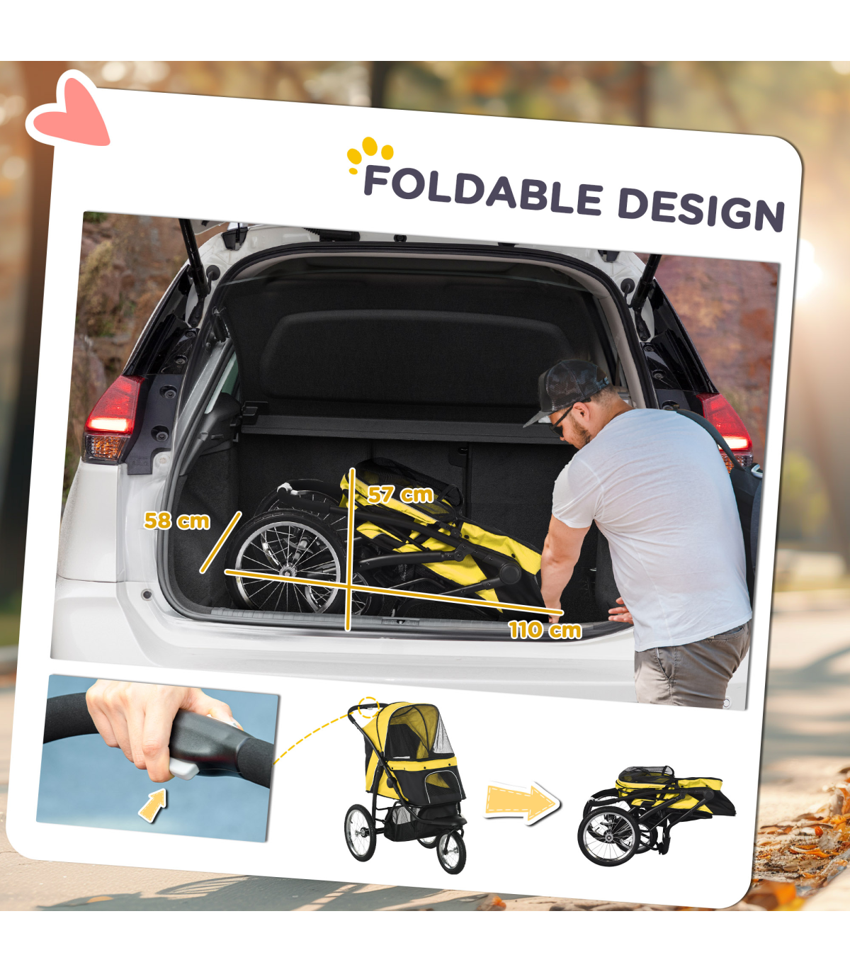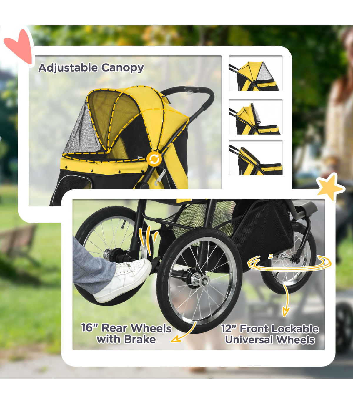 - Three large rubber wheels, suitable for all terrains. The front wheel is lockable - Adjustable canopy to keep pets sheltered - A soft mat inside for added comfort, which is removable and washable, keeping their space clean - Safety leashes, reflective strips and a rear footbrake provide safety and security - Easy to fold, thanks to its one-click design - Includes storage space - ideal for pet supplies and personal belongings - Suitable for small and medium dogs less than 43cm in length and 20kg in weight - Assembly required- Colour: Yellow - Material: Steel tube and oxford cloth - Dimensions: 107H x 111L x 58Wcm. Cabin: With/without canopy: 57/ 25H x 67.5L x 35Wcm. Off the ground: 46cm. Front door: 20H x 27Wcm. Pocket: 15H x 16.5Wcm. Folded: 57H x 110L x 58Wcm. Rear wheels removed: 35.5H x 103L x 40Wcm. Bottom basket: 20H x 50L x 30Wcm. Safety leash length: 28-53.5cm. Mat: 65L x 33.5Wcm. Front wheel: Dia30 x 4.5Wcm. Rear wheel: Dia40 x 4.5Wcm - Item label: D00-164V00YL