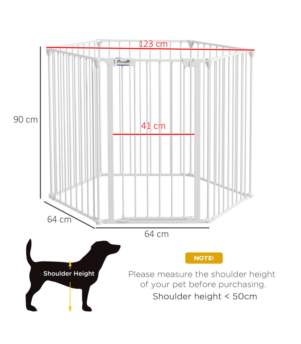 - "PawHut 2 in 1 Dog Pen, Safety Pet Gate, 6 Panels, for Medium Dogs, 90Hcm - White" - Description: - The door locks automatically - Can be set up into a hexagon, rectangle, L-shape, U-shape or W-shape with six panels, suitable for different spaces - Sturdy powder-coated steel frame for stability, no wobbling or falling - Foldable for space-saving storage - Suitable for medium dogs less than 50cm in shoulder height - Ideal for doorways, hallways, stairs, fireplaces, living rooms, etc. - Colour: White - Material: Steel and PA6 plastic - Dimensions: Octangle: 123L x 102W x 90Hcm, Rectangle: 128L x 64Wcm - Overall height: 90cm - Each panel: 90H x 64Wcm - Folded: 16H x 90L x 64Wcm - Door opening width: 41cm - Tube spacing: 5.5cm - Item label: D06-189V00WT