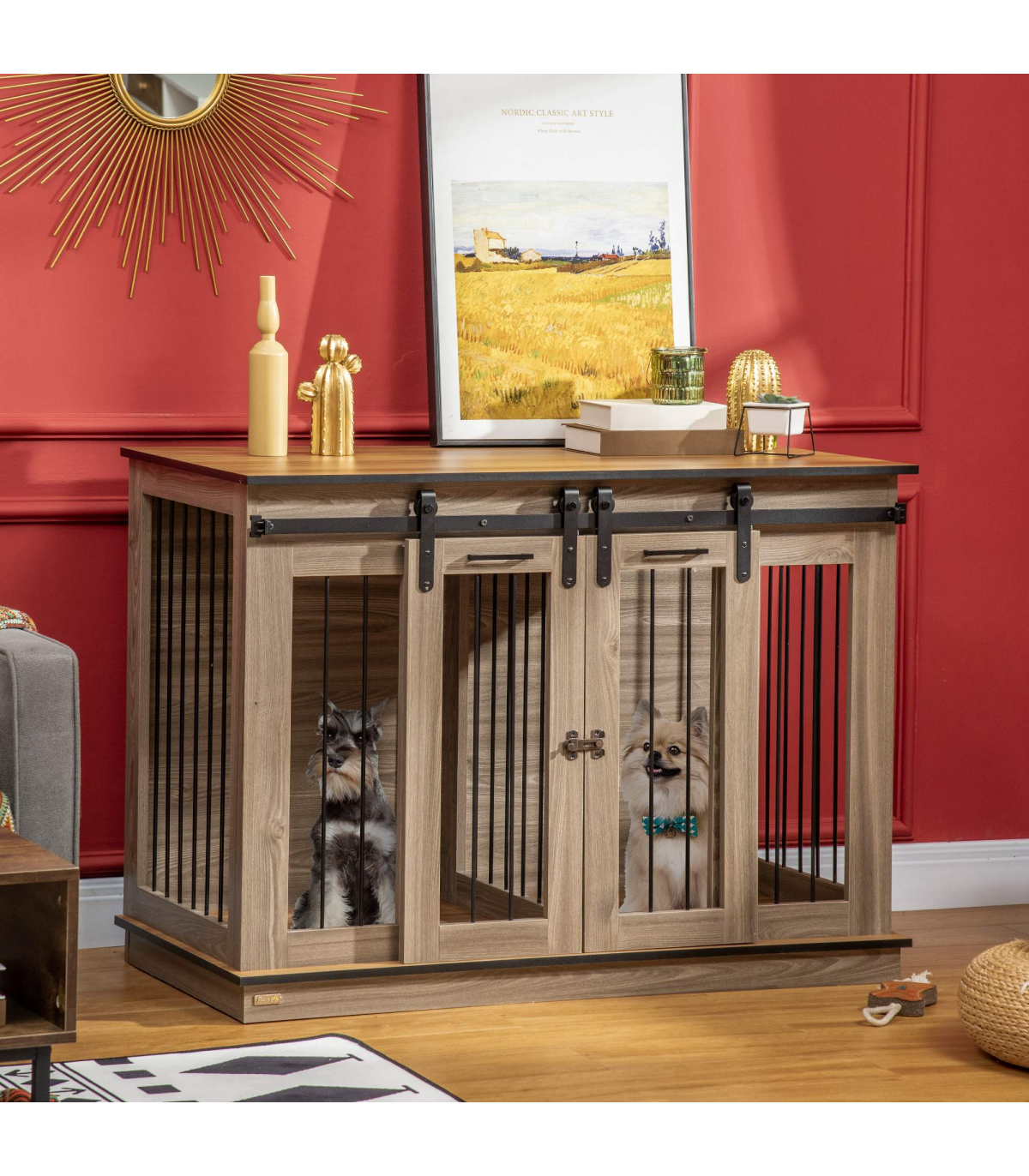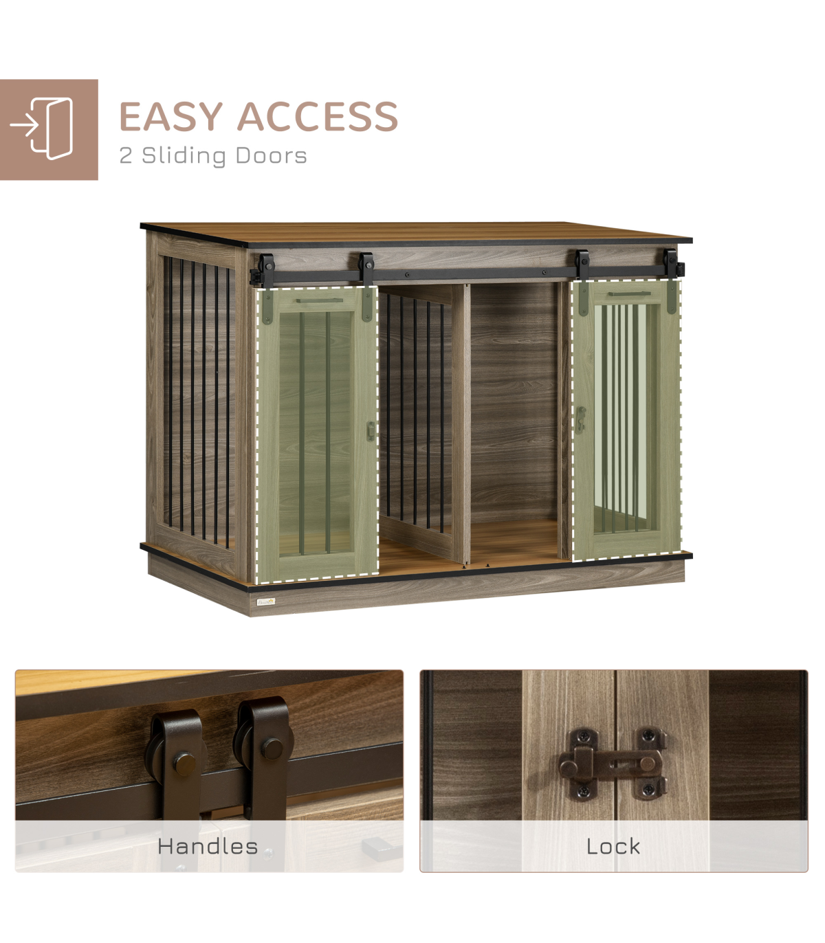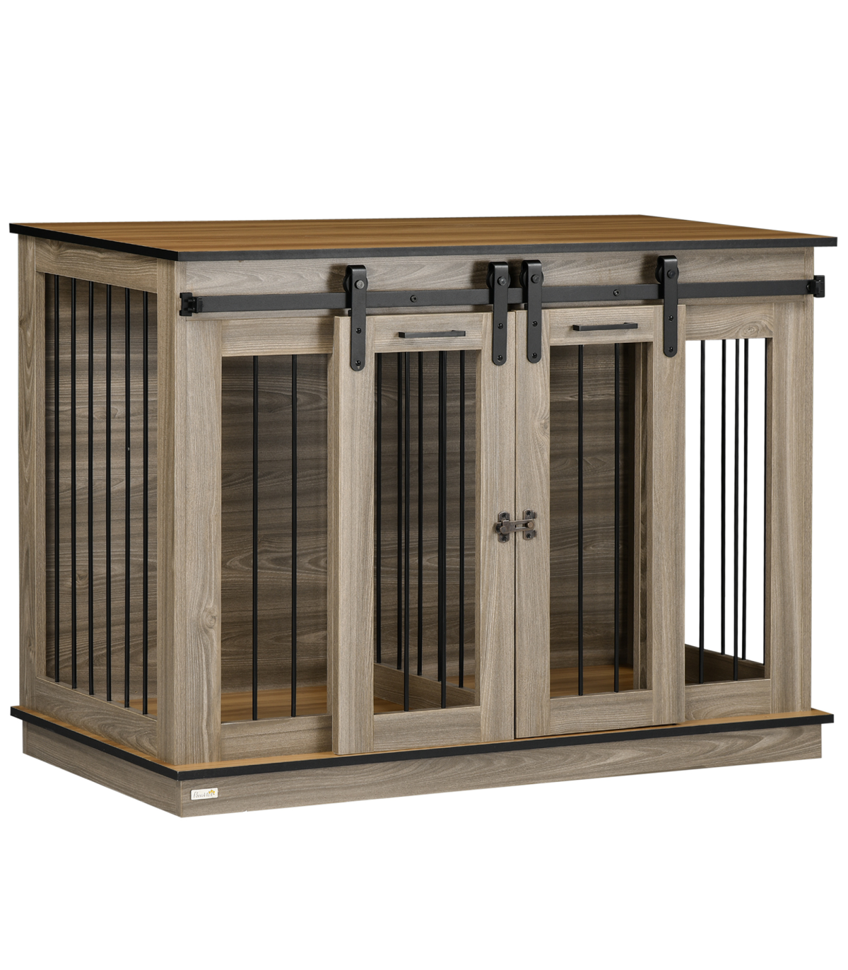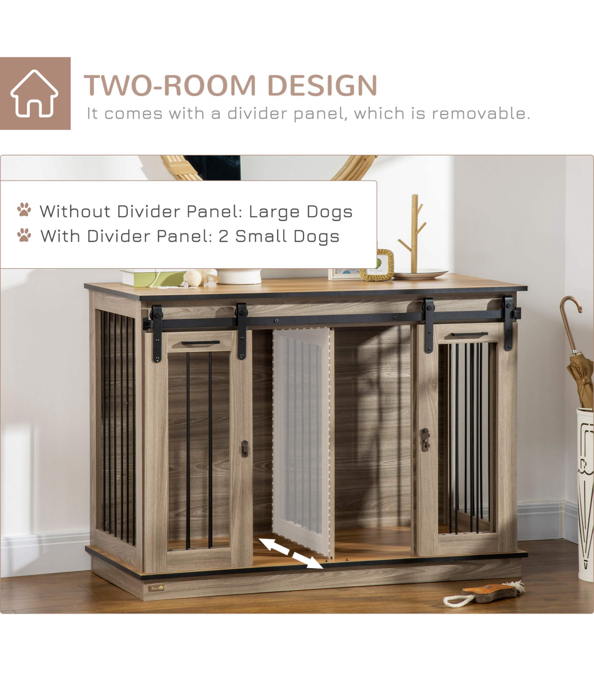 Keep pets safe and secure, whilst bringing style into the home � this PawHut dog cage table does it all. The divider lets you create two small spaces, suitable for two small dogs. Or you can remove the divider and have a spacious room, suitable for a larger dog. Its rustic farmhouse design suits any d�cor, whilst the large top is for displaying favourite pieces for more decoration. Double sliding doors for easy access, it has latches to keep pets safely inside when needed.