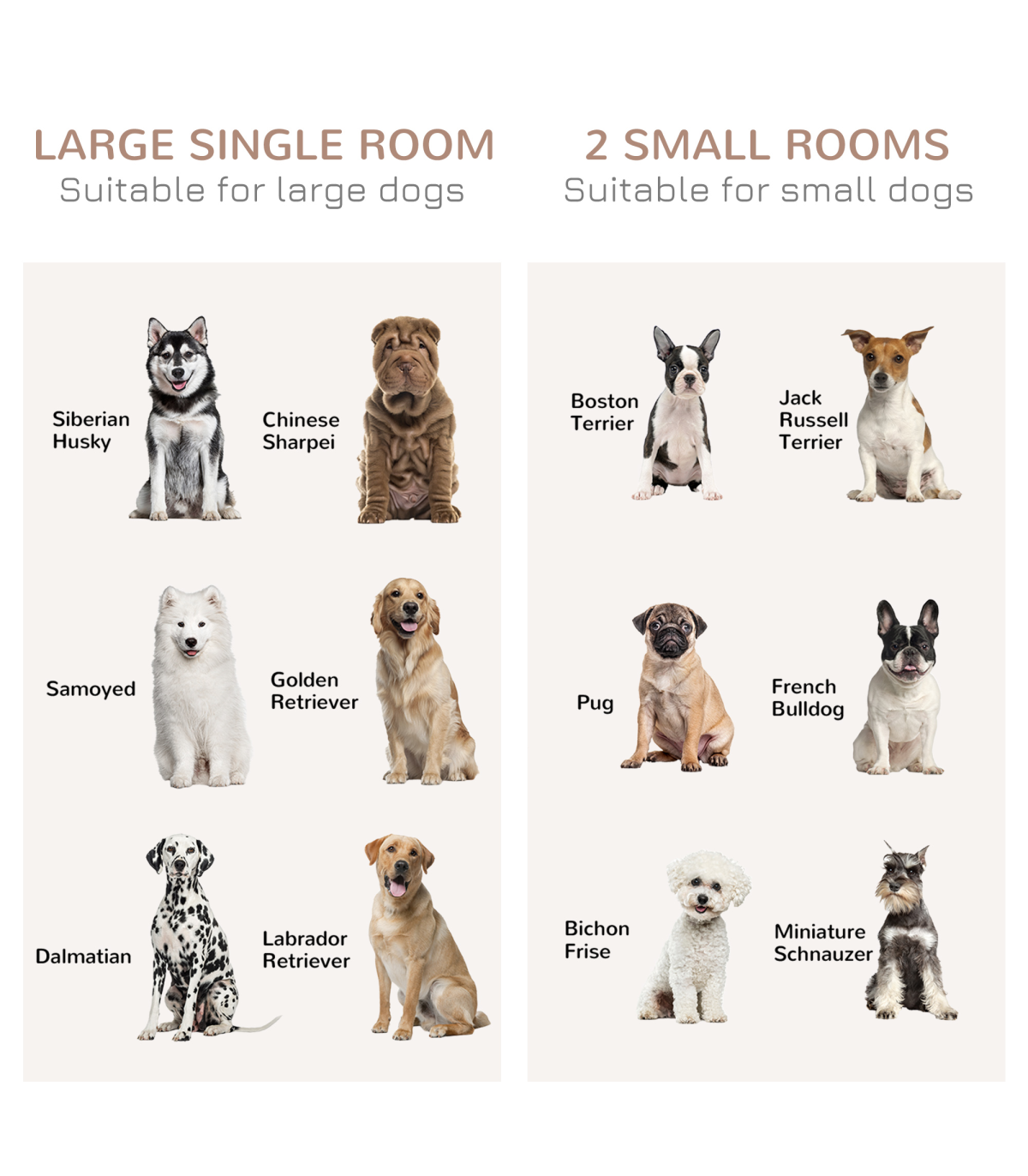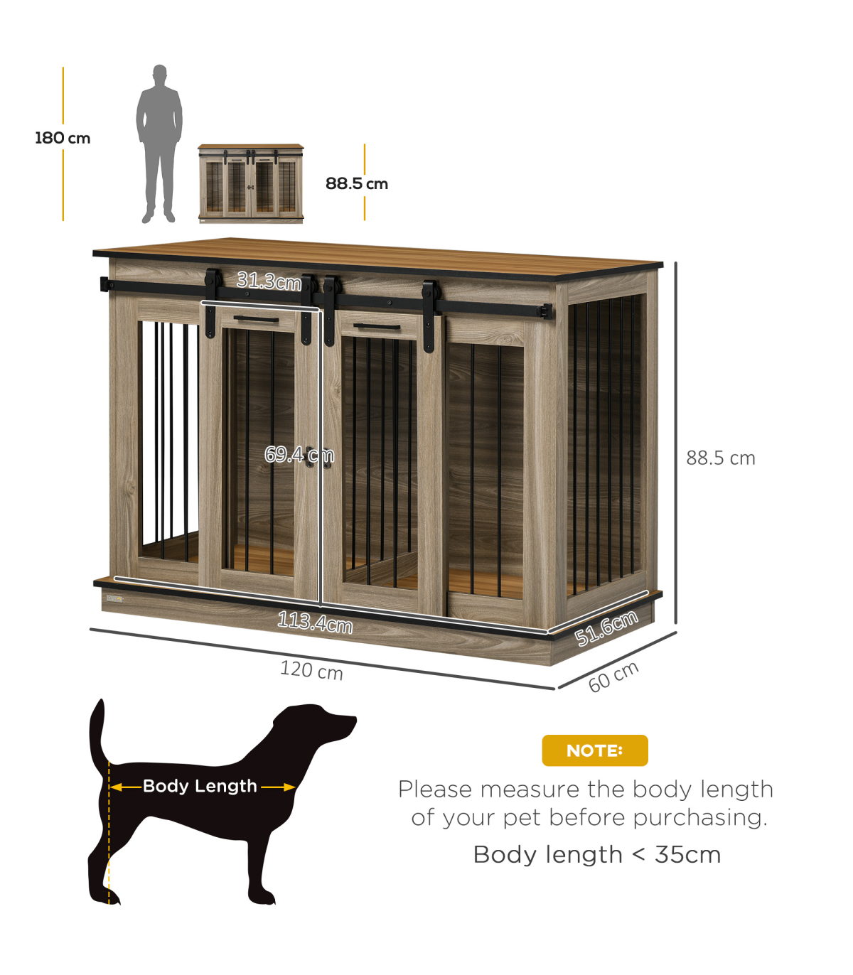- "PawHut Dog Crate for Large Dogs, Double Dog Cage for Small Dog, Oak Tone" - Description: - Can be used as a large room, ideal for two small dogs. Or use the divider to create two smaller rooms - Wide tabletop can be used as a side table for extra decoration - Includes two lockable sliding doors for security - Large single room suitable for dogs under 60cm in length and 30kg, or small dogs under 35cm in length and 8kg with two rooms - Assembly required - Colour: Oak tone - Material: MDF and steel - Dimensions: - Overall: 88.5H x 120W x 60Dcm - Inside cage: 78.9H x 113.4W x 51.6Dcm - Double room: Each: 78.9H x 55.8W x 51.6Dcm - Double door: 9.4H x 31.3W (singular door) - Side window: 66.7H x 43.5Wcm - Steel tube spacing: 5.7cm - Off the ground: 7.8cm - Weight capacity: - Inside: 50kg - Top: 60kg - Item label: D02-085AK