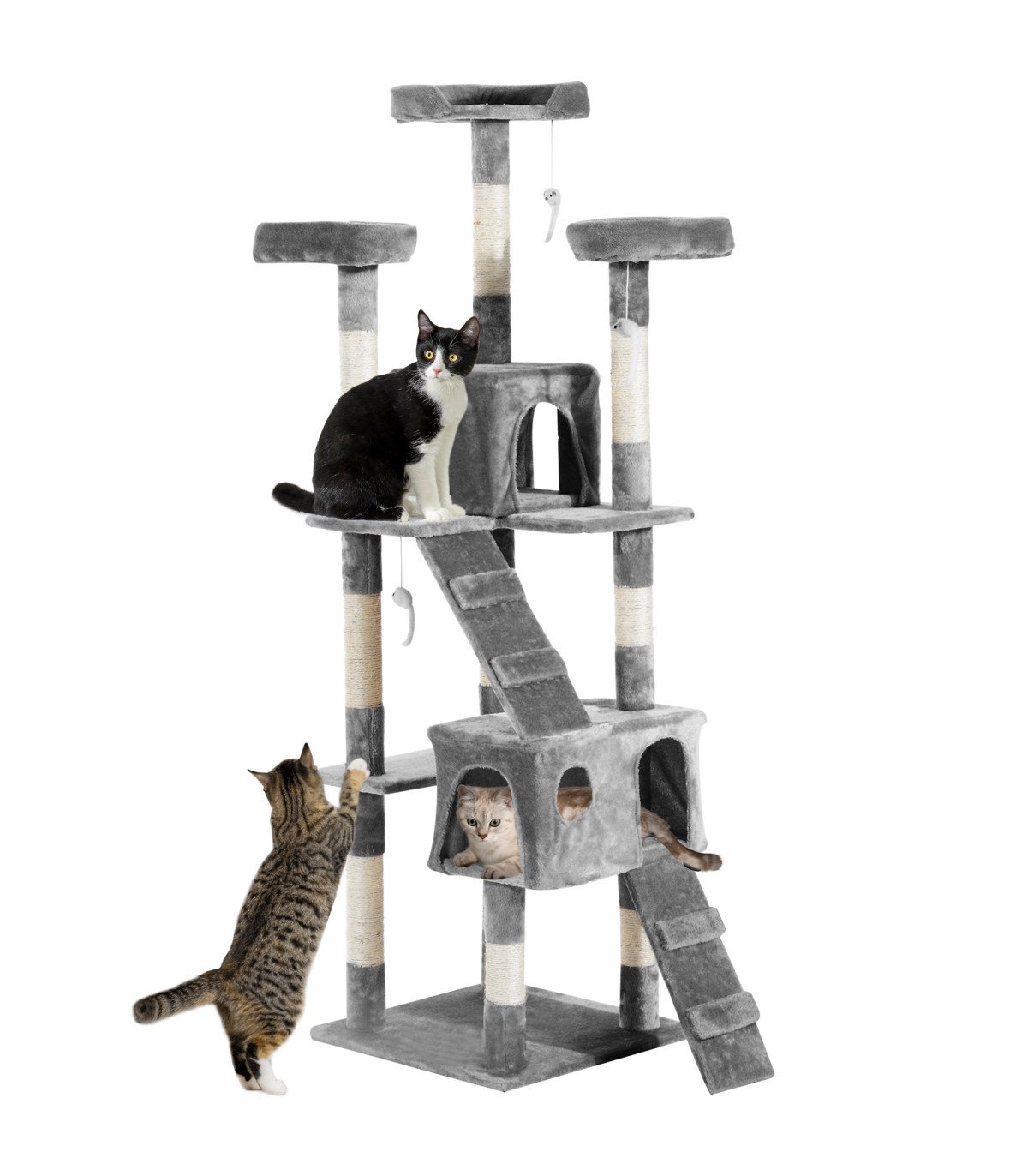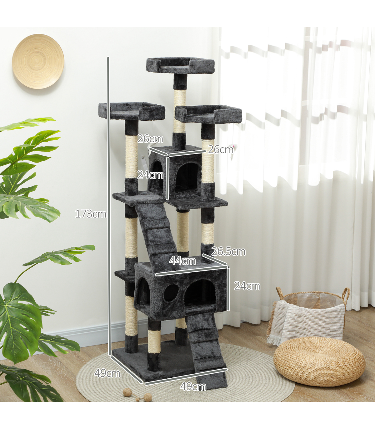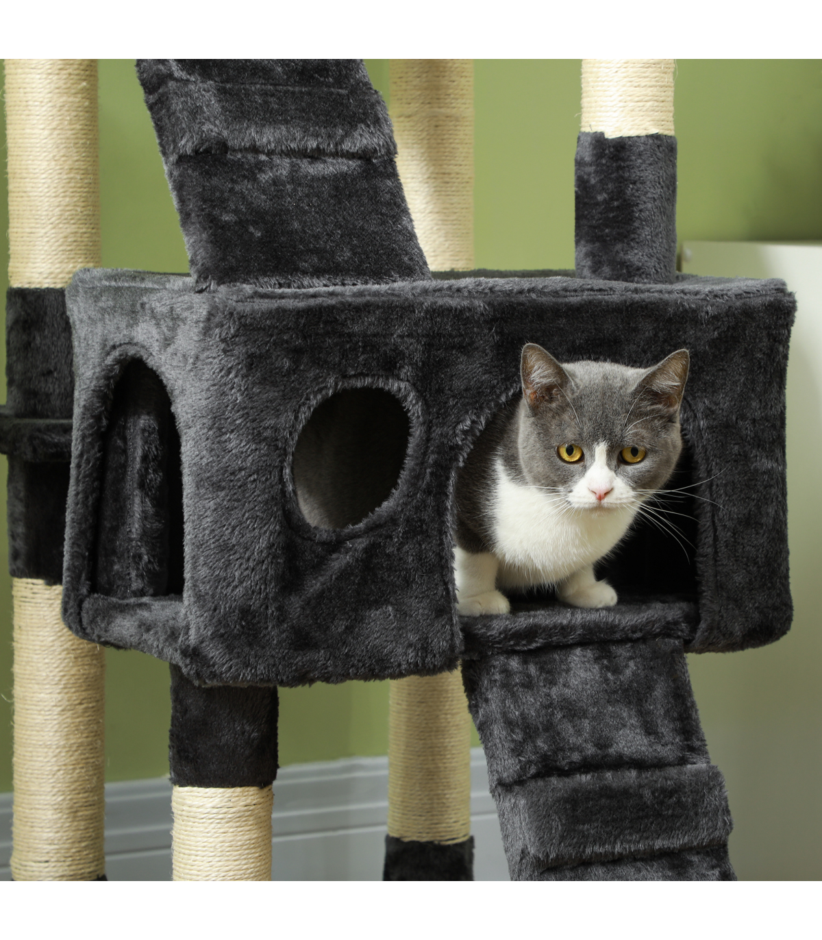 - With multiple levels, this tall cat tree includes three top perches, two spacious cat houses, two ladders and three dangling toys - Made of solid particle board, wrapped with warm and soft plush - The post is made with wear-resistant sisal rope, allowing pets to scratch and dig - Includes three dangling toys for pets to play with - Assembly required- Material: Particle board and plush cloth - Colour: Grey - Dimensions: 170H x 50L x 50Wcm. First cat box: 24H x 44L x 27Wcm. Second cat box: 24H x 27L x 27Wcm. Bottom board: 48.5L x 48.5Wcm. Packaging dimensions: 25H x 50L x 50Wcm. - Weight capacity: 10kg - Gross weight: 14.2kg - Custom label: D30-050GY