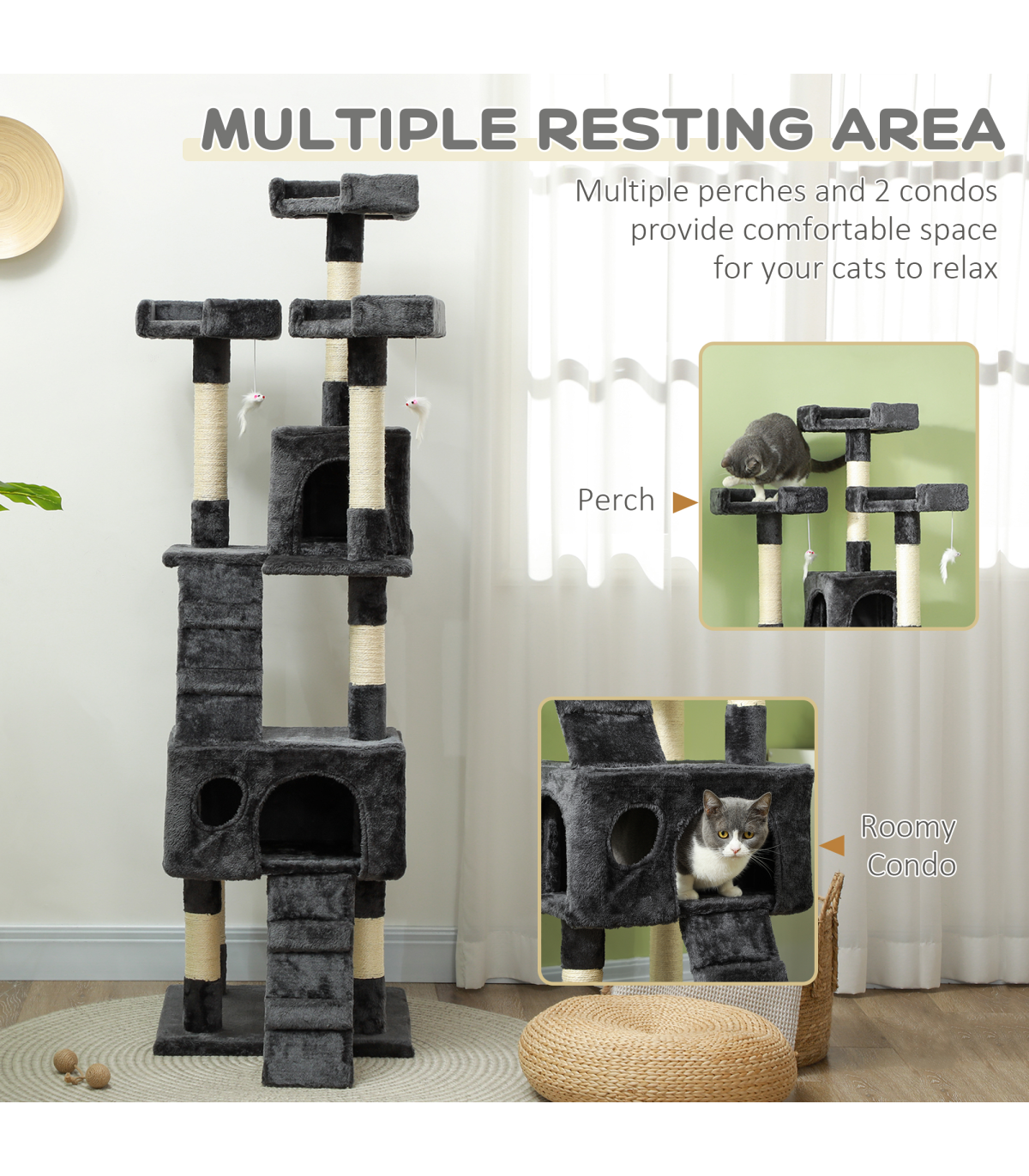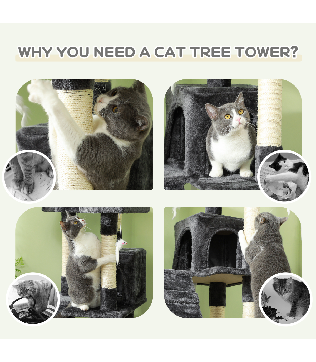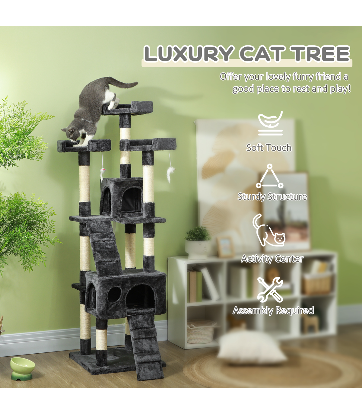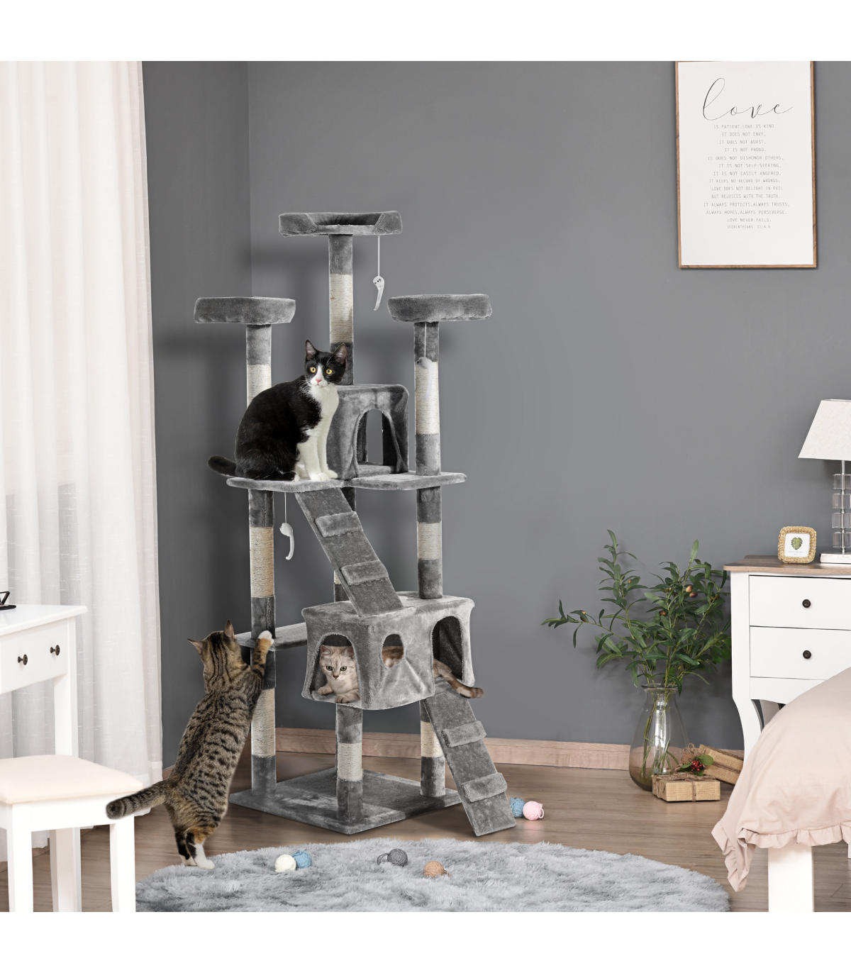 - With multiple levels, this tall cat tree includes three top perches, two spacious cat houses, two ladders and three dangling toys - Made of solid particle board, wrapped with warm and soft plush - The post is made with wear-resistant sisal rope, allowing pets to scratch and dig - Includes three dangling toys for pets to play with - Assembly required- Material: Particle board and plush cloth - Colour: Grey - Dimensions: 170H x 50L x 50Wcm. First cat box: 24H x 44L x 27Wcm. Second cat box: 24H x 27L x 27Wcm. Bottom board: 48.5L x 48.5Wcm. Packaging dimensions: 25H x 50L x 50Wcm. - Weight capacity: 10kg - Gross weight: 14.2kg - Custom label: D30-050GY