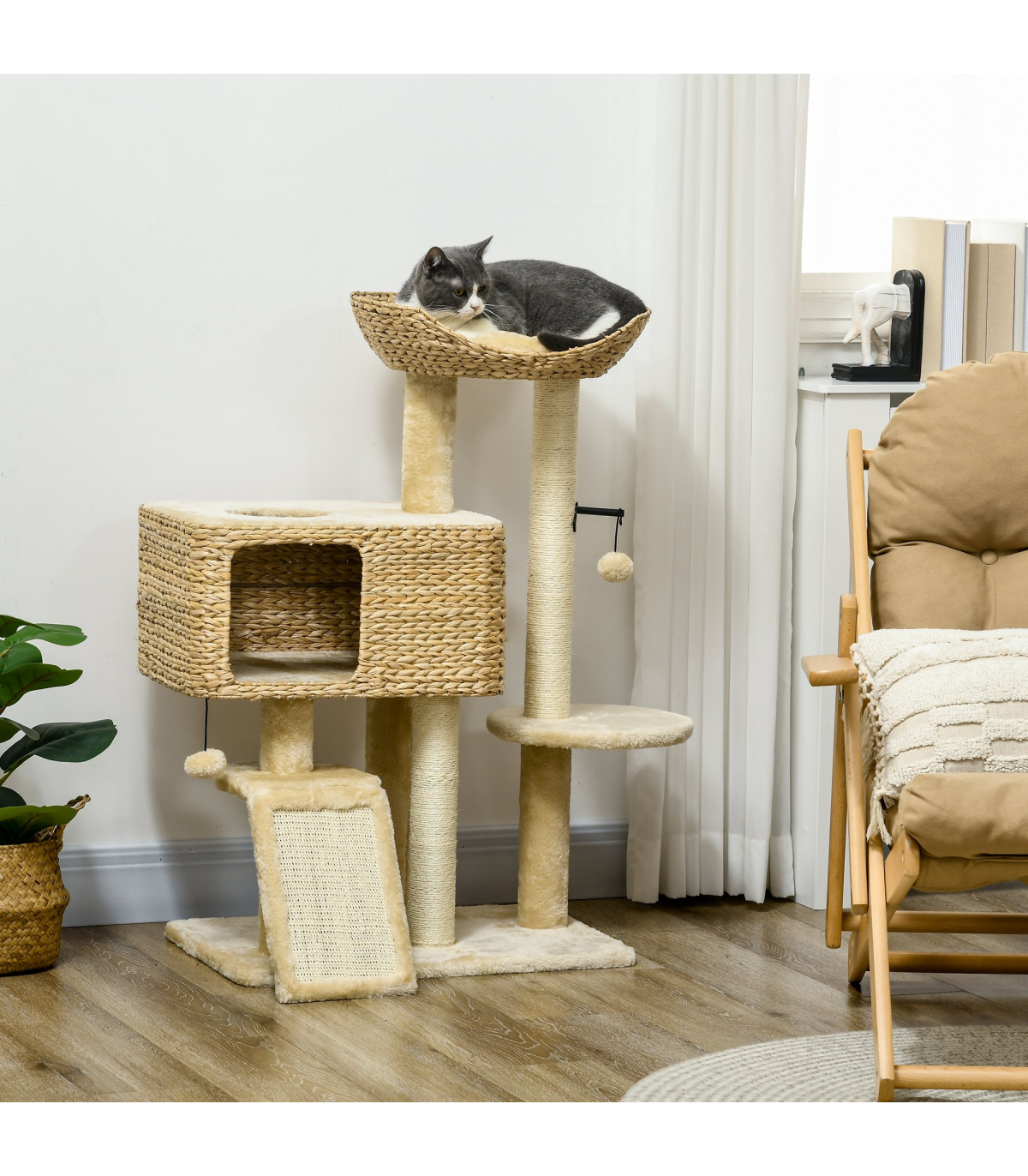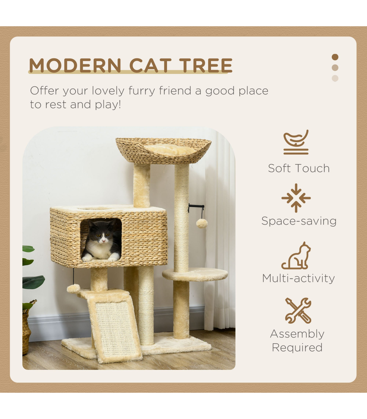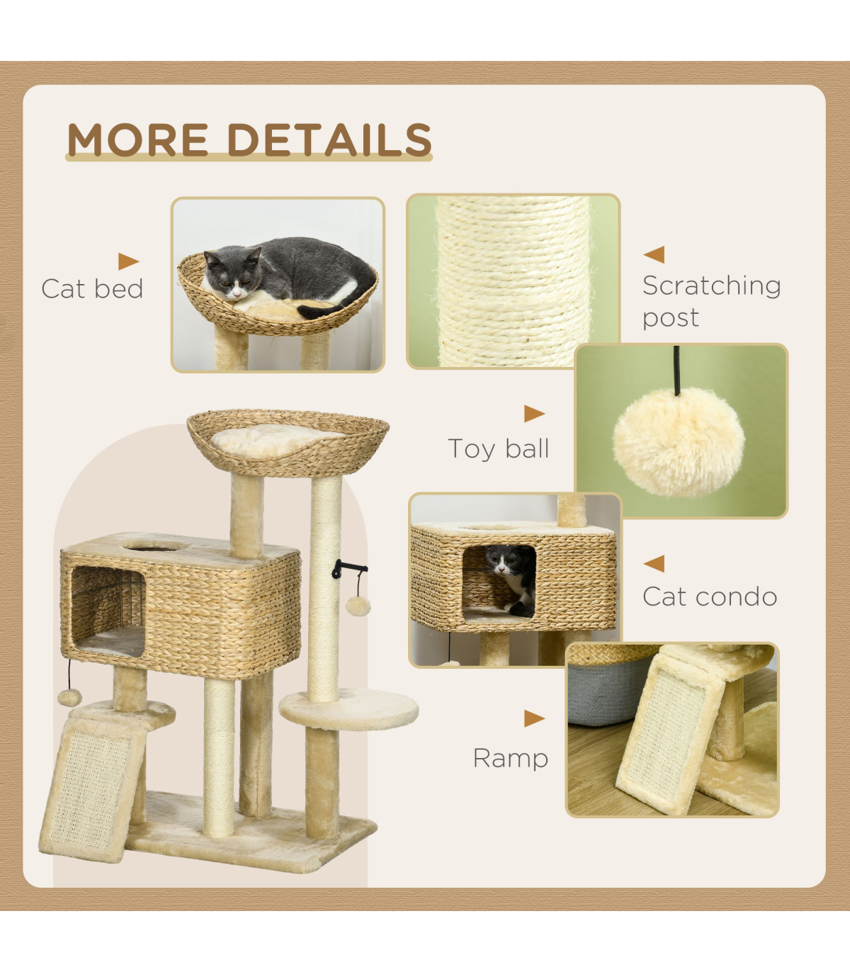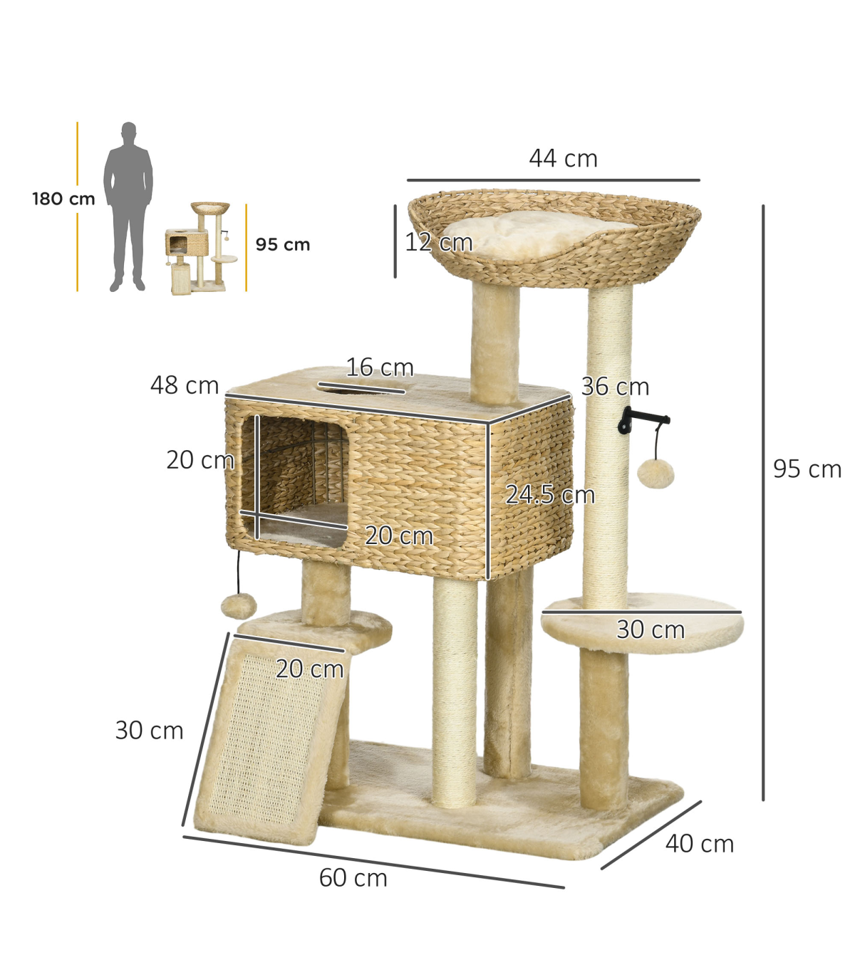 - Sisal rope posts satisfy their desire to scratch and claw, deterring them from destroying furniture - Cat house, bed and platform provide snug places to relax and nap - Made with particle board for stability - A multi-level cat tree for pets to jump and climb - A built-in anti-tipping device, which stops the cat tree from toppling over - Suitable for cats under 6kg - Assembly required- Colour: Brown and beige - MaterialParticle board, plush (100% polyester), sisal rope, PP cotton and bushels - Dimensions: 95H x 60W x 40Dcm, Cat house: 24.5H x 48W x 36Dcm. Cat house door: 20H x 20Wcm. Bed: 12H x 44L x 44Wcm. Platform: 20L x 20Wcm. Round platform: Dia30cm. Bottom board: 60W x 40Dcm. Ramp: 30L x 20Wcm - Weight capacity: 20kg. Platform: 10kg - Item label: D30-713V70BG