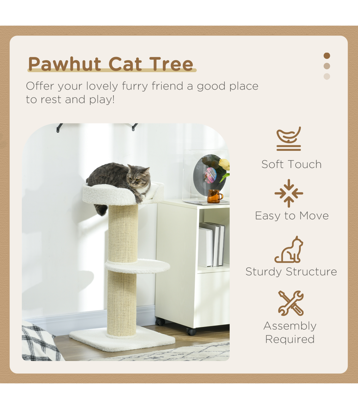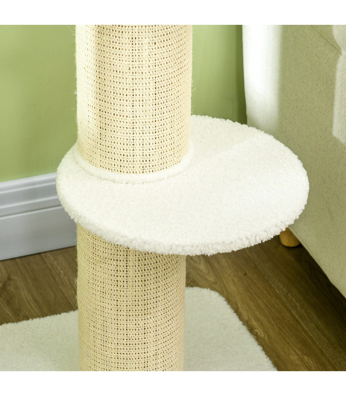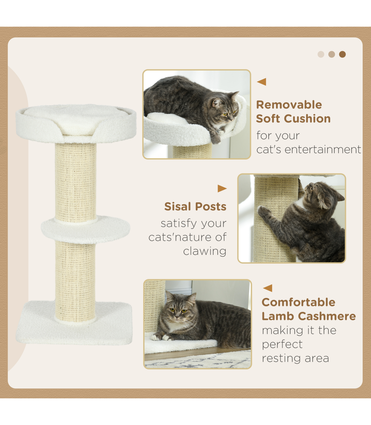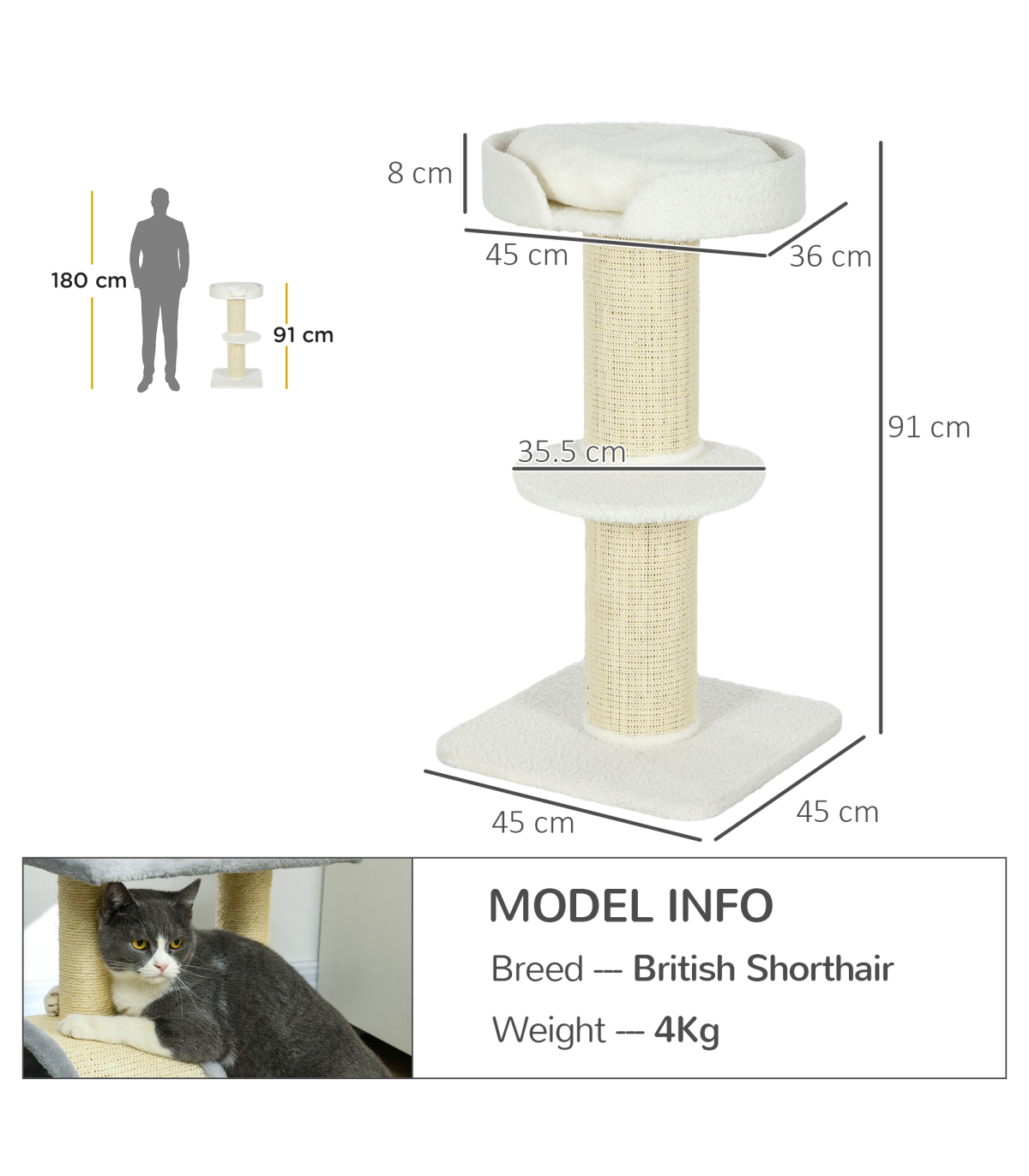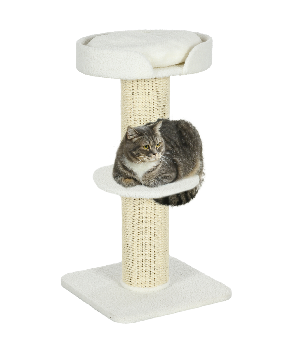 PawHut 2 Tier Cat Resting Tree with Top Basket Cushion Sisal Post - Cream White Description: - Thick and plush cushion on the top perch ensures a comfortable spot for them to sleep and relax - The spacious top sleeping area allows your cat to stretch out completely - Particle board frame for strength and durability, with a bottom base to keep it upright and stable - Central sisal cat scratcher so your cat can keep their claws sharp - Middle perch for them to jump up and down easily - Maximum weight: 30kg - Easy to assemble Specifications: - Item name: Cat Tree - Brand: PawHut - Colour: Cream White - Materials: Particle board, lamb cashmere, and sisal - Dimensions: - Overall: 91H x 45L x 45Wcm - Top basket: 8H x 45L x 36Wcm - Middle perch: diameter 35.5cm - Base: 45L x 45Wcm - Central pole: diameter 16.5cm - Weight capacity: 30kg - Net weight: 6kg - Custom label: D30-269V00CW