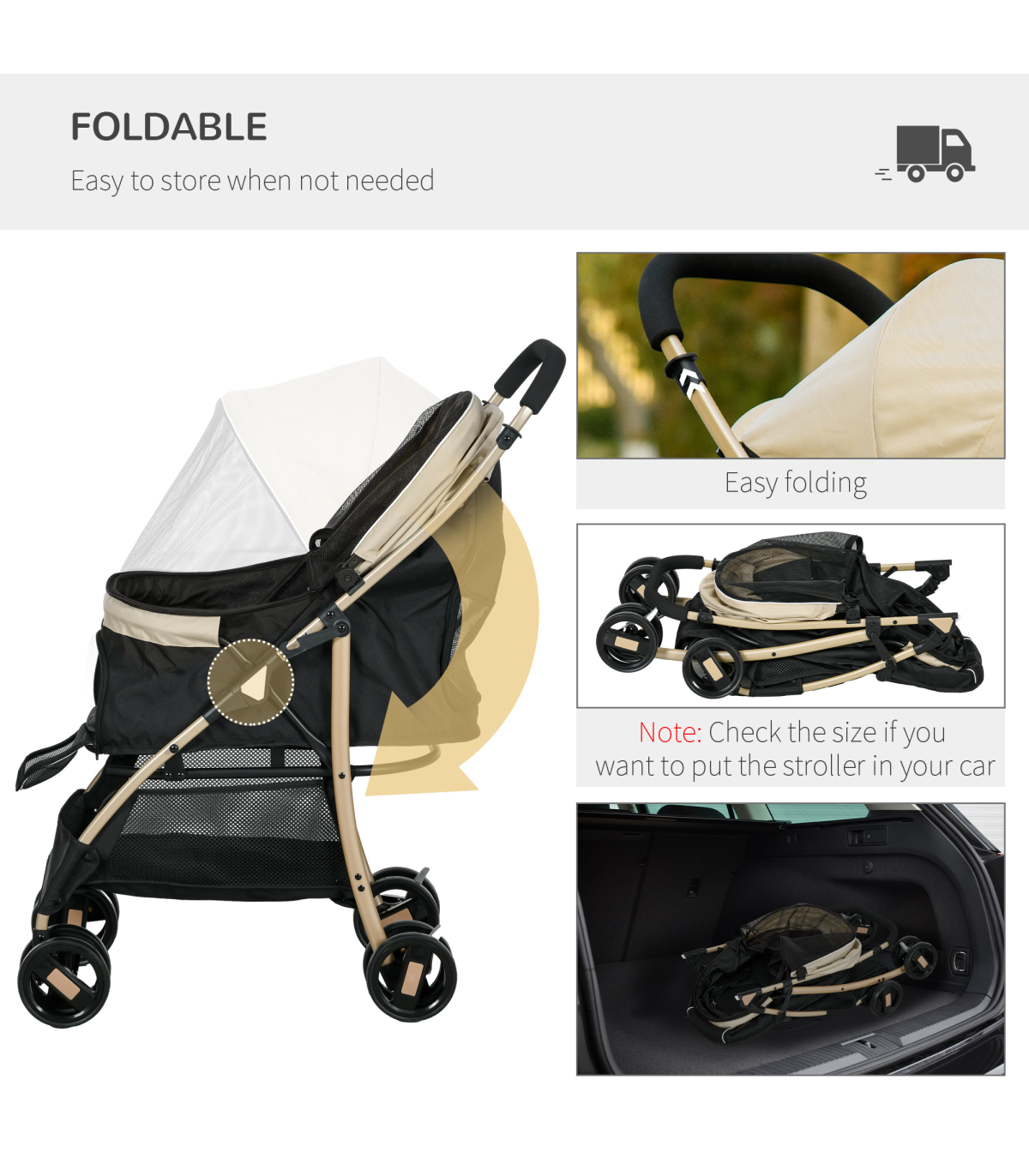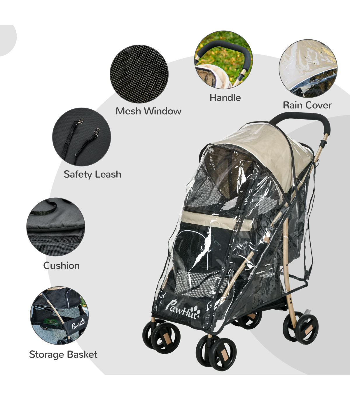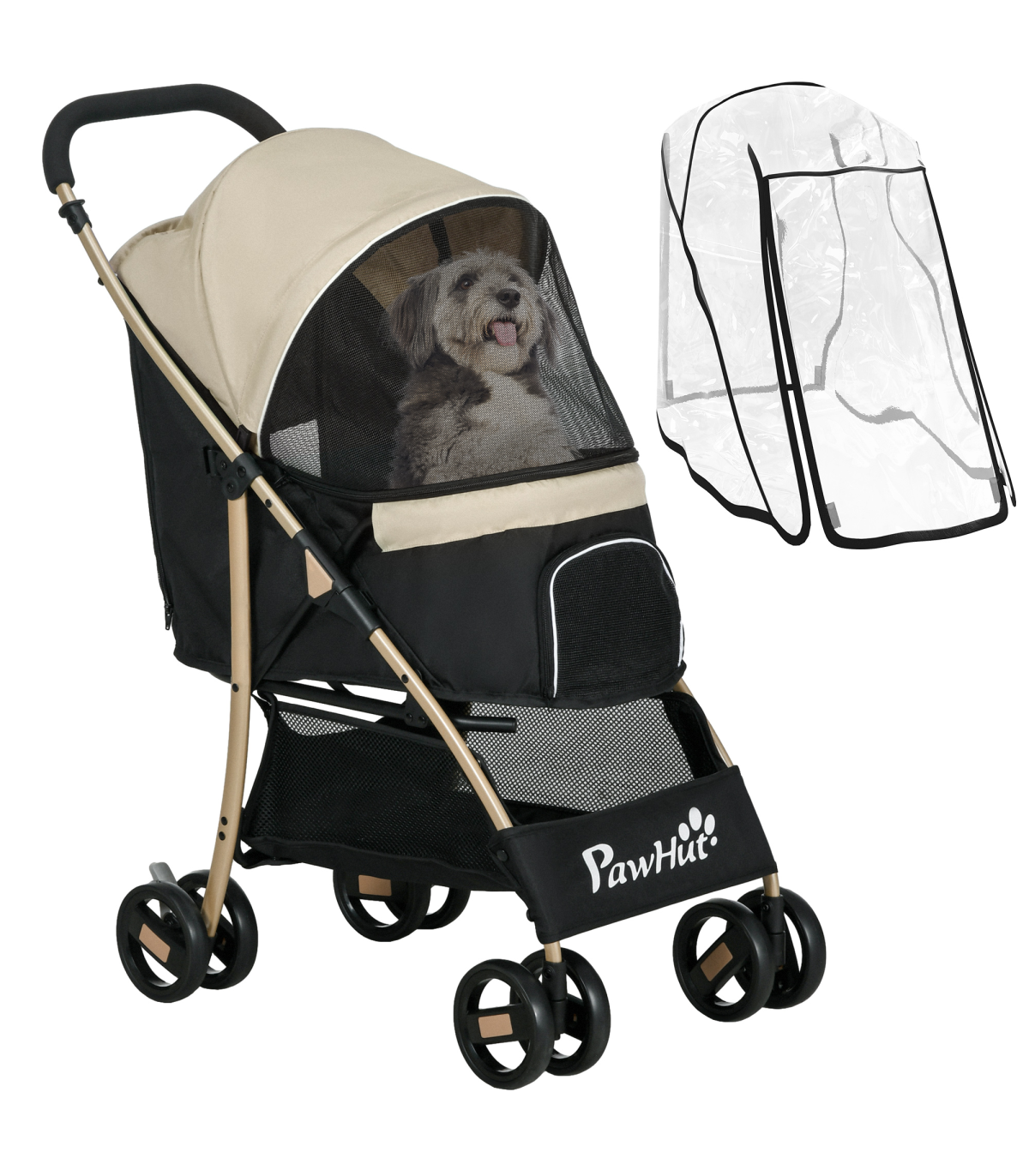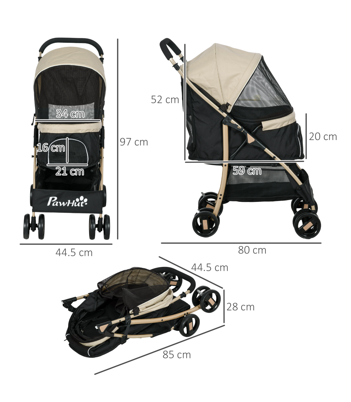 ? Dimensions: 97H x 80L x 44.5Wcm. Carrier: With/without canopy: 52/20H x 59L x 34Wcm. Folded: 28H x 85L x 44.5Wcm. Front window: 16H x 21Wcm. Bottom basket: 26H x 44L x 34Wcm. Cushion: 2.5D x 52L x 32Wcm. Rain cover: Front/rear: 75/65H x 60L x 38Wcm