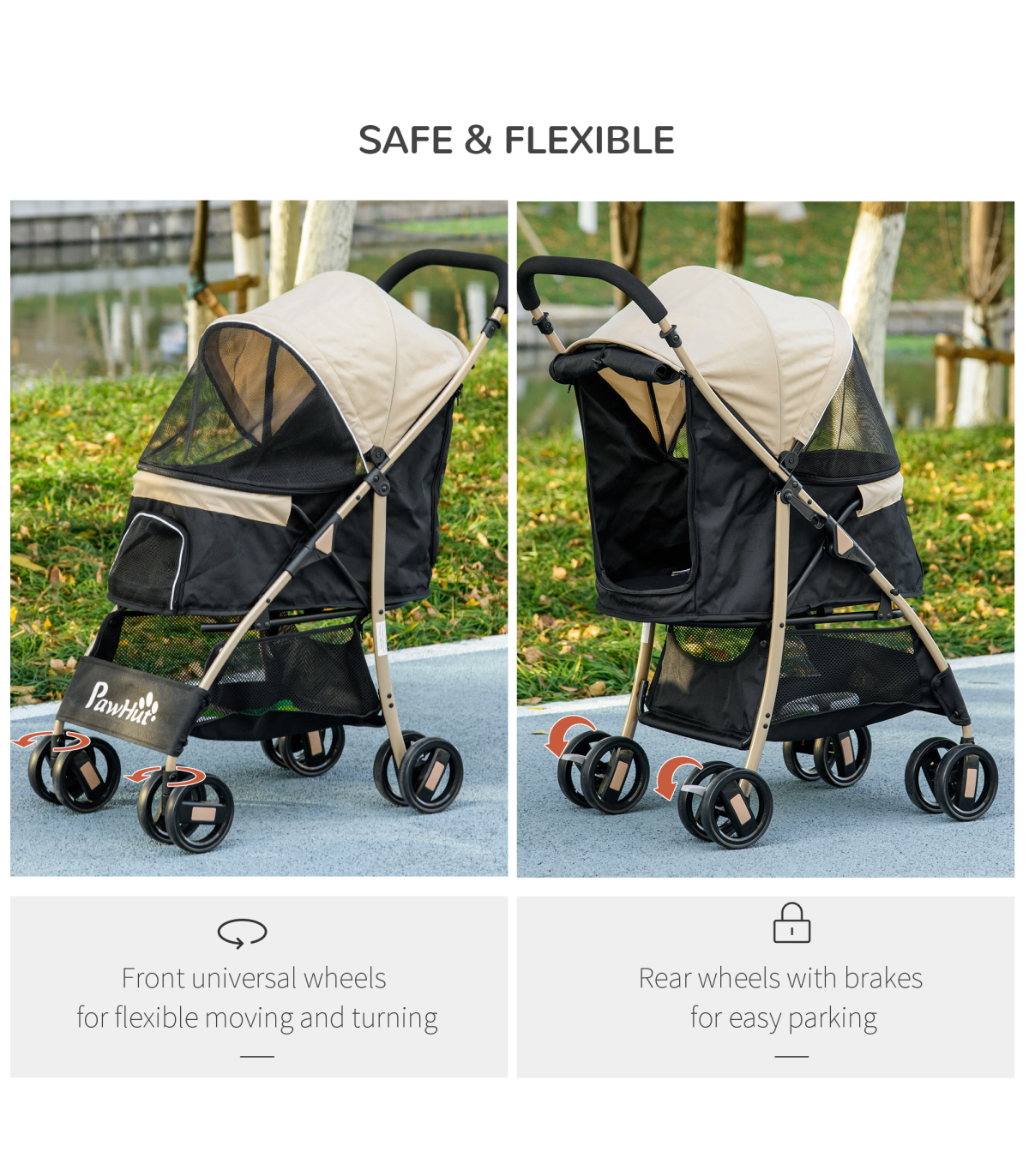 ? Four wheels and a handlebar to easily push. Two wheels have brakes and shock-absorption hardware