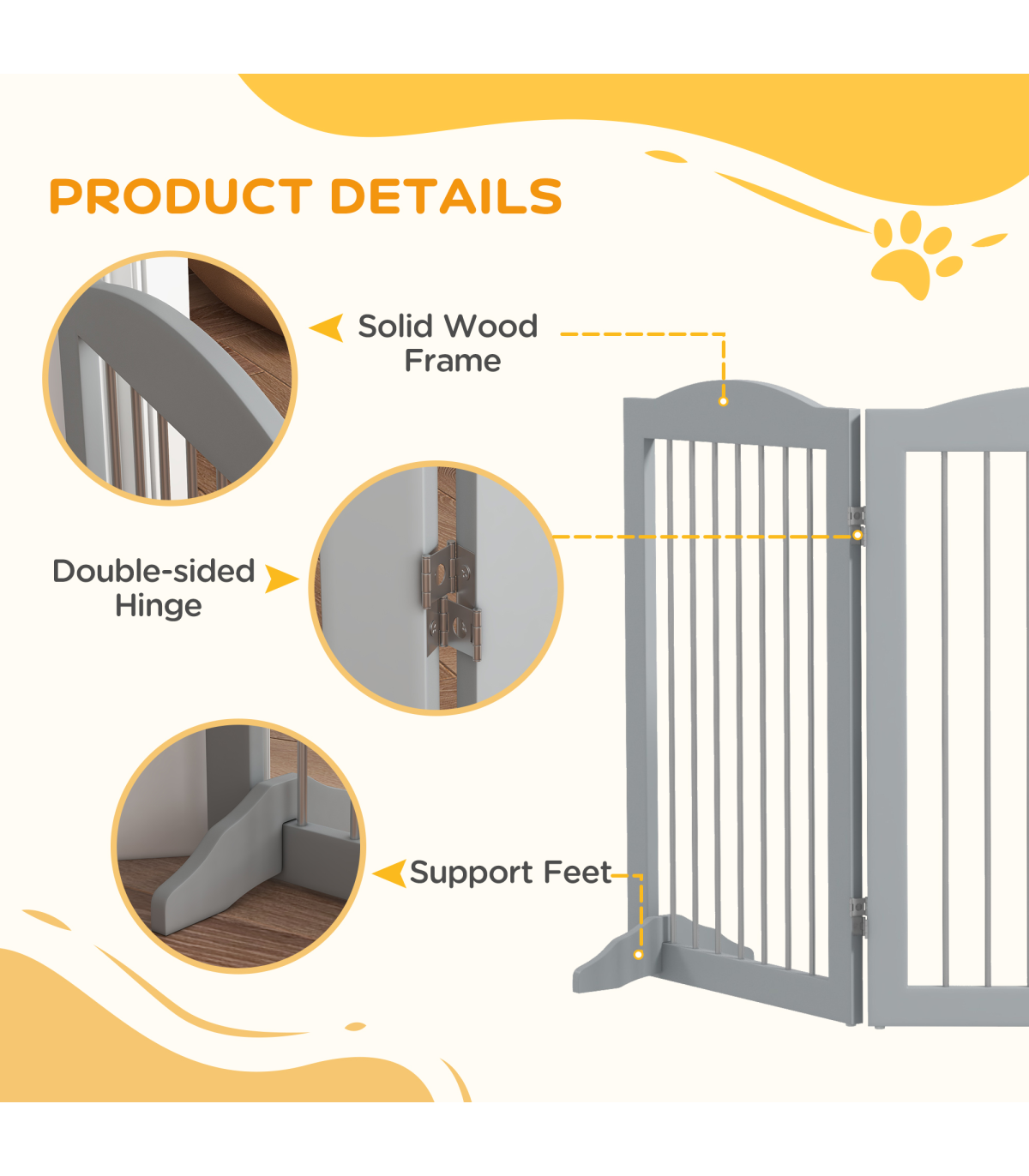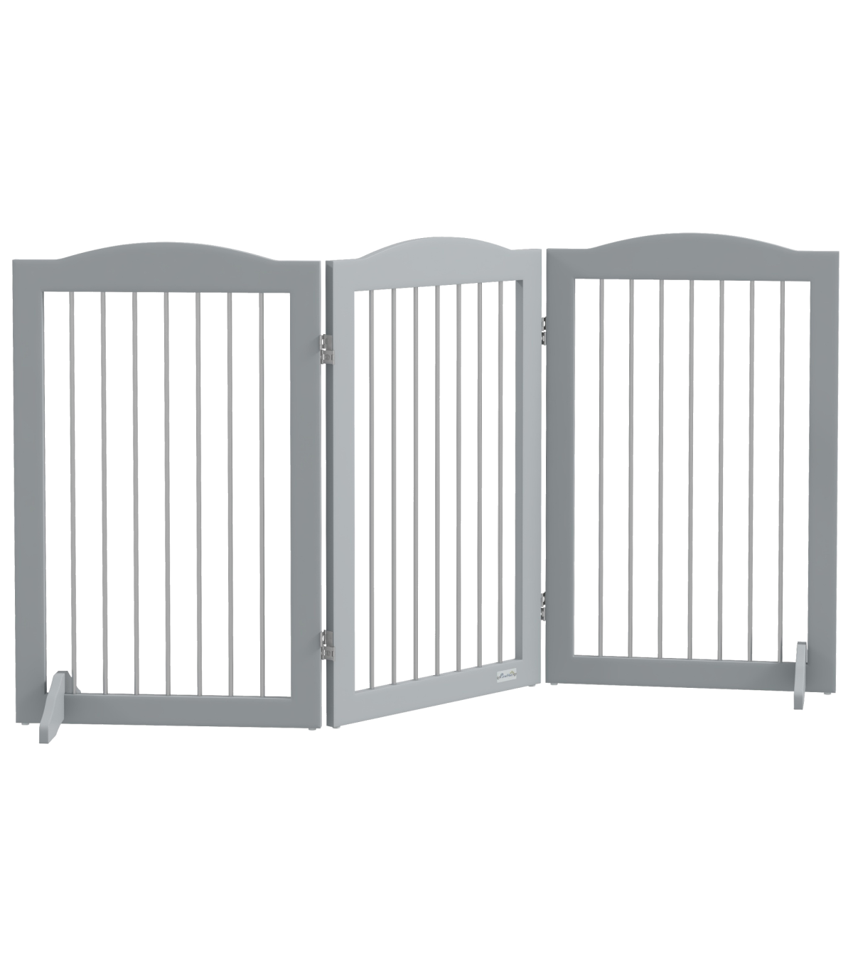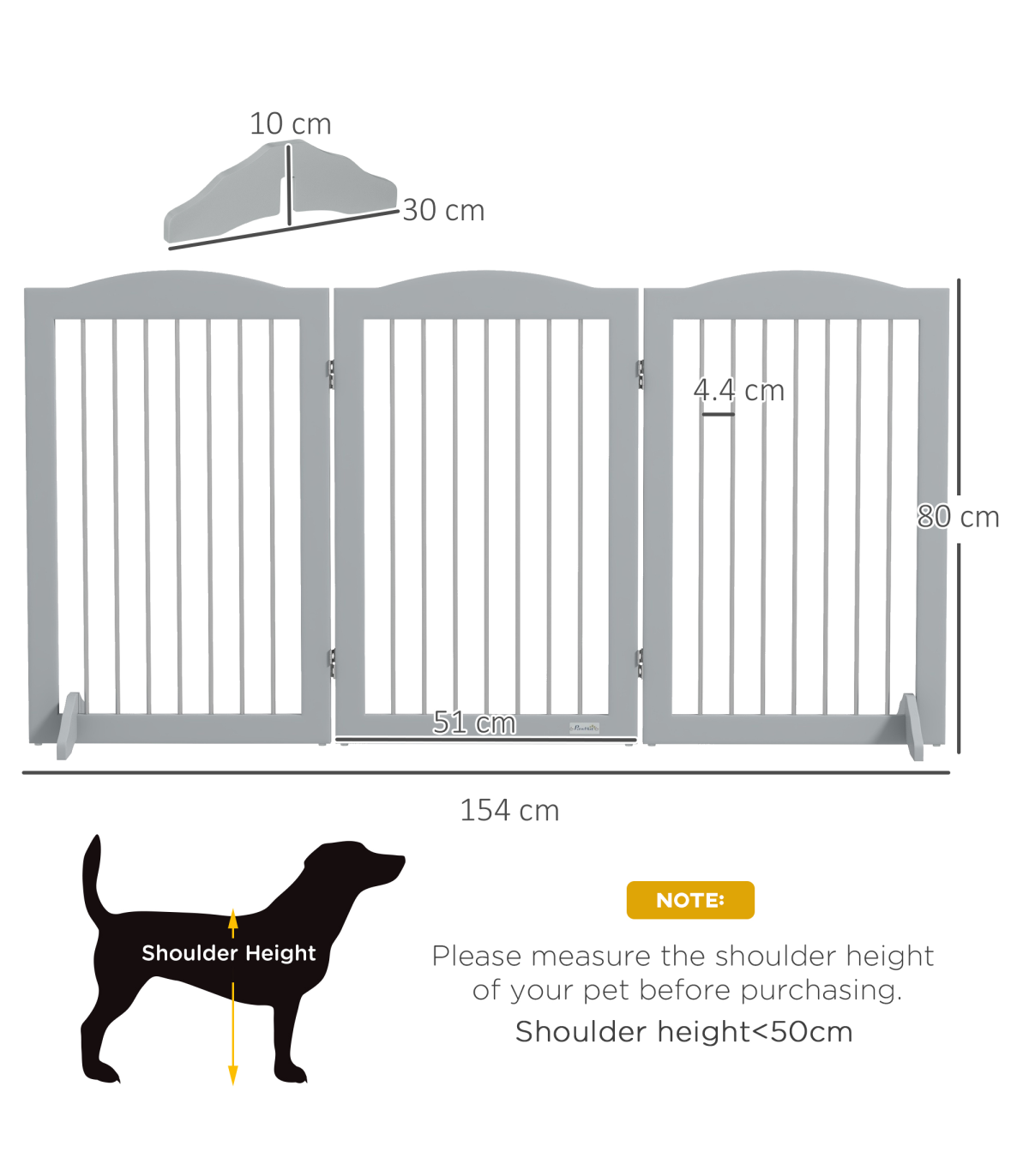 PawHut Foldable Dog Gate, Freestanding Pet Gate with Two Support Feet - Grey" Description: - Made of sturdy MDF - Consists of three plates and two support feet - Every panel has a 360-degree rotational range, allowing you to set up in different shapes - Suitable for doorways, entrances, hallways, bedrooms, and staircases - Completely folds up for convenient storage - Two support feet for extra stability - Lightweight for easy carrying - Suitable for medium dogs, up to 20kg and 50cm in shoulder height - Easy assembly required - Colour: Grey - Material: MDF and steel - Dimensions: - Maximum, with support feet: 80H x 154L x 30Wcm - Single piece: 80H x 51Lcm - Folded: 80H x 51L x 6.5Dcm - Support feet: 10H x 30L x 1.5Dcm - Item label: D06-168V00GY - Note: Not suitable for destructive dogs