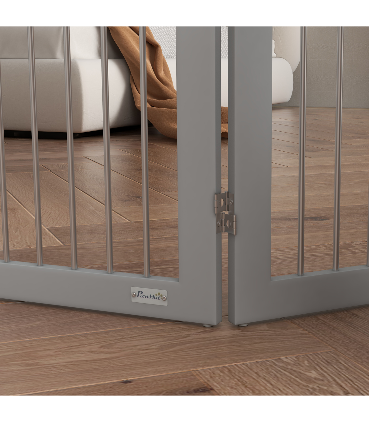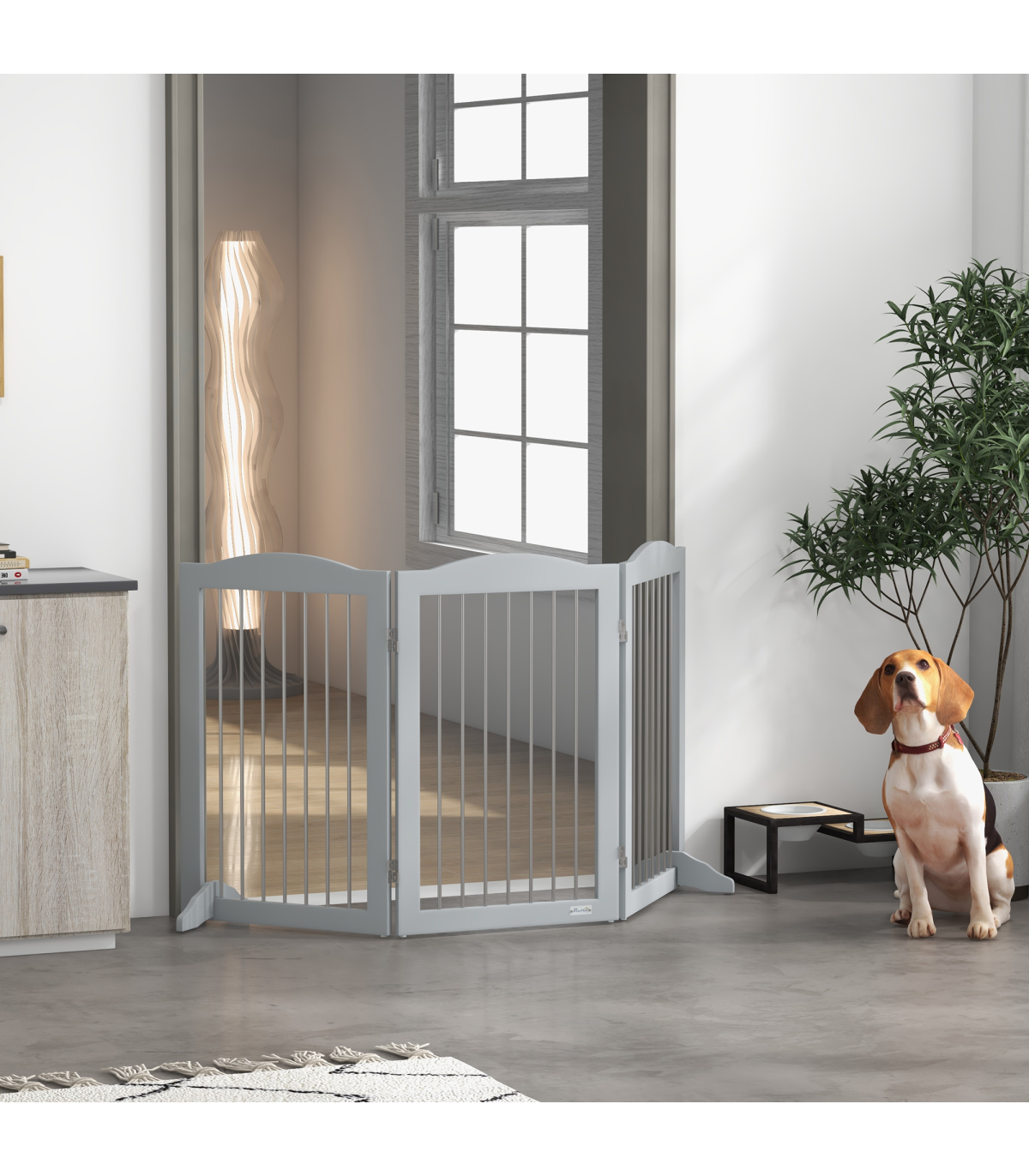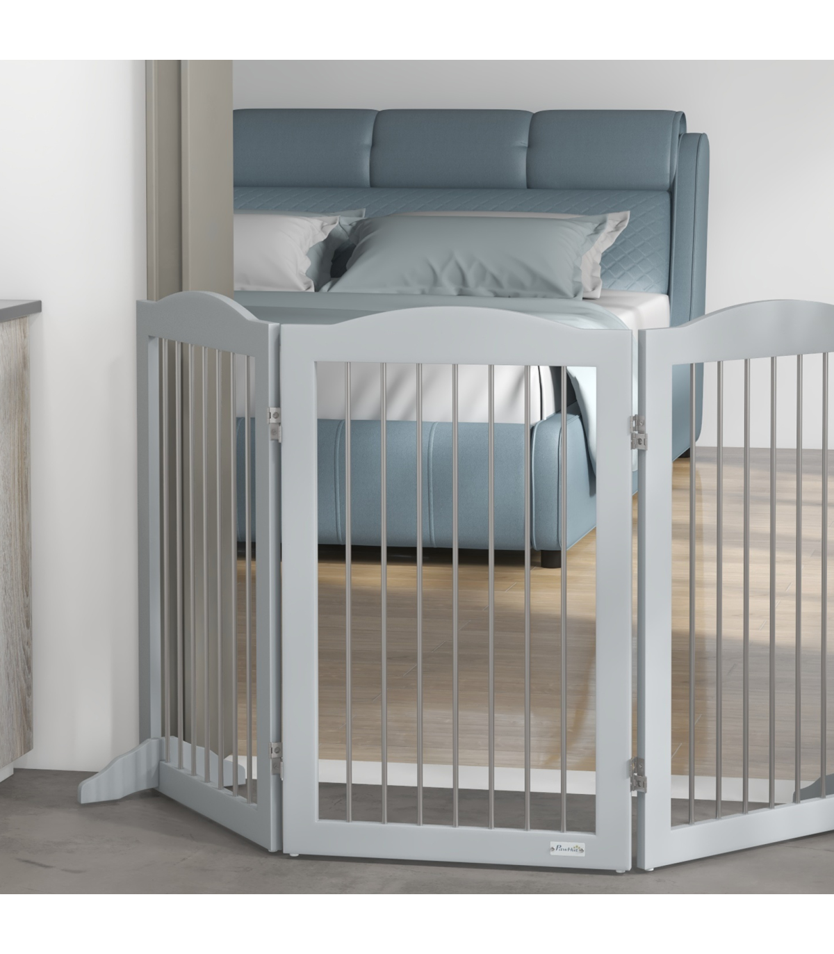 PawHut Foldable Dog Gate, Freestanding Pet Gate with Two Support Feet - Grey" Description: - Made of sturdy MDF - Consists of three plates and two support feet - Every panel has a 360-degree rotational range, allowing you to set up in different shapes - Suitable for doorways, entrances, hallways, bedrooms, and staircases - Completely folds up for convenient storage - Two support feet for extra stability - Lightweight for easy carrying - Suitable for medium dogs, up to 20kg and 50cm in shoulder height - Easy assembly required - Colour: Grey - Material: MDF and steel - Dimensions: - Maximum, with support feet: 80H x 154L x 30Wcm - Single piece: 80H x 51Lcm - Folded: 80H x 51L x 6.5Dcm - Support feet: 10H x 30L x 1.5Dcm - Item label: D06-168V00GY - Note: Not suitable for destructive dogs
