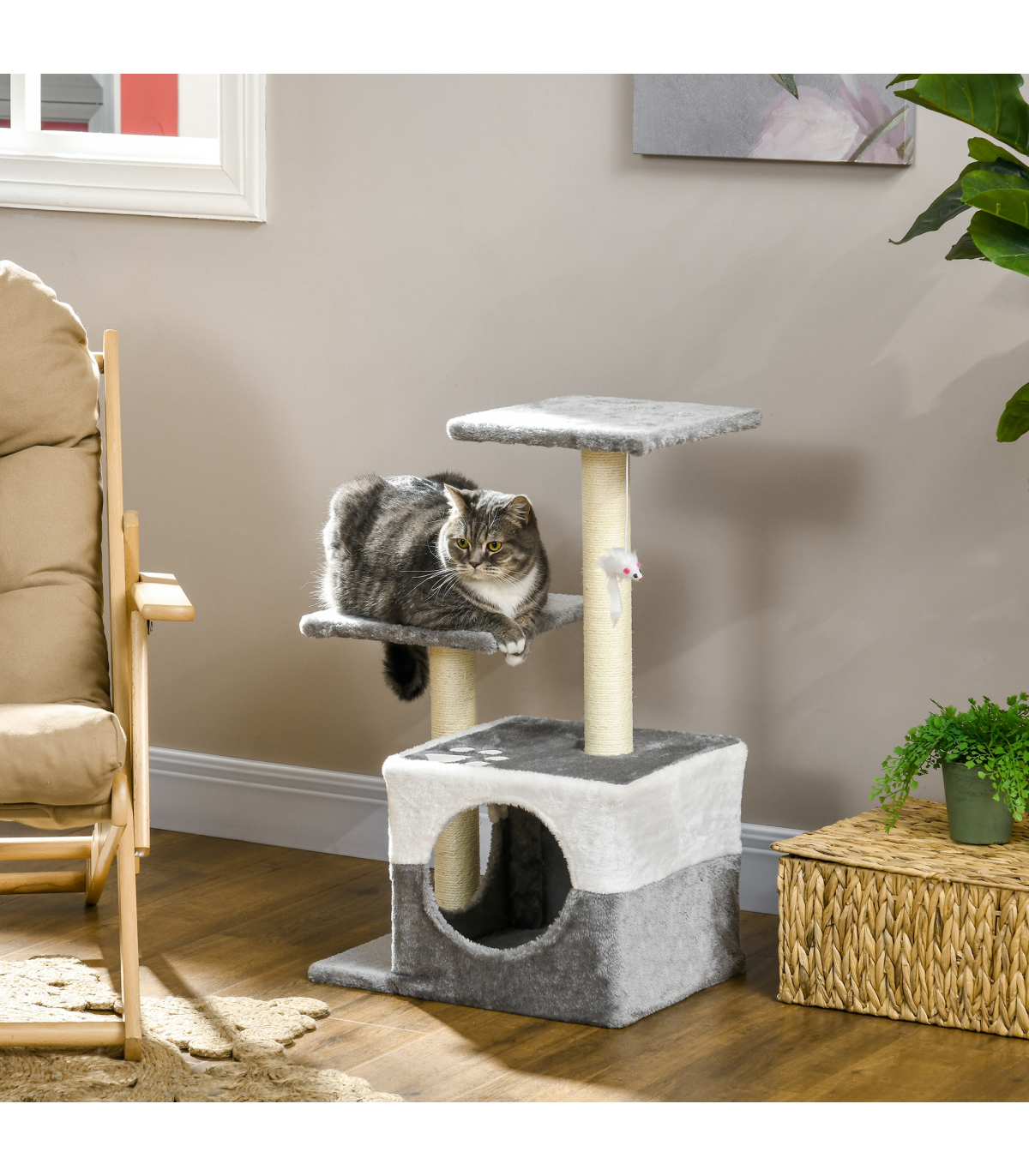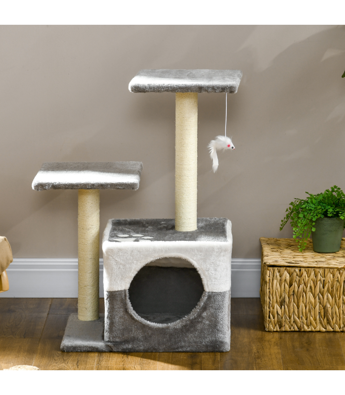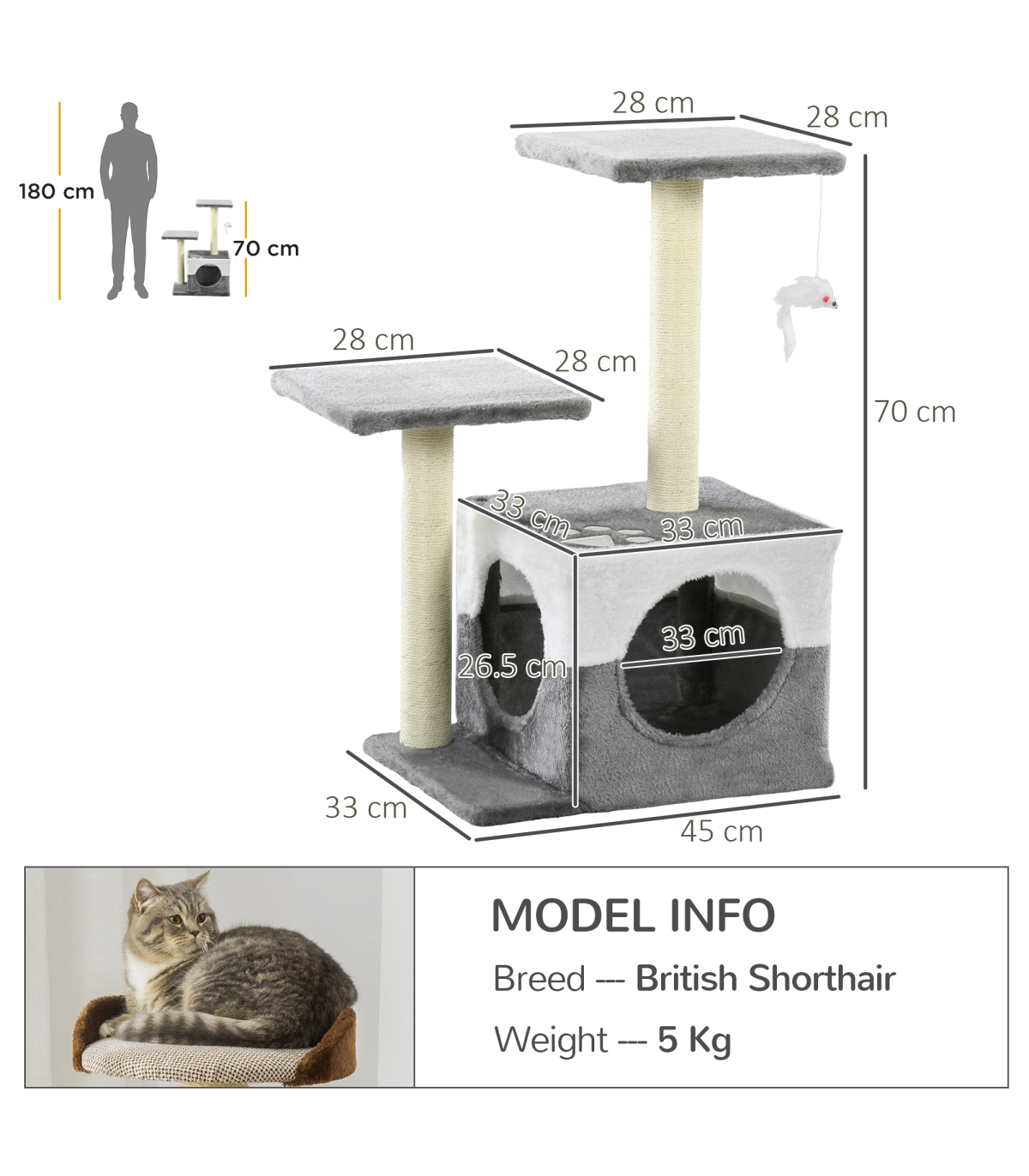 - "PawHut Cat Tree w/ Sisal Scratching Posts, House, Perches, Toy Mouse - Grey" - Description: - Includes two perches and a mini house, providing different resting areas - Sisal scratching post, letting your cats sharpen their claws - Toy mouse to play with, keeping them entertained - Particle board frame for strength and durability. Bottom base keeps it upright and stable. - Covered in soft plush fabric, keeping pets comfortable - Suitable for cats under 4kg - Assembly required - Colour: Grey - Material: Particleboard, Short Plush, Sisal - Overall Dimensions: 45L x 33W x 70H cm - Perch Dimensions: 28L x 28W x 1.2T cm - Condo Dimensions: 33L x 33W x 26.5H cm - Opening Size: 17 cm - Base Dimensions: 45L x 33W x 1.2T cm - Scratching Post Dimensions: 5.5 x 42H cm - Weight Capacity: 8 kg (each platform) - Item Label: D30-197V01GY