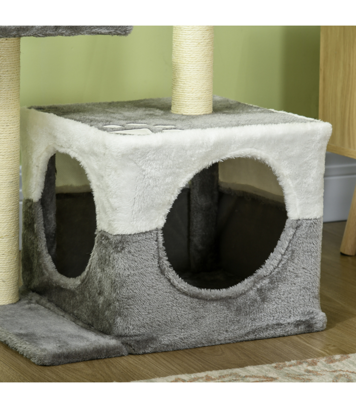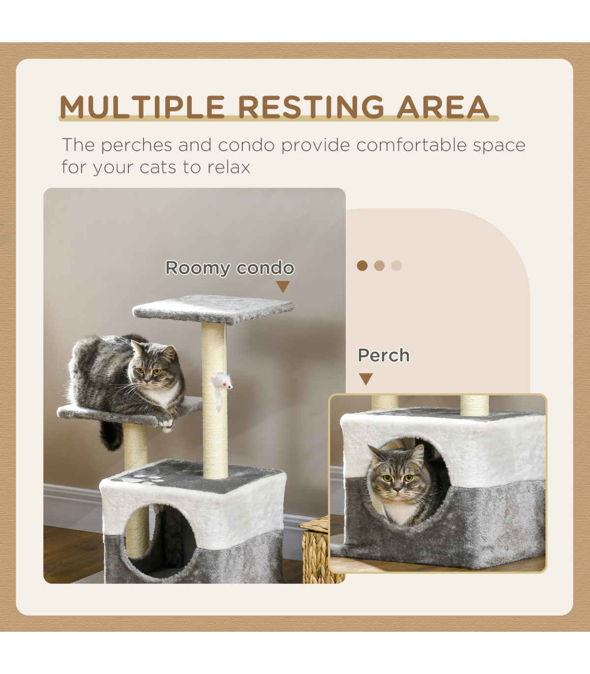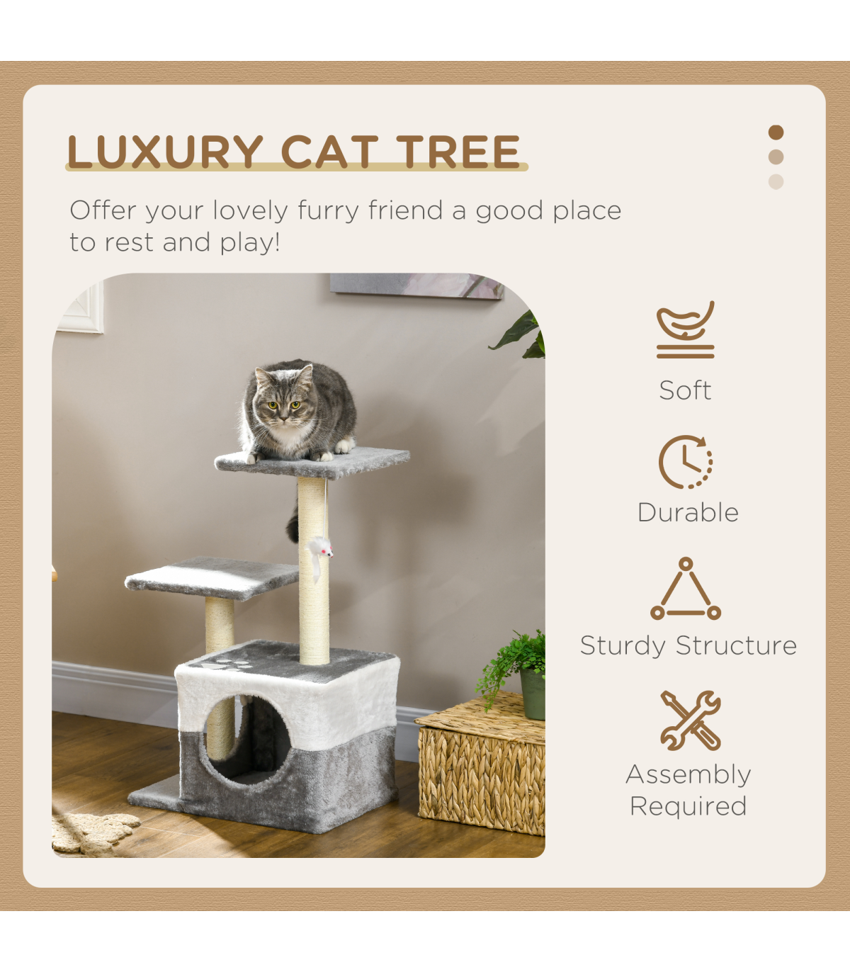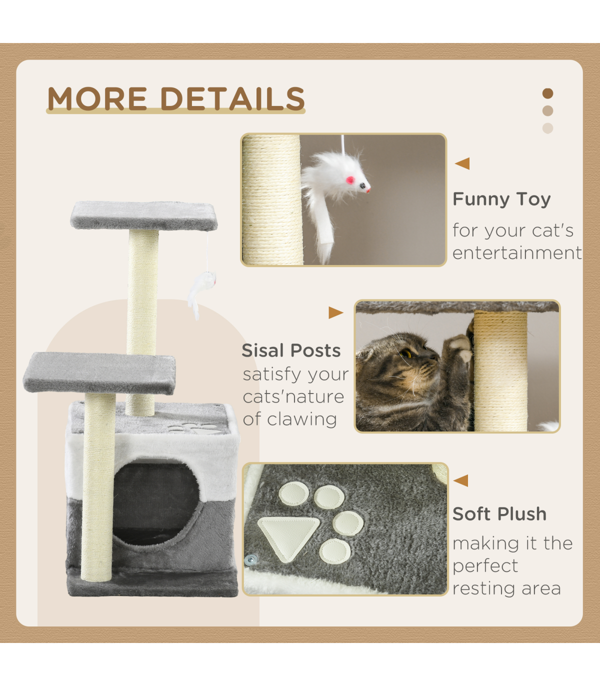 - "PawHut Cat Tree w/ Sisal Scratching Posts, House, Perches, Toy Mouse - Grey" - Description: - Includes two perches and a mini house, providing different resting areas - Sisal scratching post, letting your cats sharpen their claws - Toy mouse to play with, keeping them entertained - Particle board frame for strength and durability. Bottom base keeps it upright and stable. - Covered in soft plush fabric, keeping pets comfortable - Suitable for cats under 4kg - Assembly required - Colour: Grey - Material: Particleboard, Short Plush, Sisal - Overall Dimensions: 45L x 33W x 70H cm - Perch Dimensions: 28L x 28W x 1.2T cm - Condo Dimensions: 33L x 33W x 26.5H cm - Opening Size: 17 cm - Base Dimensions: 45L x 33W x 1.2T cm - Scratching Post Dimensions: 5.5 x 42H cm - Weight Capacity: 8 kg (each platform) - Item Label: D30-197V01GY