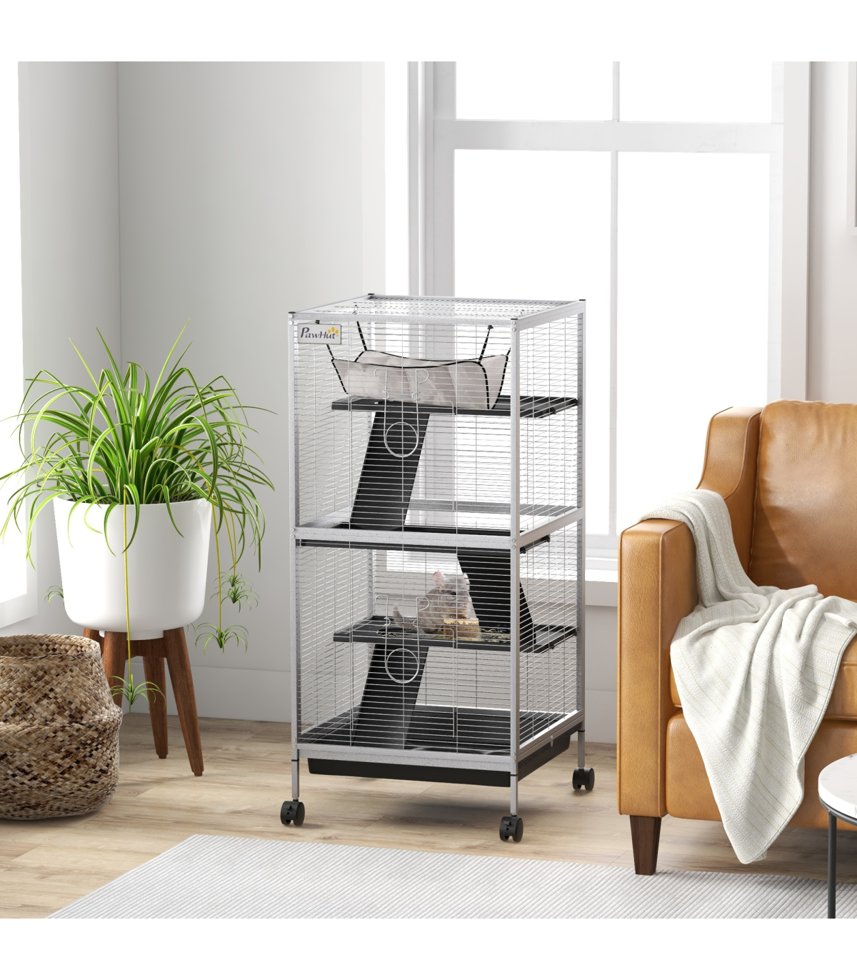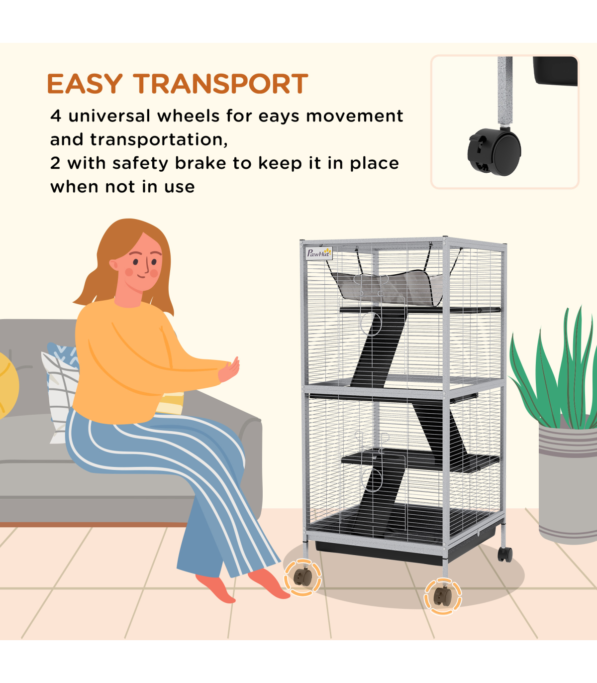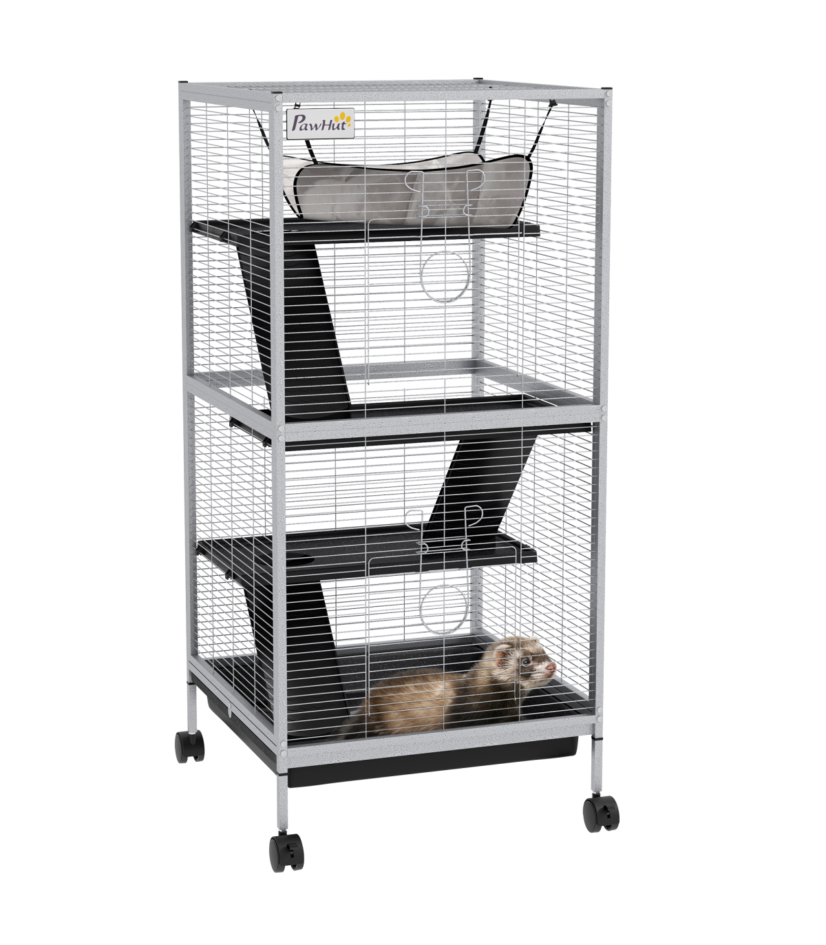 Pets love to roam and explore � with this spacious PawHut animal cage, they'll enjoy a roomy and secure home. Four levels, connected by ramps, so pets can run around freely. To relax, they'll lay on the snug hammock at the top. Resting on four wheels, the cage can move around, whilst the multiple doors give easy access inside. There's a tray at the bottom for catching litter, which is removable for effortless cleaning, keeping their space tidy. A stable home for small pets to thrive.