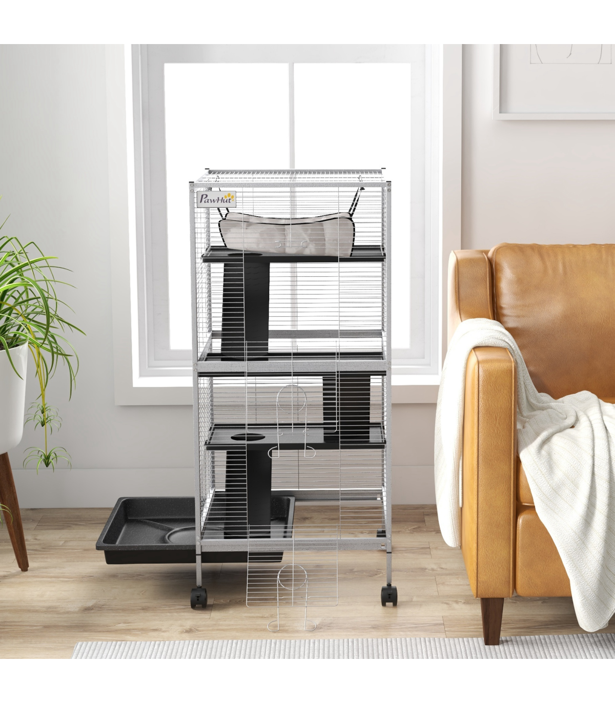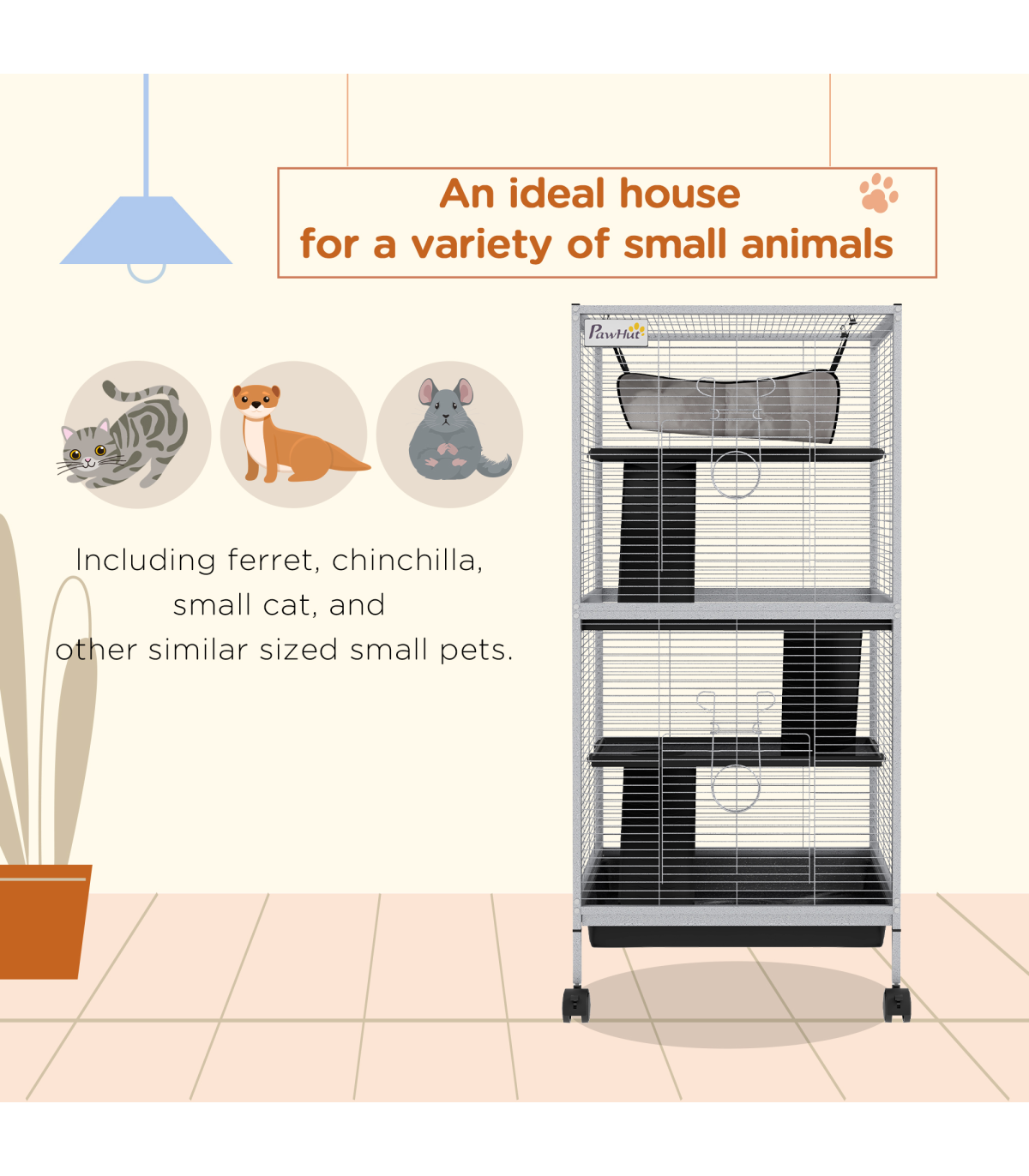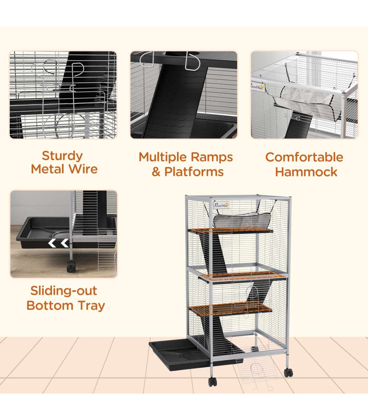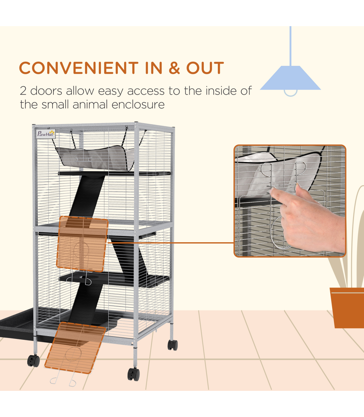 Pets love to roam and explore � with this spacious PawHut animal cage, they'll enjoy a roomy and secure home. Four levels, connected by ramps, so pets can run around freely. To relax, they'll lay on the snug hammock at the top. Resting on four wheels, the cage can move around, whilst the multiple doors give easy access inside. There's a tray at the bottom for catching litter, which is removable for effortless cleaning, keeping their space tidy. A stable home for small pets to thrive.