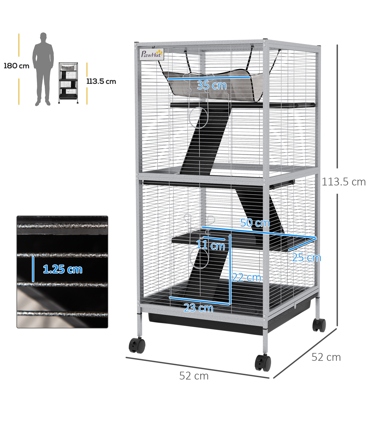- "PawHut Rolling Small Animal Cage for Chinchillas, Ferrets, Kittens with Ramp in Grey" - Description: - Good for small animals like ferrets and chinchillas - Includes a hammock for added comfort - Each platform has round holes to connect the ramps - Multiple doors for easy access - Features a removable bottom tray for easy cleaning and litter containment - Three ramps and four platforms provide a spacious cage for pets to roam - Spaced bars ensure proper ventilation - Rolling wheels at the bottom for easy movement; two wheels can be locked to keep the cage in place - Assembly required - Color: Light Grey - Material: Metal, PP, and Nylon - Dimensions: - Overall: 113.5H x 52L x 52Wcm - Door: 22H x 23Wcm - Platform: 50L x 25Wcm - Ramp: - Big: 40L x 13Wcm - Small: 32L x 13Wcm - Removable tray: 6H x 52L x 49Wcm - Item label: D51-153V00LG - Note: Not suitable for hamsters