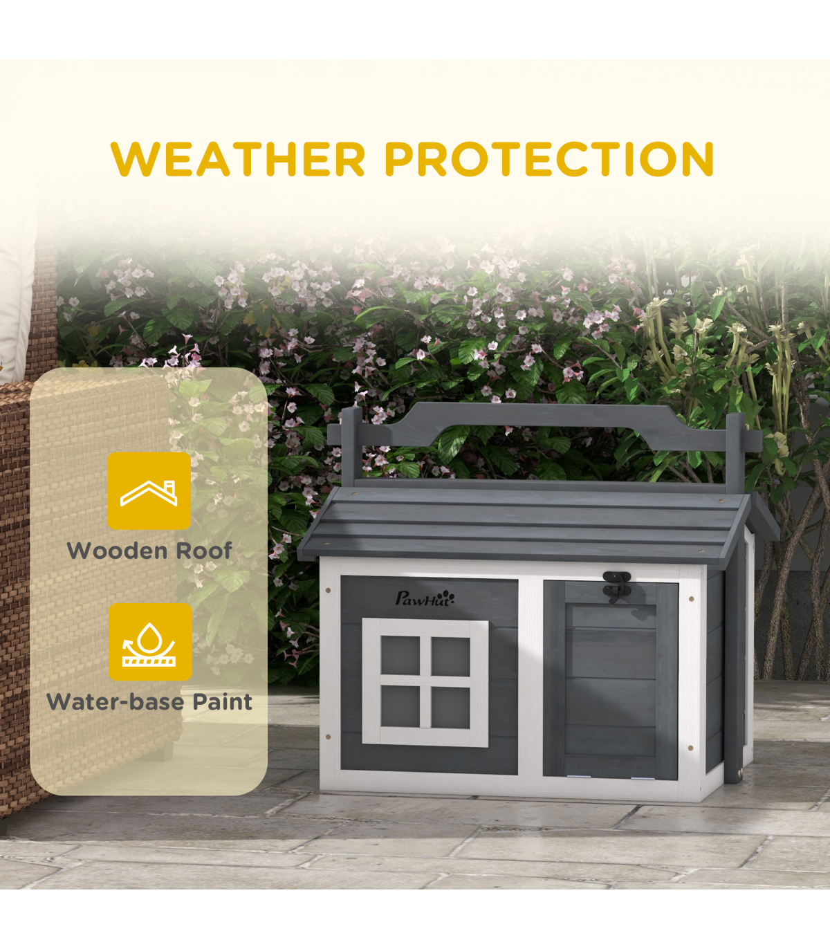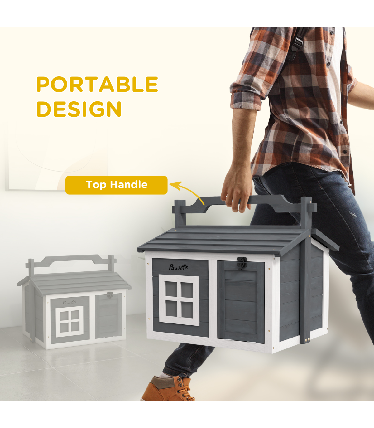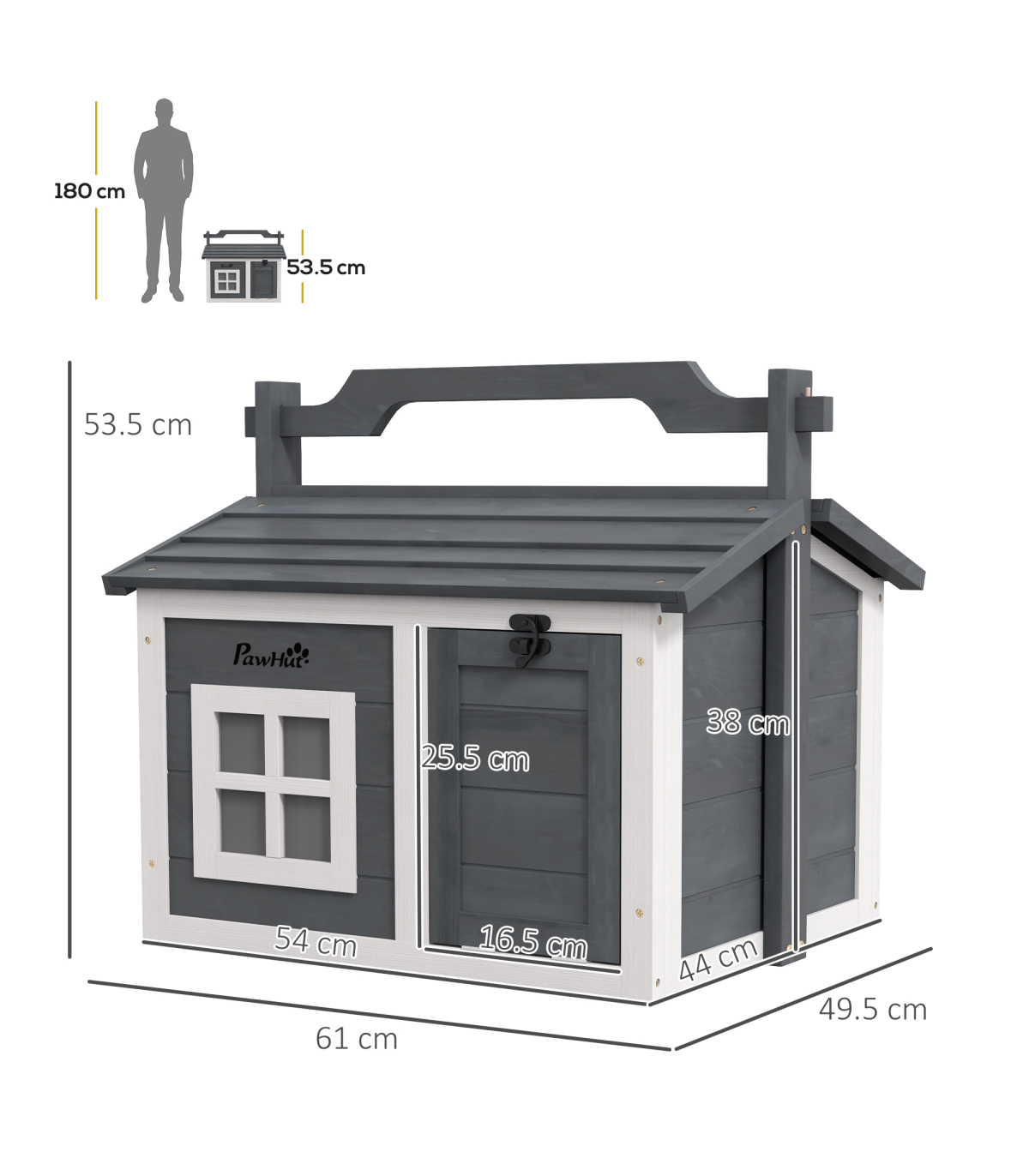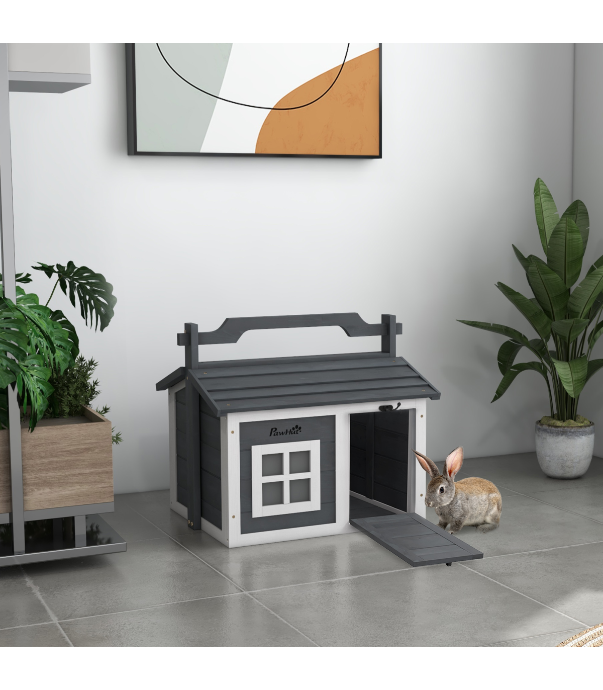 - "PawHut Rabbit Hutch Indoor Outdoor w/ Top Handle, Openable Roof - Grey" - Description: - Two main rooms with a middle panel, providing a comfortable amount of shade - An openable top and front entrance for easy access - Water-resistant paint and wooden roof – suitable for outdoors - Includes a window to watch pets inside - Can be used indoors or outdoors - Suitable for a rabbit - Assembly required - Colour: White and light grey - Material: Fir wood - Dimensions: - With handle: 53.5H x 61L x 49.5Wcm - Overall floor area: 0.22m² - Main house: 38H x 54W x 44Dcm - Window: 15.5H x 15.5Wcm - Middle entrance: 20H x 17Wcm - Item label: D51-412V00GY