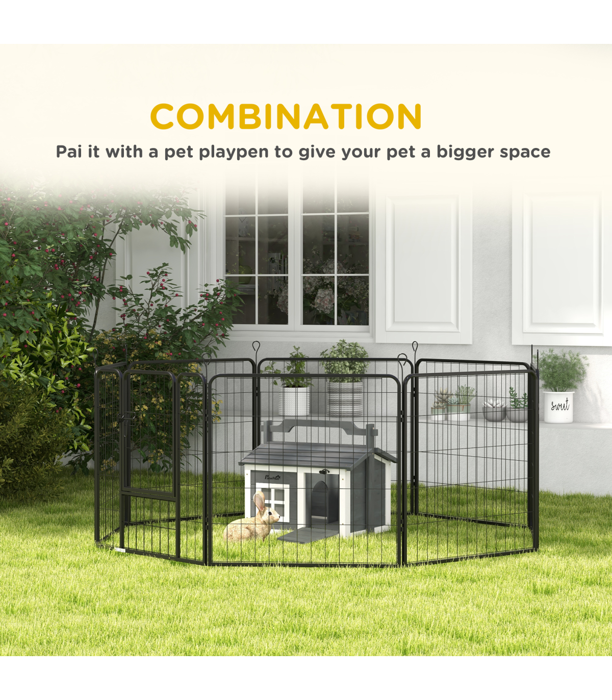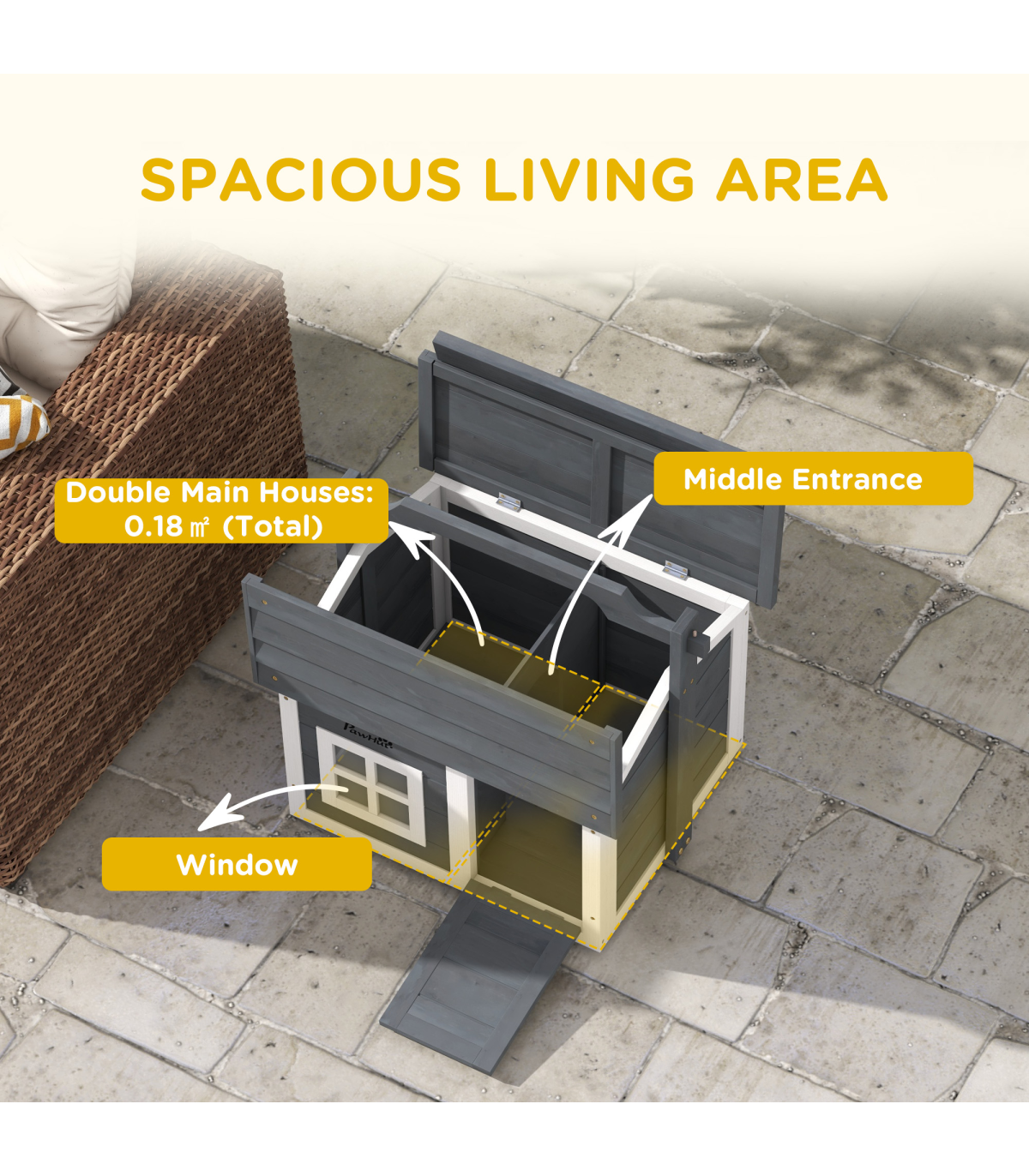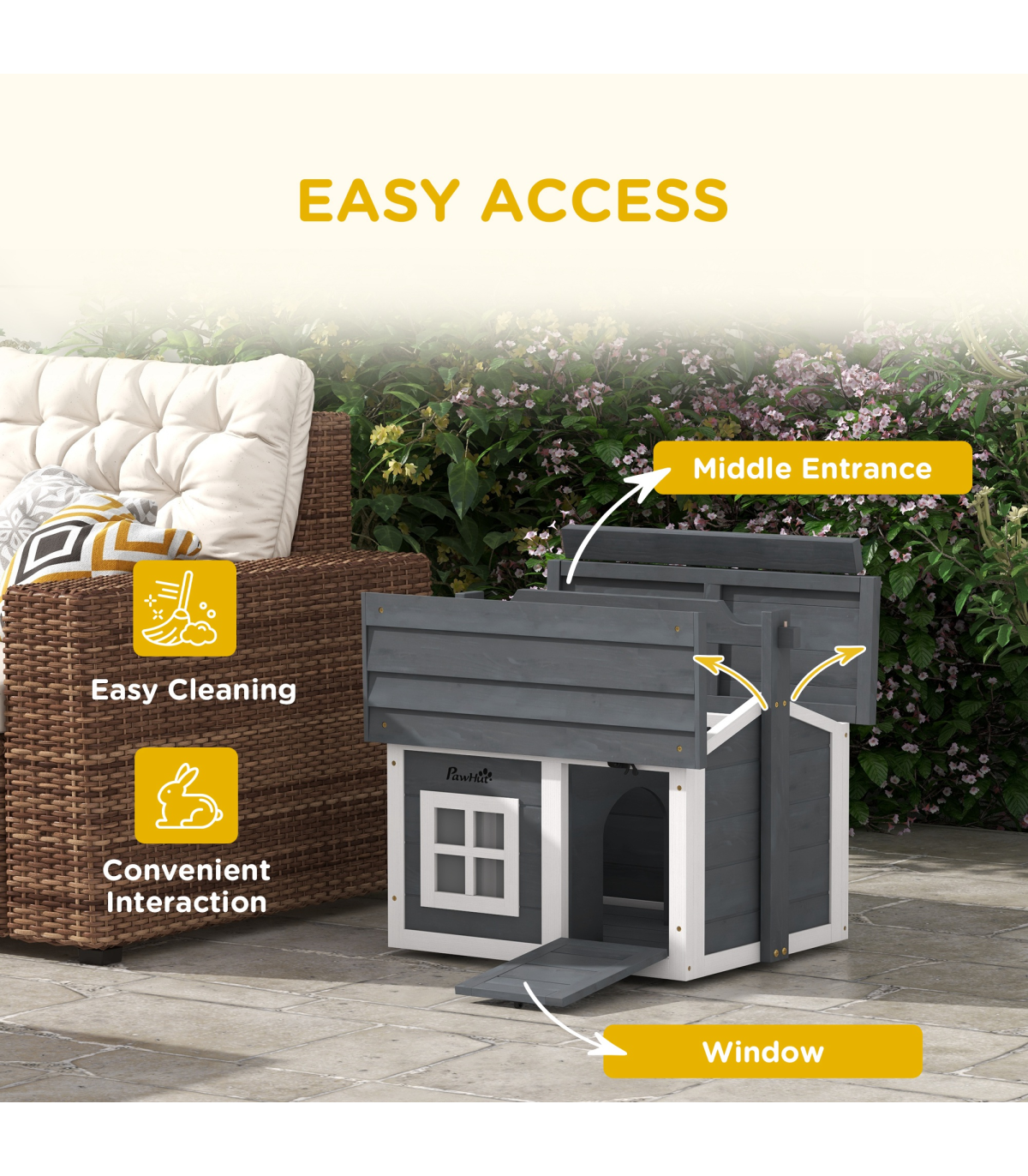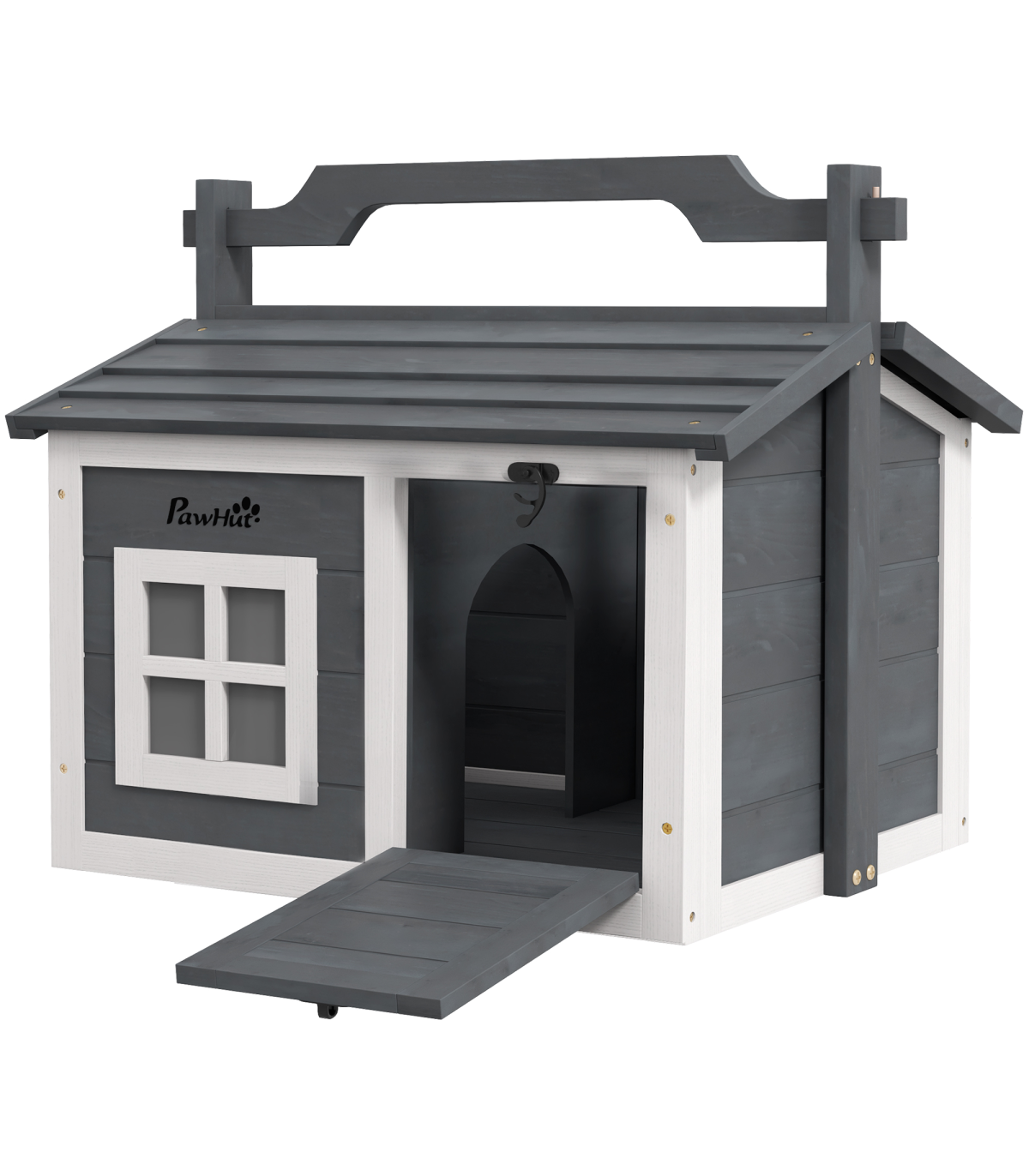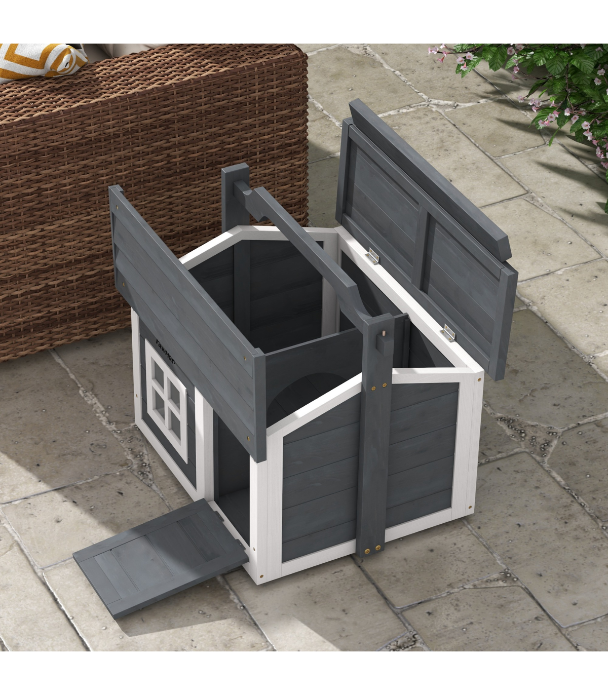 - "PawHut Rabbit Hutch Indoor Outdoor w/ Top Handle, Openable Roof - Grey" - Description: - Two main rooms with a middle panel, providing a comfortable amount of shade - An openable top and front entrance for easy access - Water-resistant paint and wooden roof – suitable for outdoors - Includes a window to watch pets inside - Can be used indoors or outdoors - Suitable for a rabbit - Assembly required - Colour: White and light grey - Material: Fir wood - Dimensions: - With handle: 53.5H x 61L x 49.5Wcm - Overall floor area: 0.22m² - Main house: 38H x 54W x 44Dcm - Window: 15.5H x 15.5Wcm - Middle entrance: 20H x 17Wcm - Item label: D51-412V00GY
