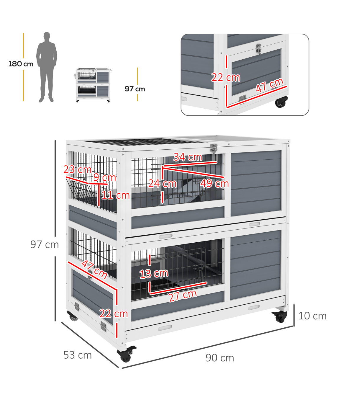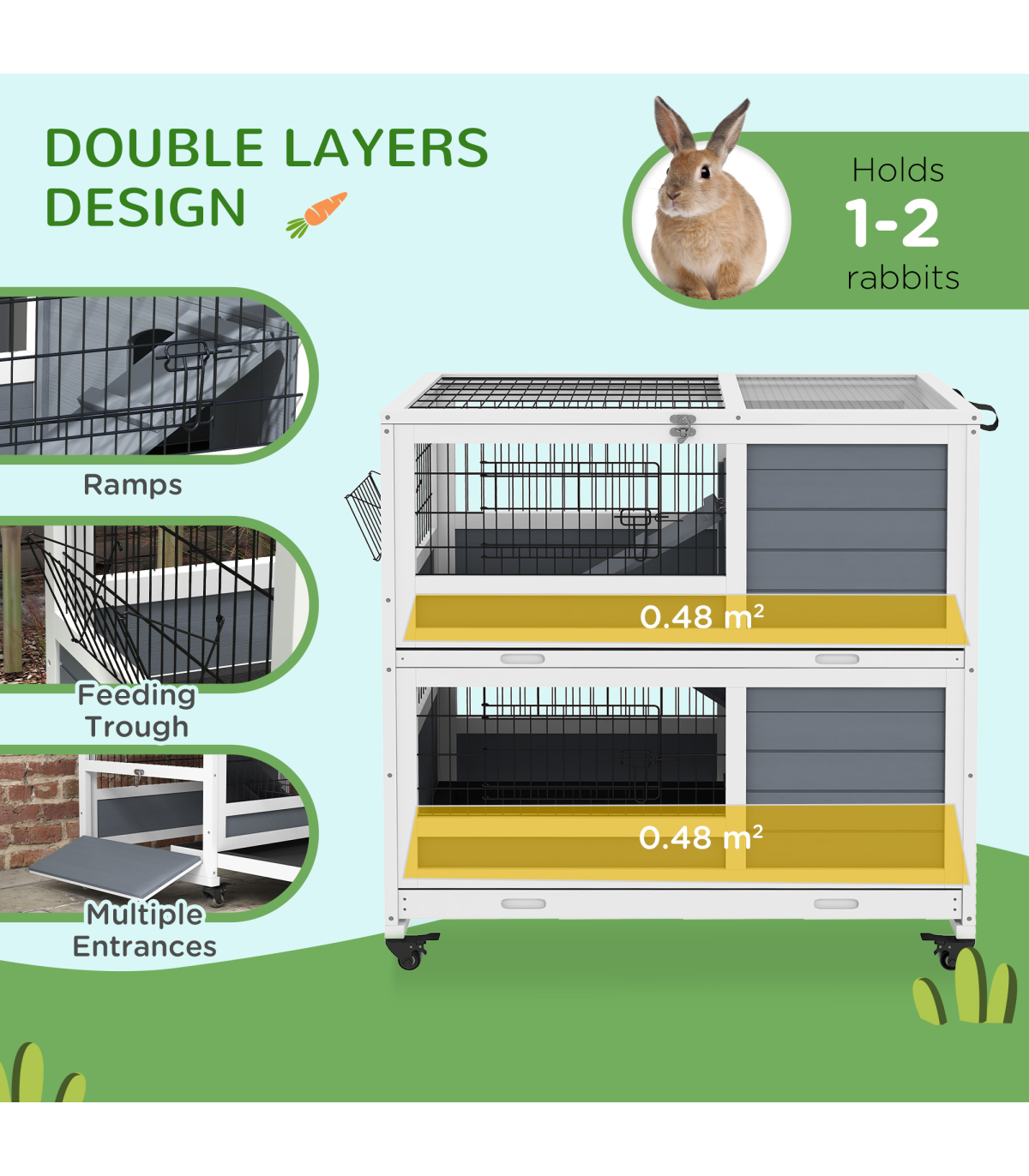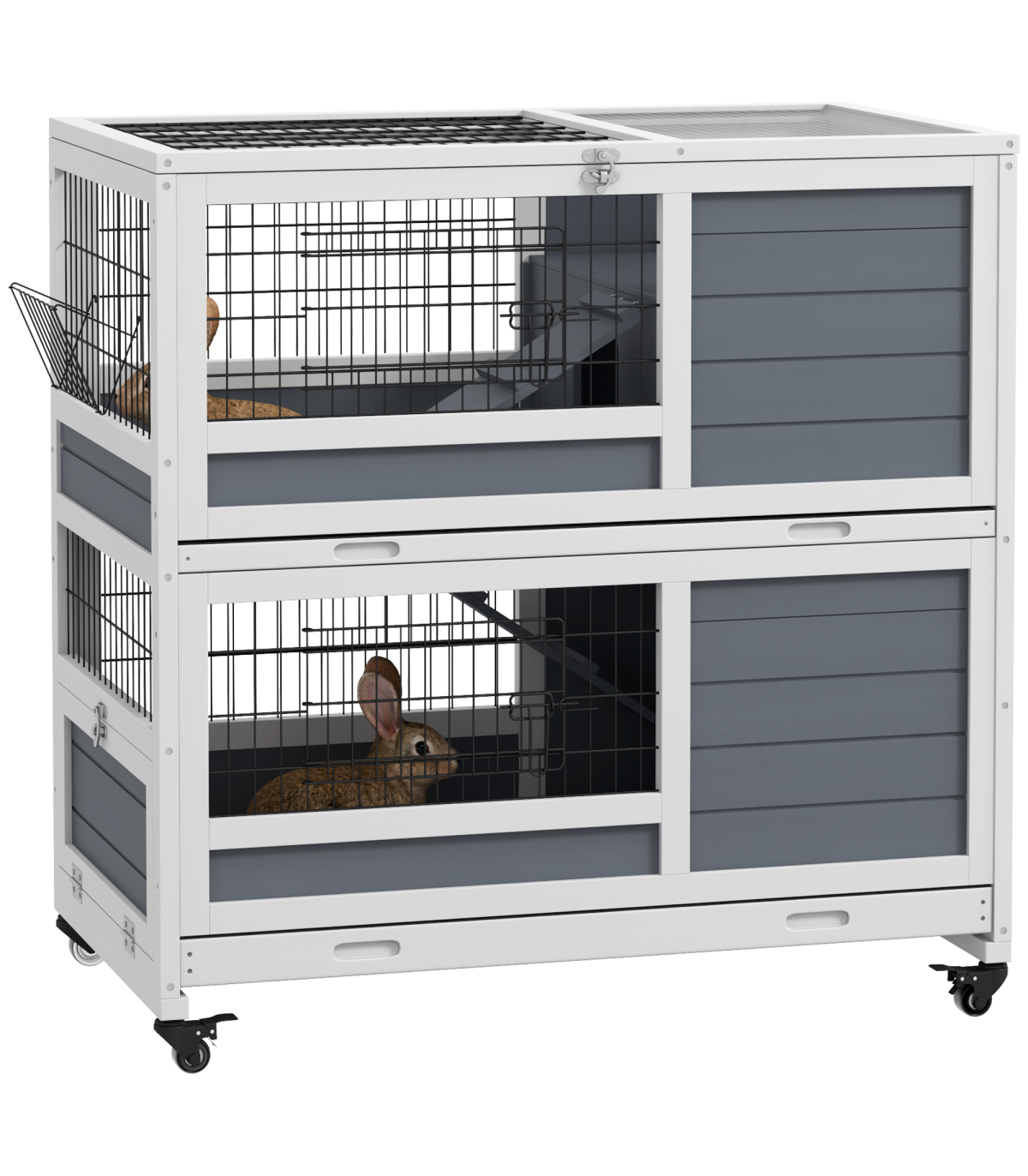 PawHut Double Decker Indoor Rabbit Hutch with Feeding Trough, Slide-Out Trays" Description: - Openable top and metal doors for easy access - Two sliding trays for hassle-free maintenance - Two-tier design, providing a separate space for isolation or breeding - Ramps for easy movement between levels - Integrated feeding trough for easy access to food - Suitable for 1-2 rabbits - Four wheels for easy movement - Assembly required - Colour: White and grey - Material: Fir wood and steel wire - Overall dimensions: 97H x 90L x 53Wcm. Overall floor area: 0.48 m². Each layer: 43.5H x 90L x 53Wcm. Hut: 24H x 34L x 49Wcm. Door opening: 16H x 20Wcm. Metal door: 13H x 27Wcm. Bottom door: 22H x 47Wcm. Ramp: 42L x 14.5Wcm and 60L x 14.5Wcm. Tray: 85.5L x 50.5Wcm. Feeding trough: 11H x 23L x 9Wcm - Item label: D51-415V00GY