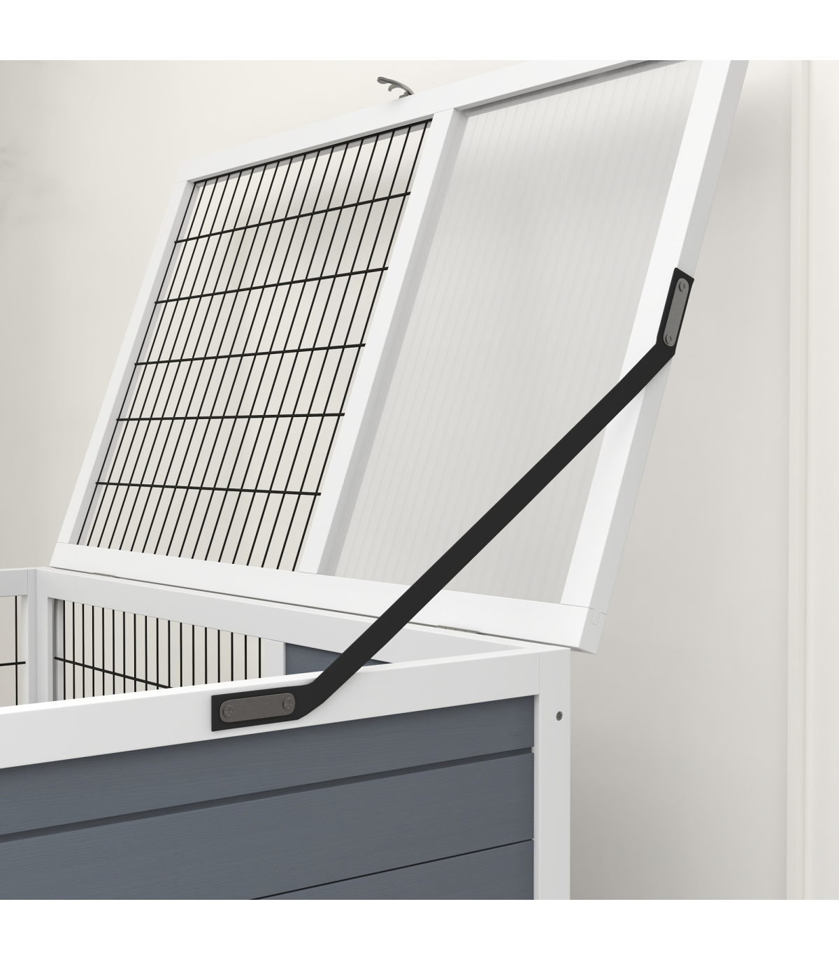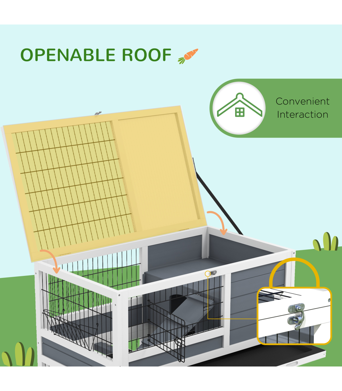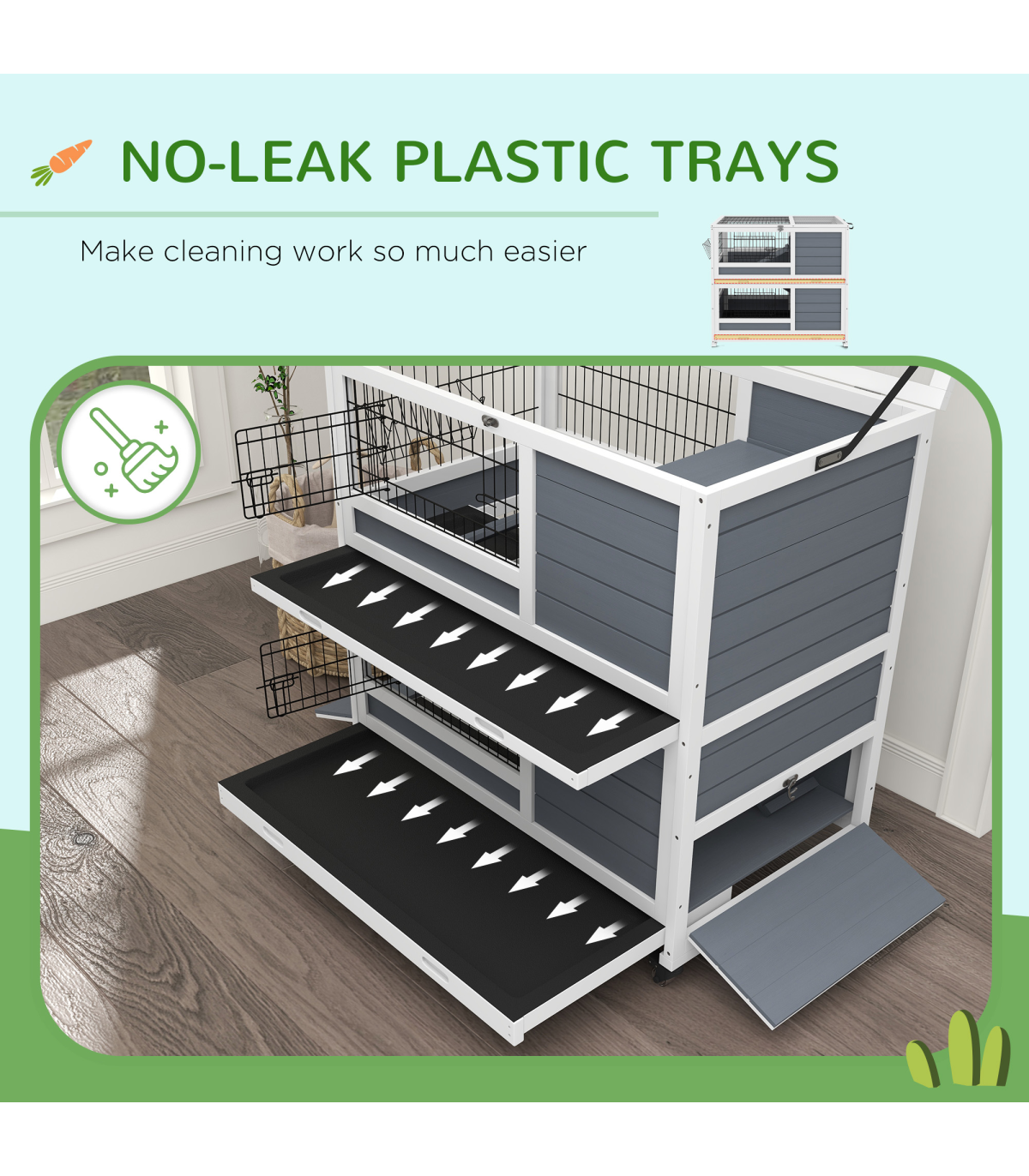 PawHut Double Decker Indoor Rabbit Hutch with Feeding Trough, Slide-Out Trays" Description: - Openable top and metal doors for easy access - Two sliding trays for hassle-free maintenance - Two-tier design, providing a separate space for isolation or breeding - Ramps for easy movement between levels - Integrated feeding trough for easy access to food - Suitable for 1-2 rabbits - Four wheels for easy movement - Assembly required - Colour: White and grey - Material: Fir wood and steel wire - Overall dimensions: 97H x 90L x 53Wcm. Overall floor area: 0.48 m². Each layer: 43.5H x 90L x 53Wcm. Hut: 24H x 34L x 49Wcm. Door opening: 16H x 20Wcm. Metal door: 13H x 27Wcm. Bottom door: 22H x 47Wcm. Ramp: 42L x 14.5Wcm and 60L x 14.5Wcm. Tray: 85.5L x 50.5Wcm. Feeding trough: 11H x 23L x 9Wcm - Item label: D51-415V00GY