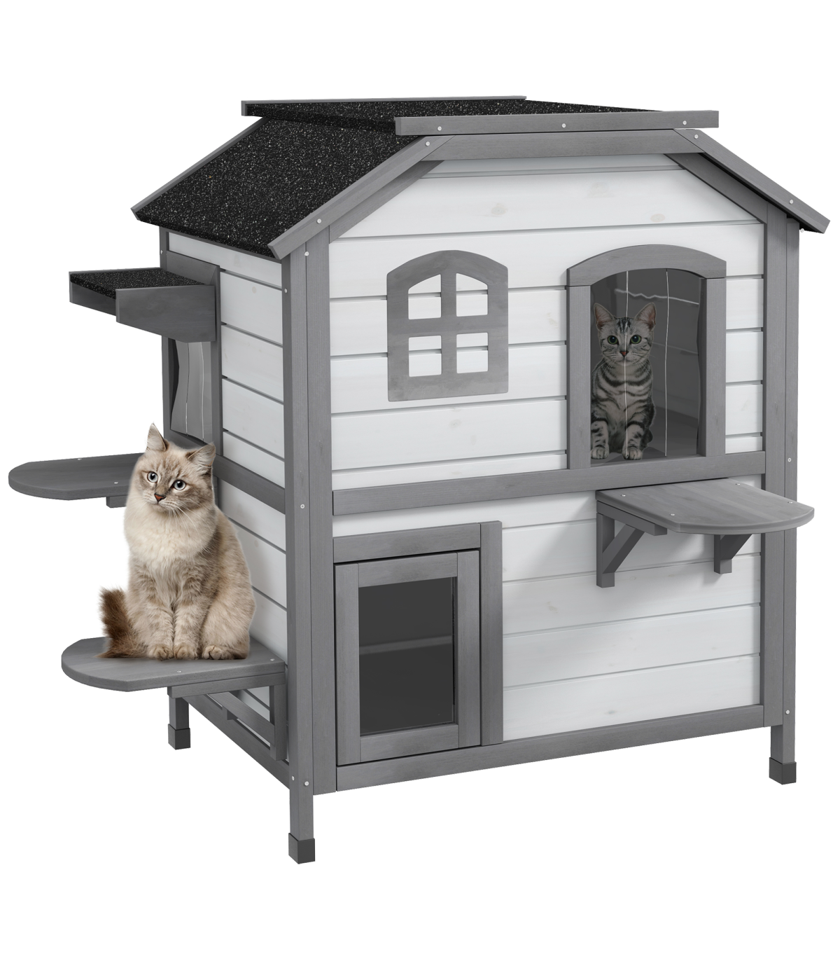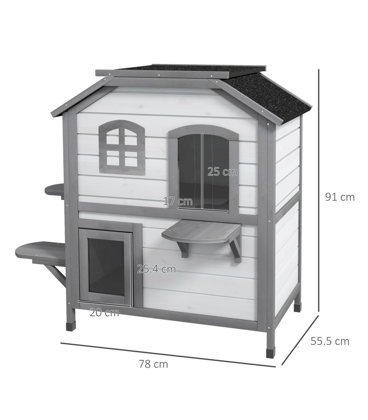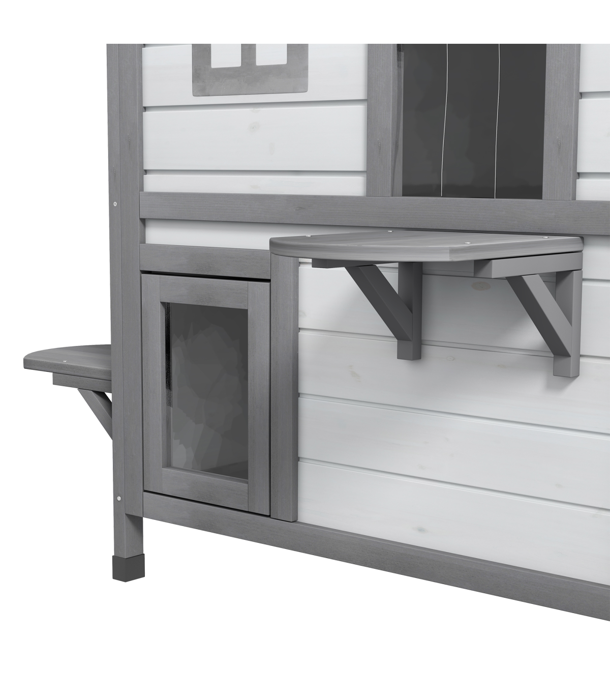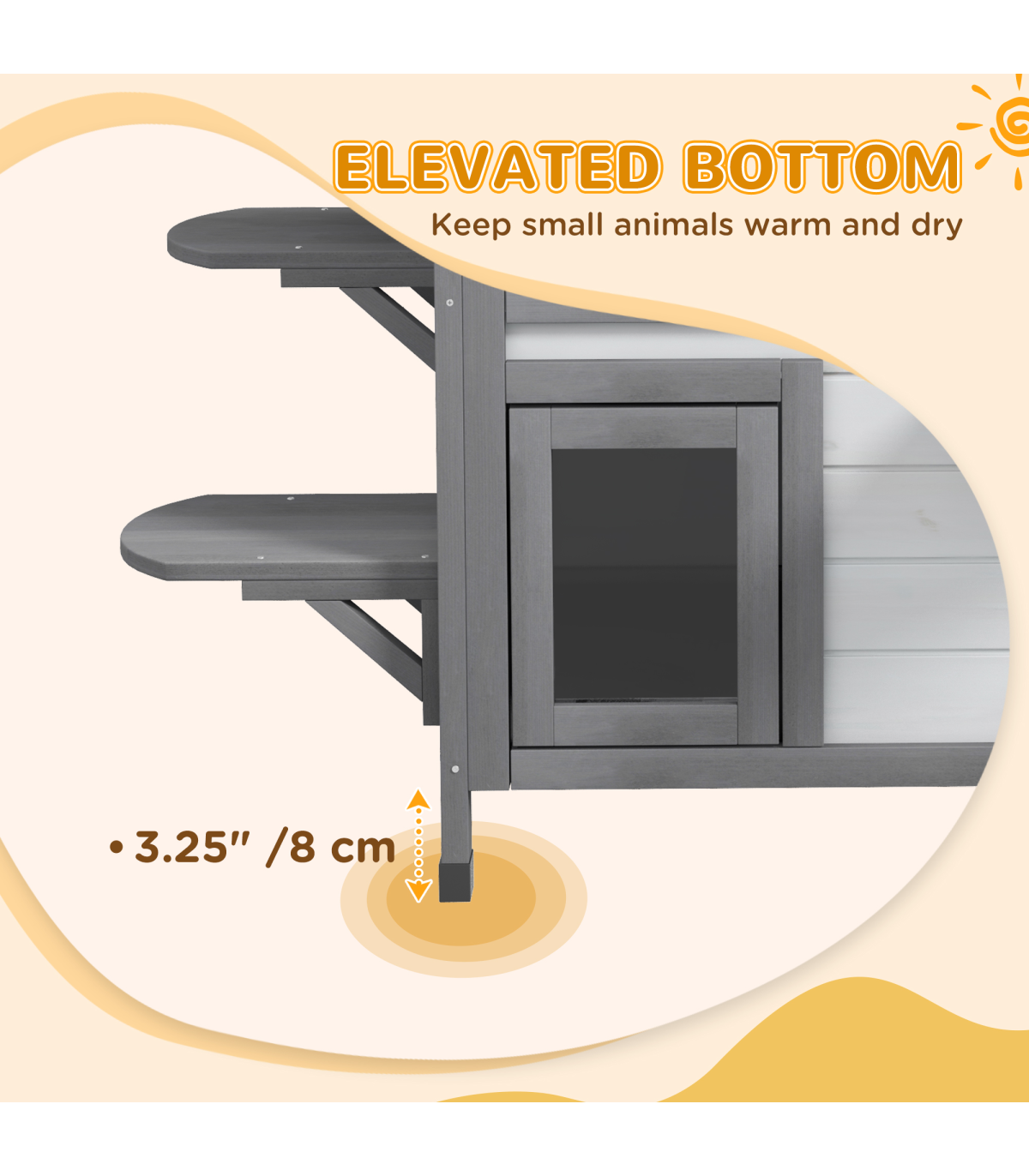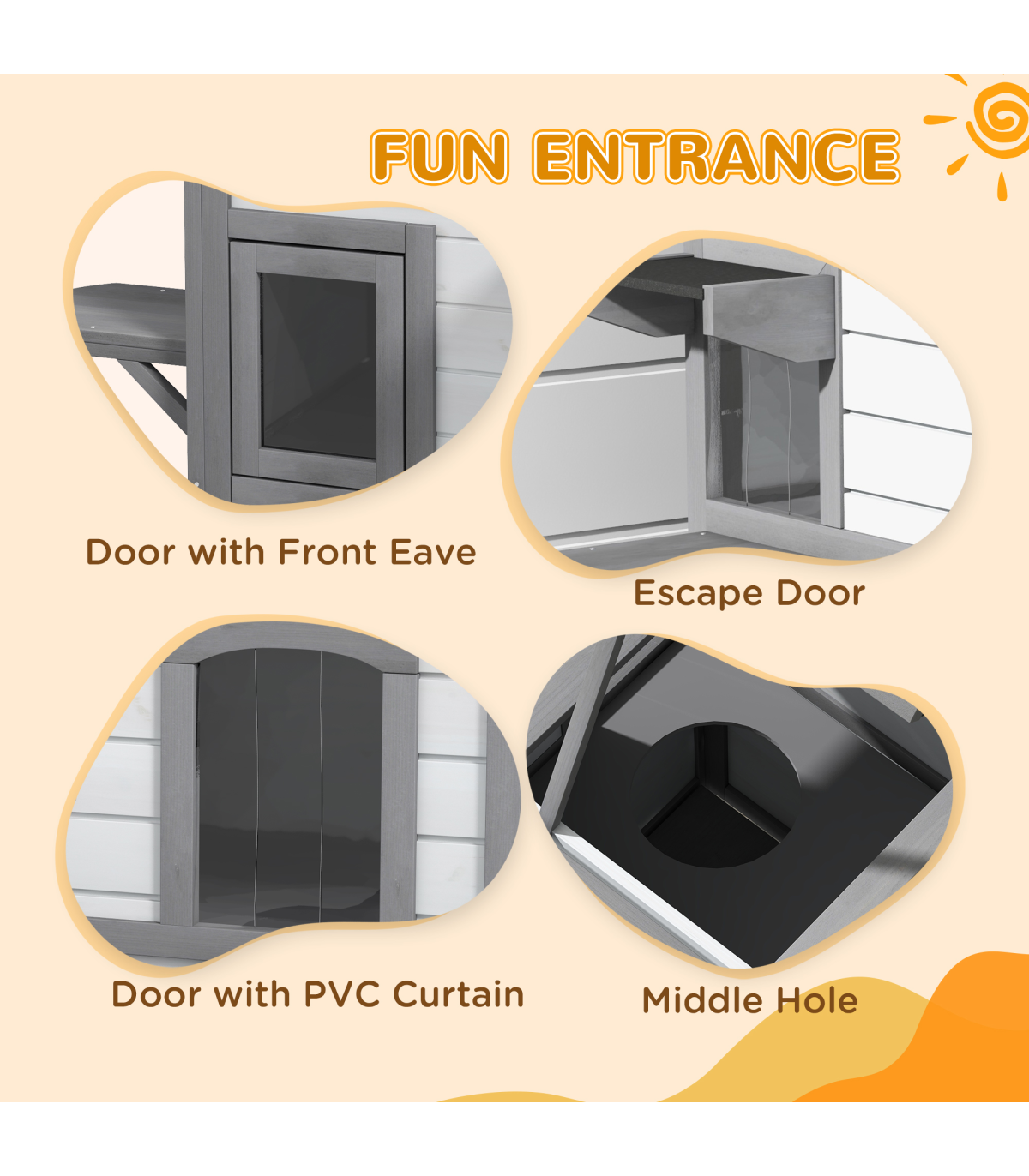 ● Dimensions: 78L x 55.5W x 91Hcm. Bottom house: 72L x 48W x 31H cm. Top house: 72L x 48W x 43H cm. Top door: 17L x 25H cm. Escape door: 20L x 25.4H cm. Side door: 17L x 22H cm. Jump platform: 25L x 20W cm. Off the ground height: 8 cm