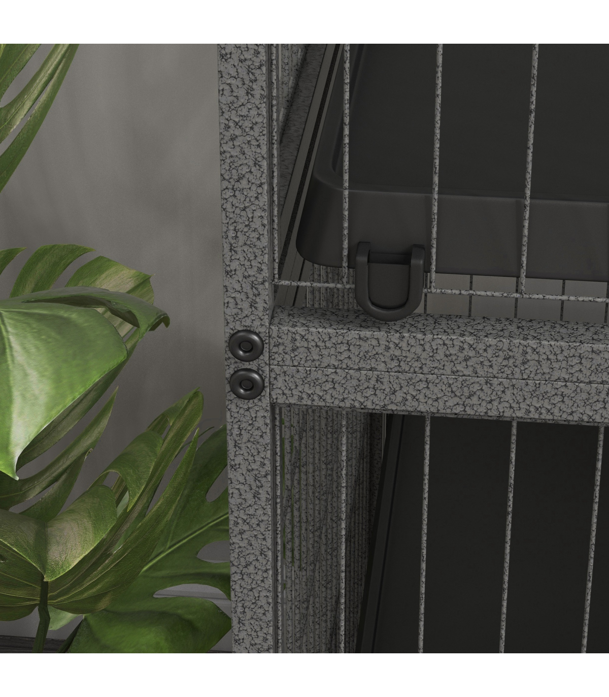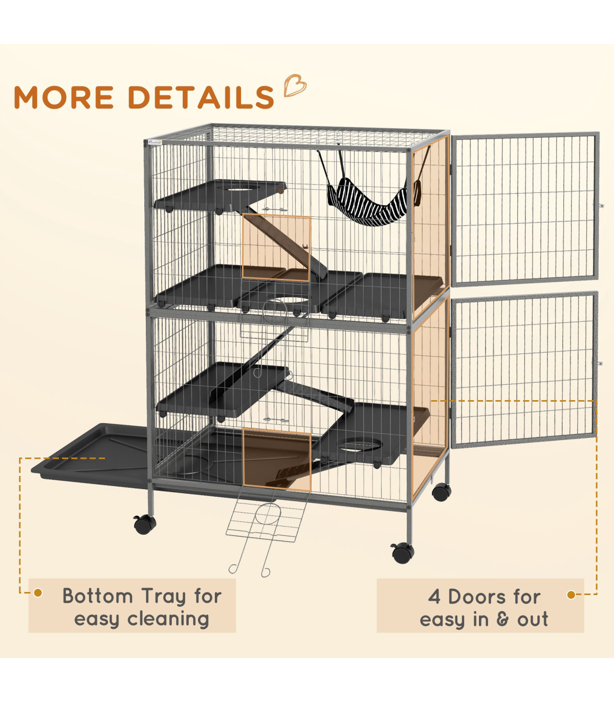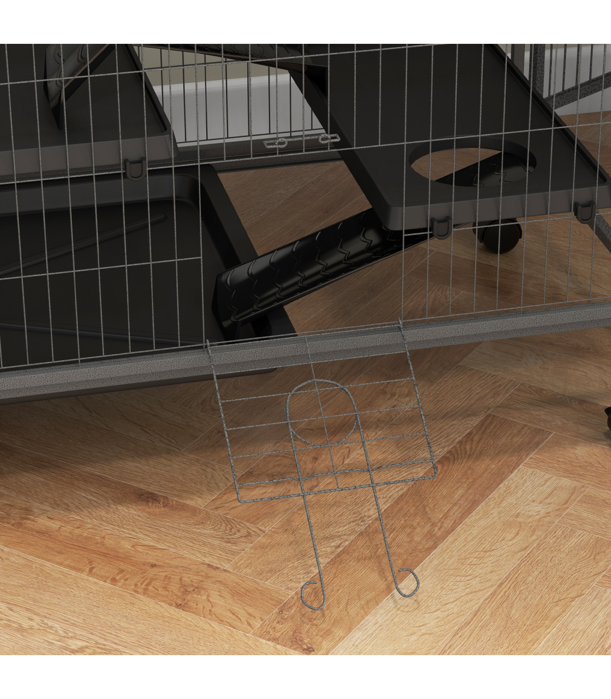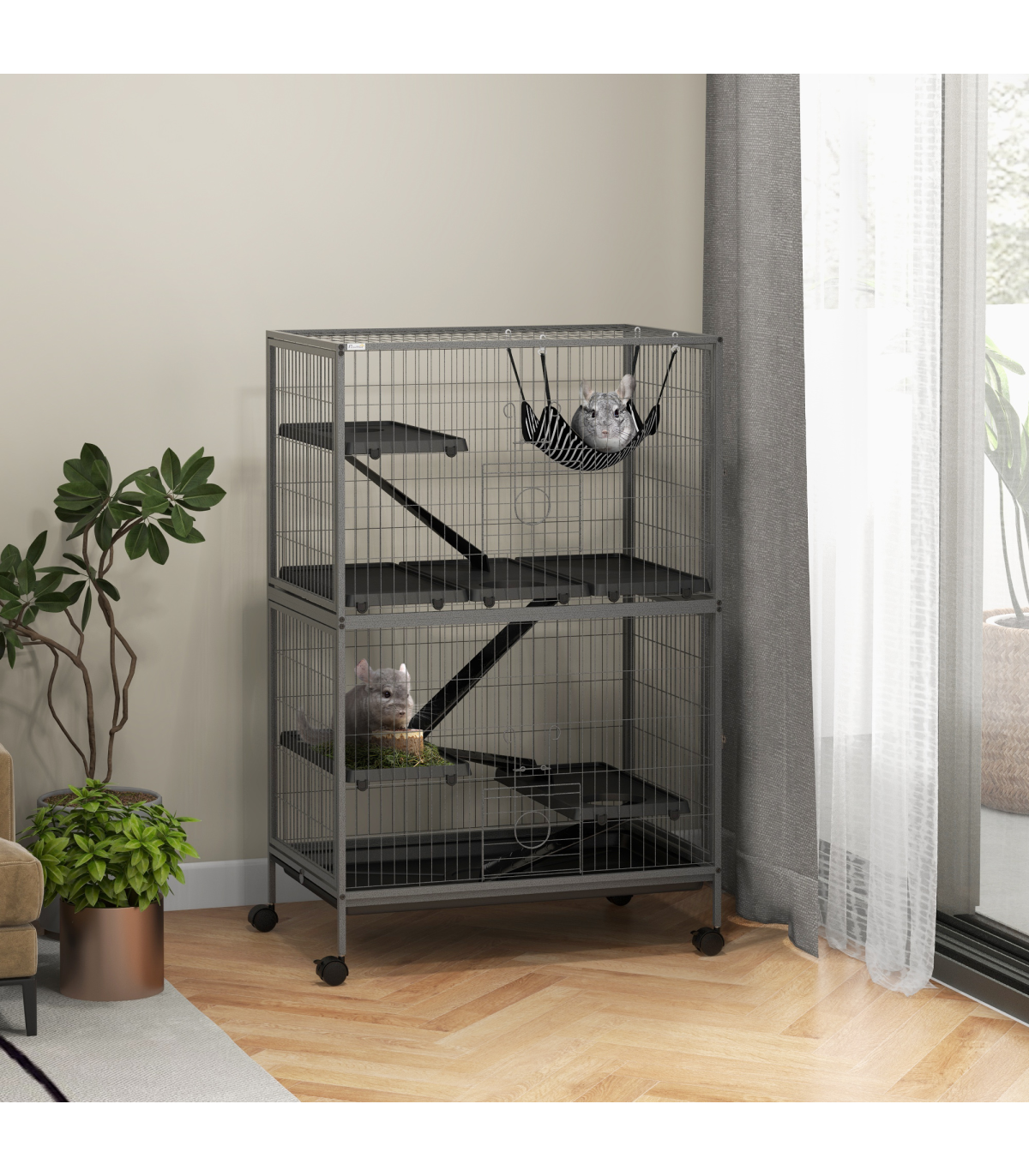 - Four wheels for easy movement. Two can be locked to keep the cage in place
