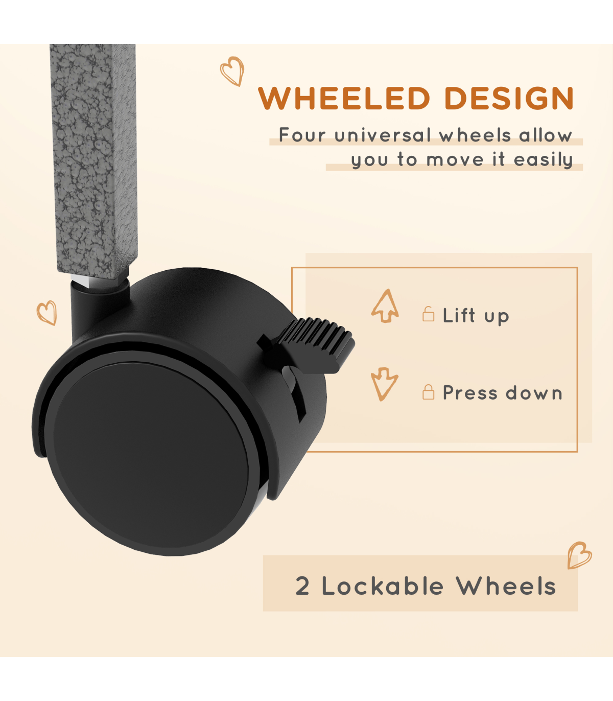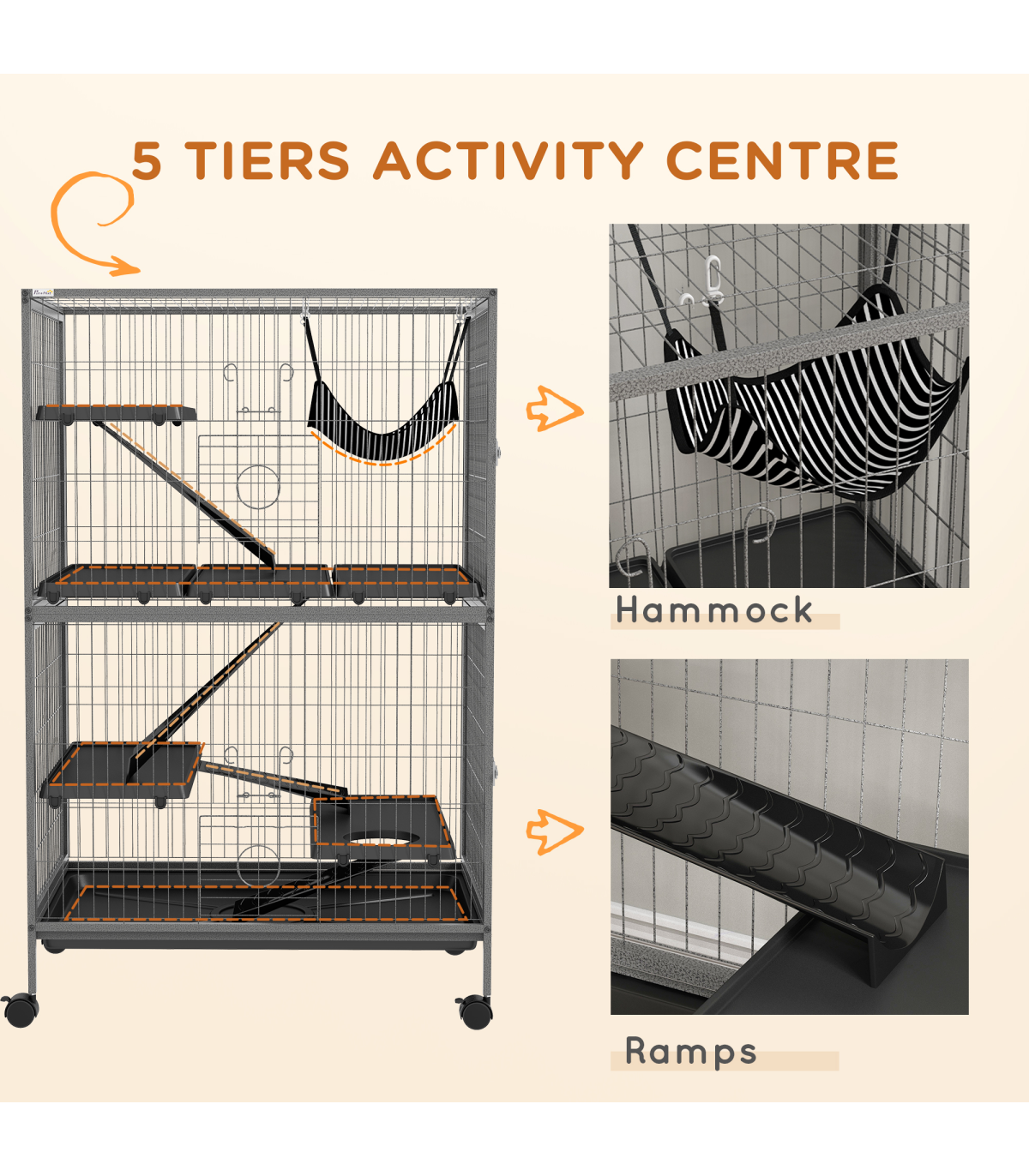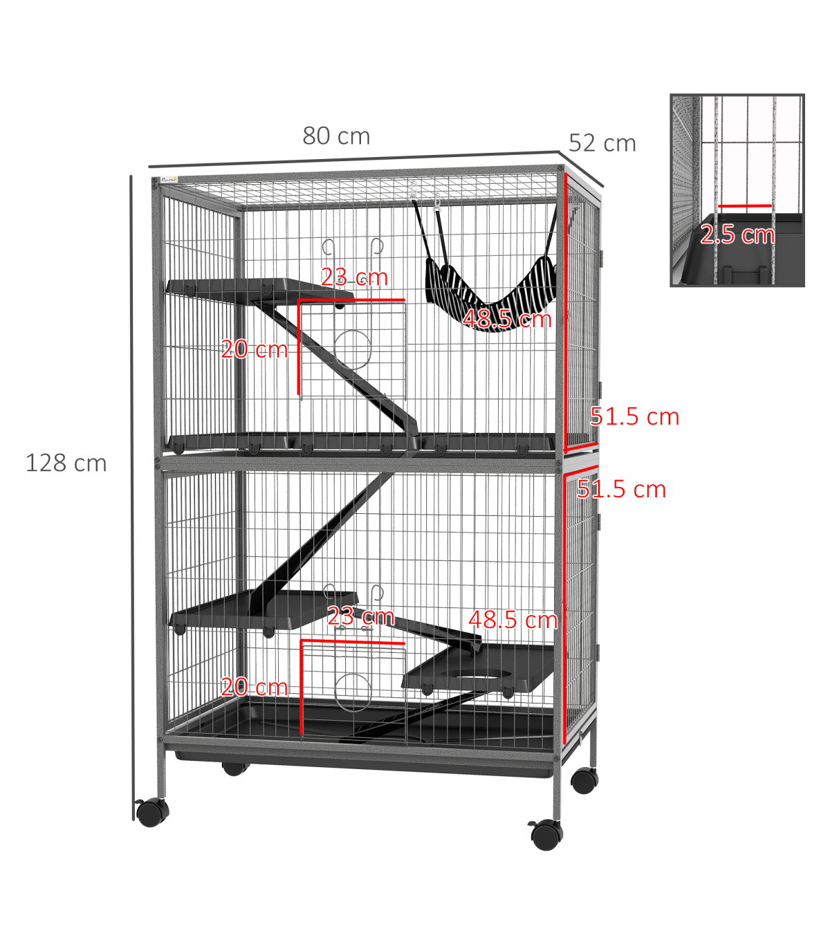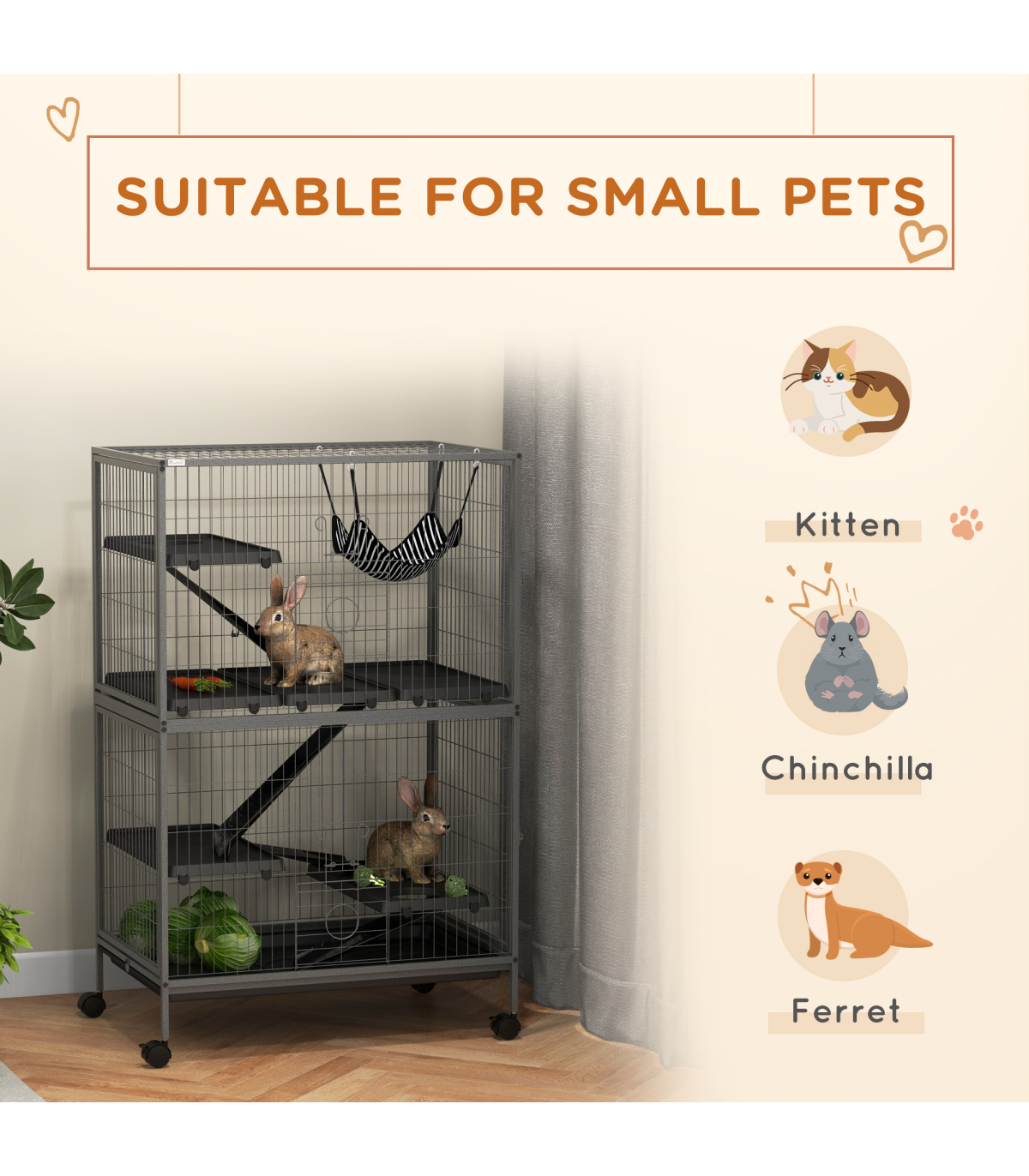 - Four wheels for easy movement. Two can be locked to keep the cage in place
