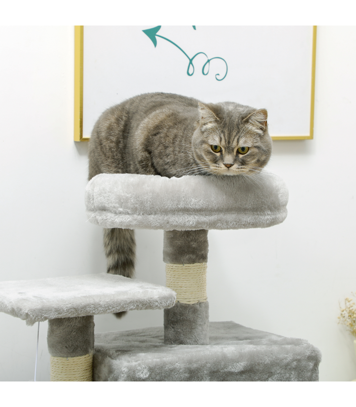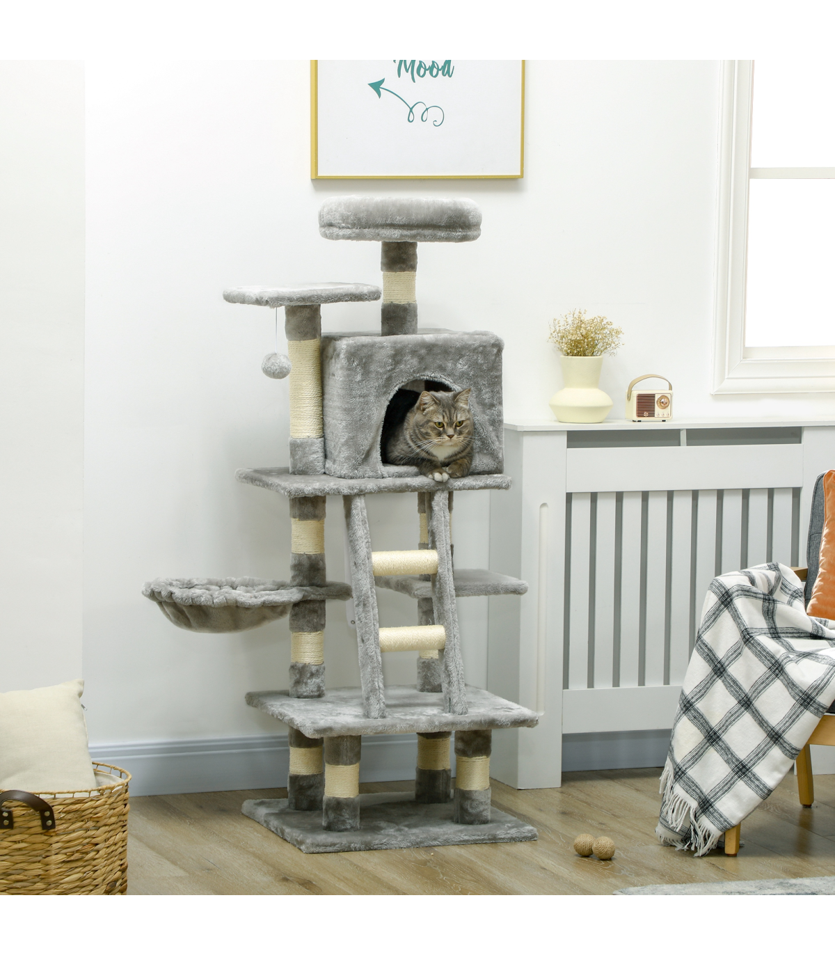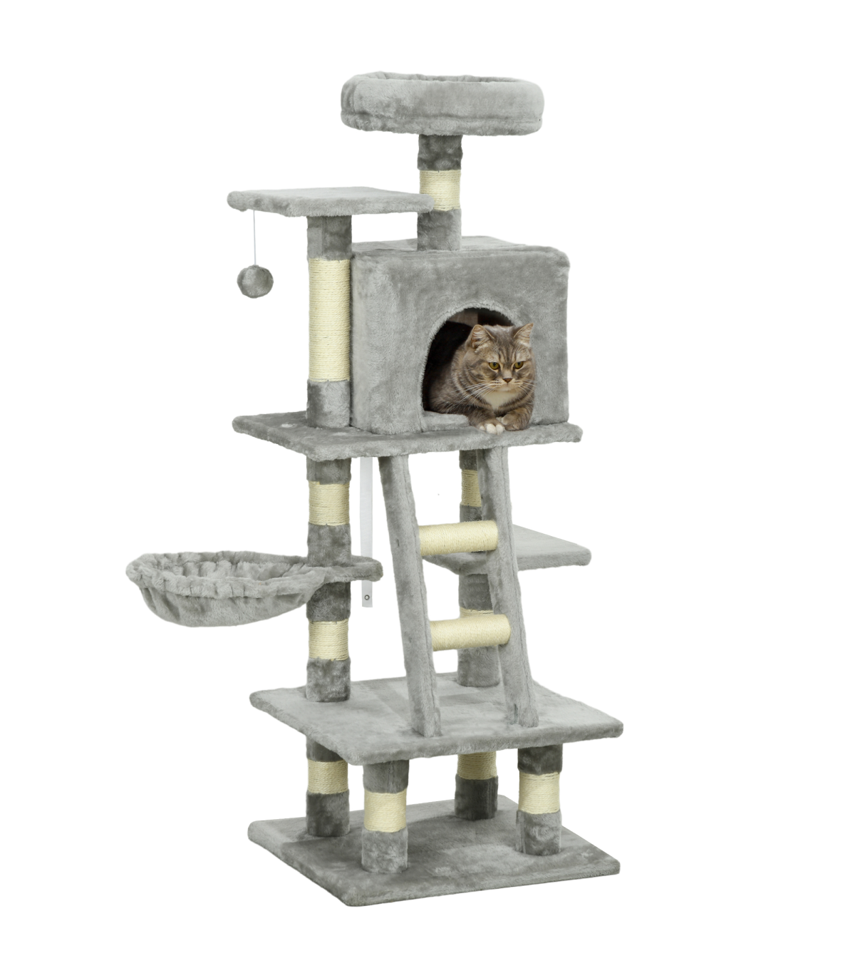 ● Dimensions: 132H x 49L x 44Wcm. House: 28H x 35L x 30Wcm. House door: 18H x 20Lcm. Hammock: Φ30cm. Ladder: 49H x 17Lcm. Platform from bottom to top: 49L x 44Wcm, 49L x 44Wcm, 25L x 25Wcm, 49L x 35Wcm & 25L x 25Wcm. Pole: Ф6.8cm