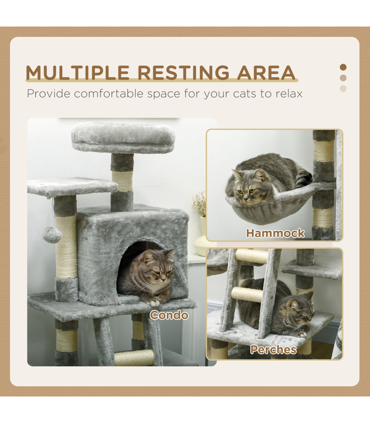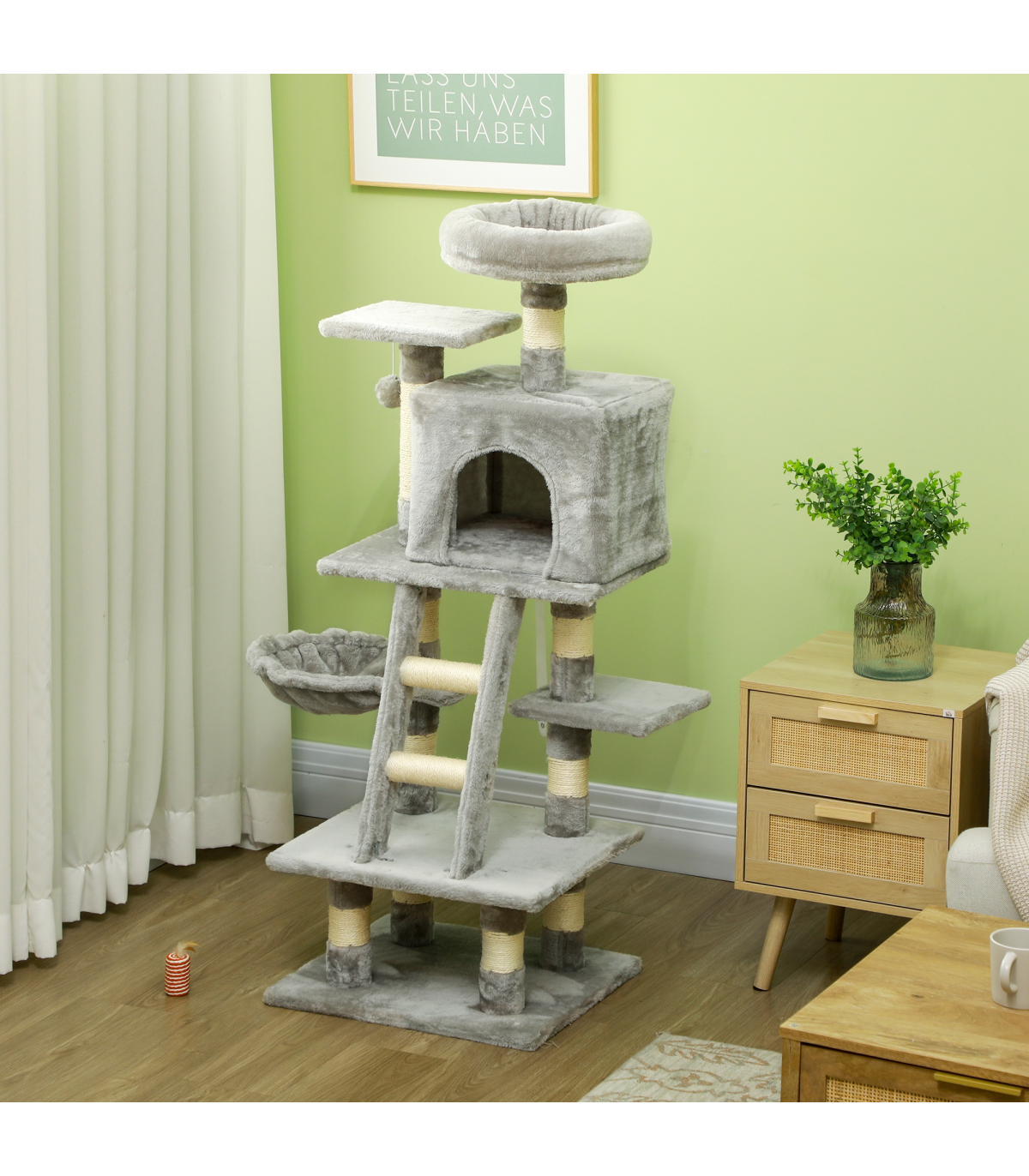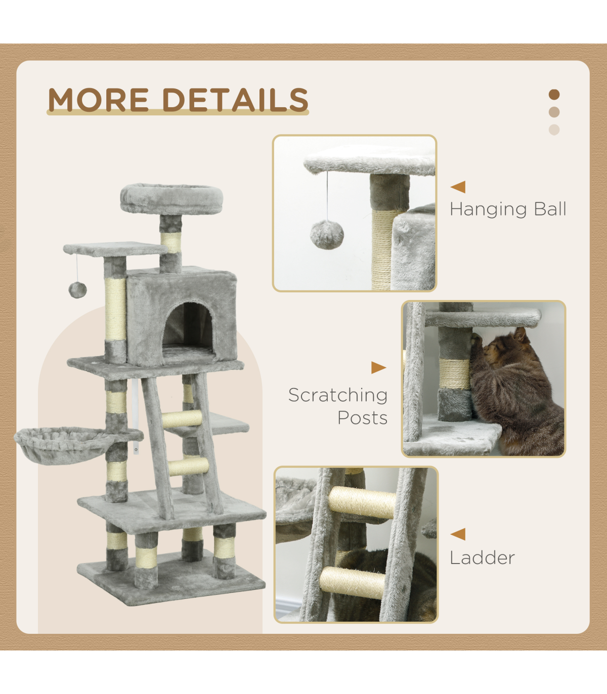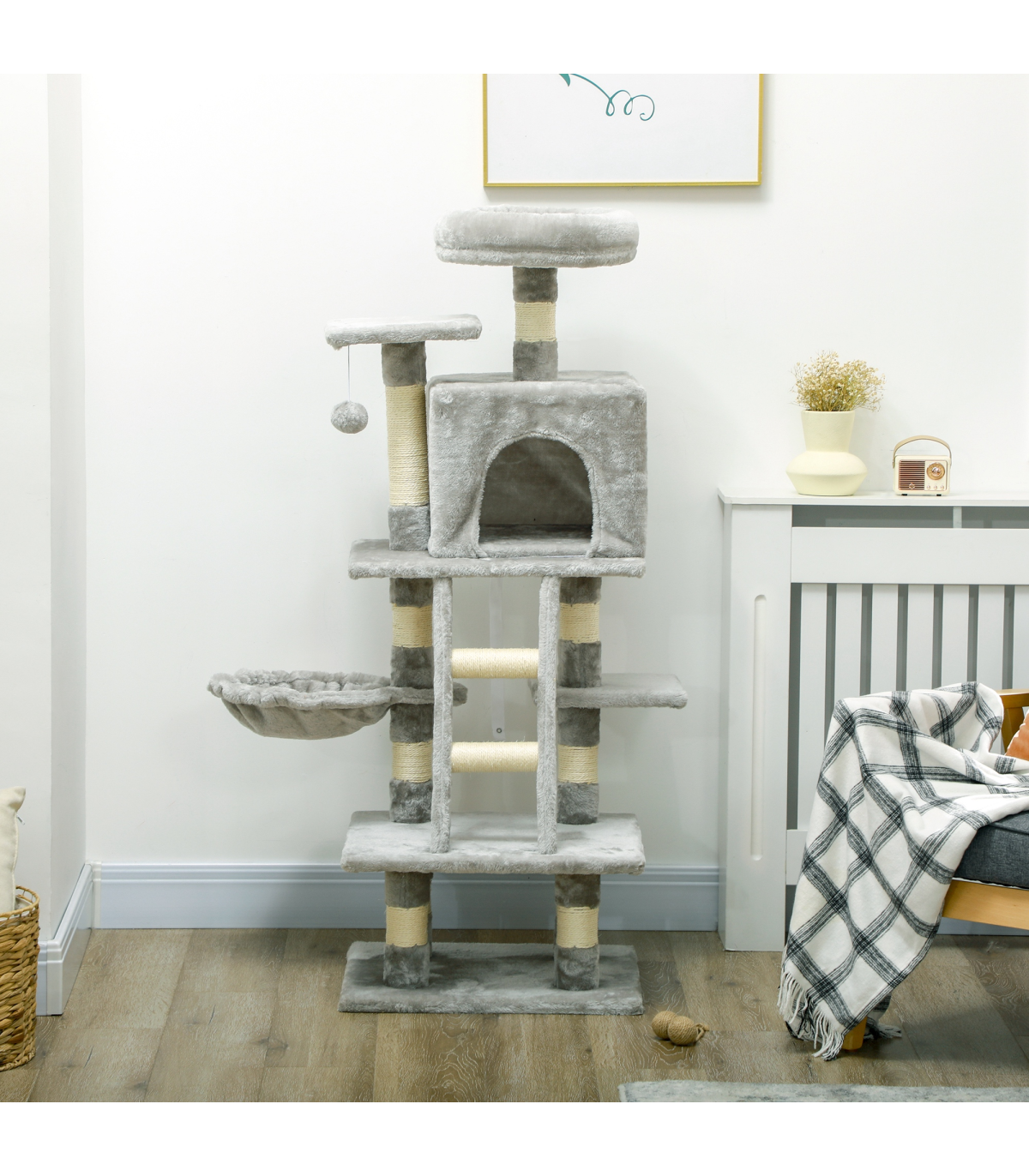 ● Dimensions: 132H x 49L x 44Wcm. House: 28H x 35L x 30Wcm. House door: 18H x 20Lcm. Hammock: Φ30cm. Ladder: 49H x 17Lcm. Platform from bottom to top: 49L x 44Wcm, 49L x 44Wcm, 25L x 25Wcm, 49L x 35Wcm & 25L x 25Wcm. Pole: Ф6.8cm