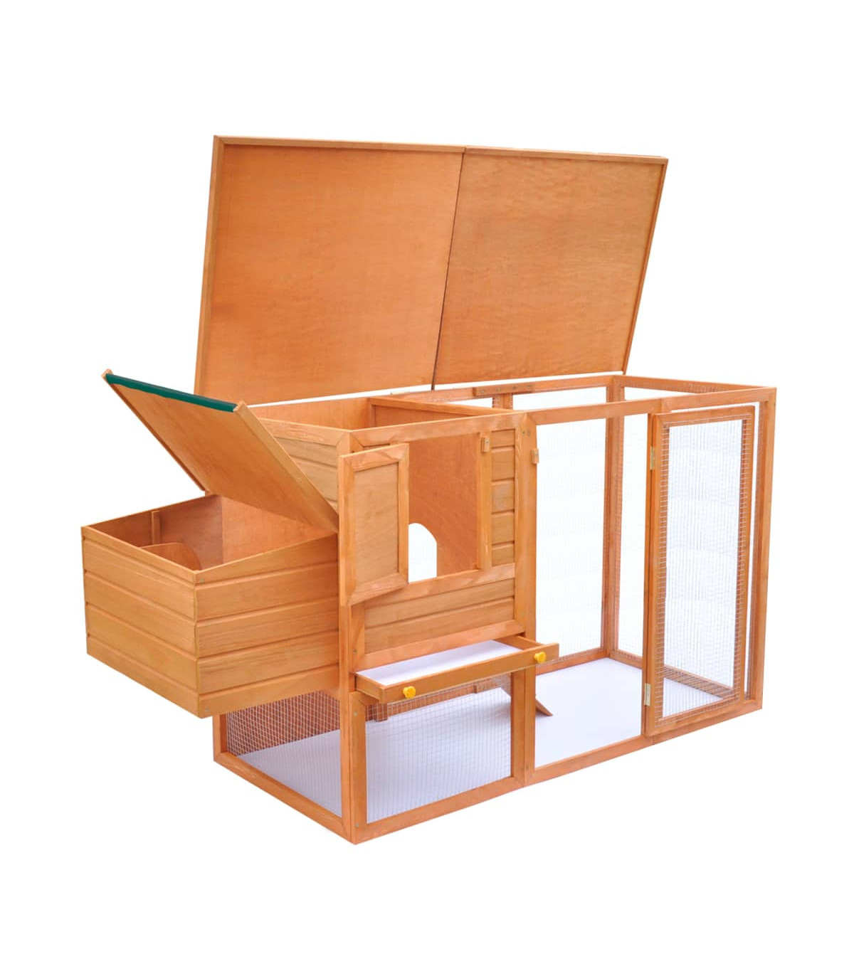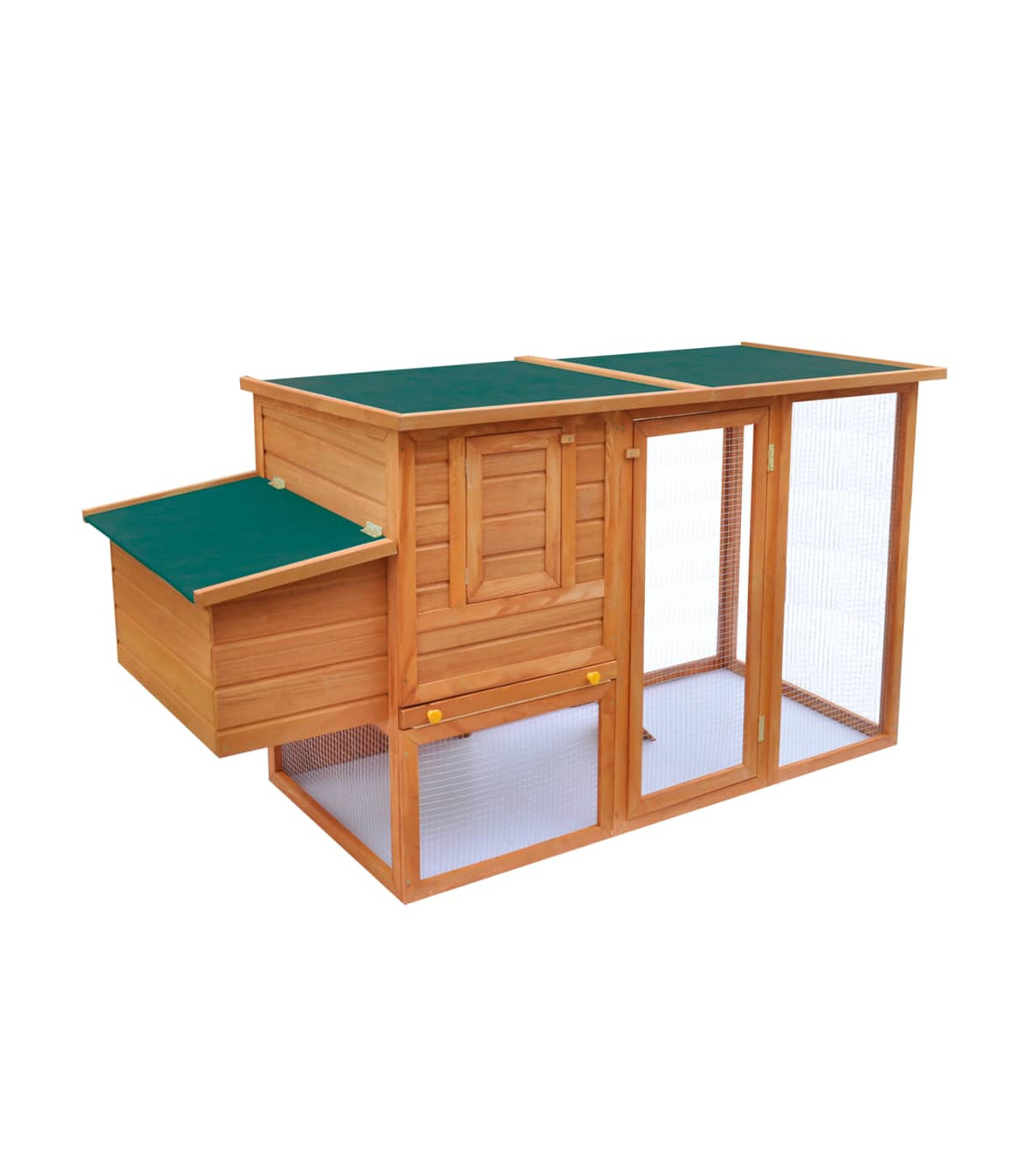 This wooden chicken cage provides a large cozy place. Made of high-quality pine wood, the cage is durable for years of use. The green waterproof roof on the top keeps rain away, creating a warm, comfortable resting area inside the cubby. Thanks to the close-knit iron wire mesh, your chickens will always get enough fresh air. An easy-climb ramp leads from the lower ground level to the upper floor. A pull-out tray allows an easy cleaning. And the door can be easily locked with a slide-bolt latch. In addition, an egg cage is designed for you to put the eggs in a safe place. Important note: We recommend you placing the chicken cage under shelter. Accordingly, it will last a longer life.