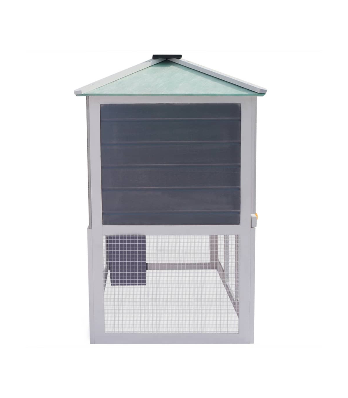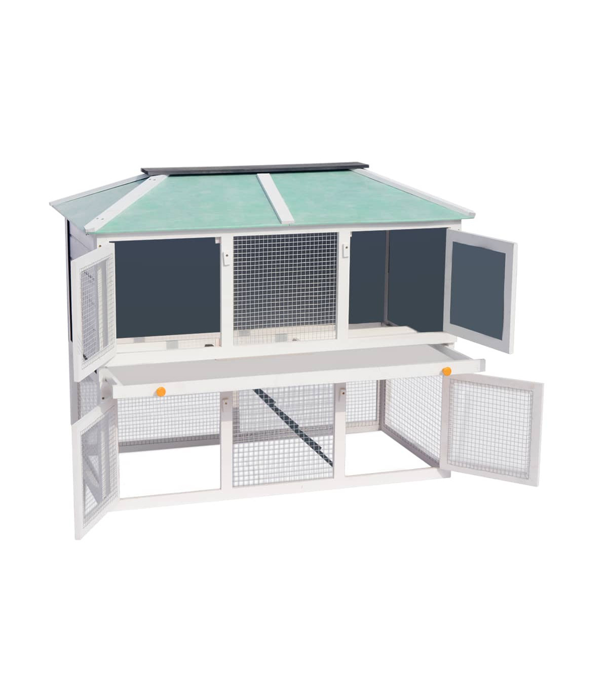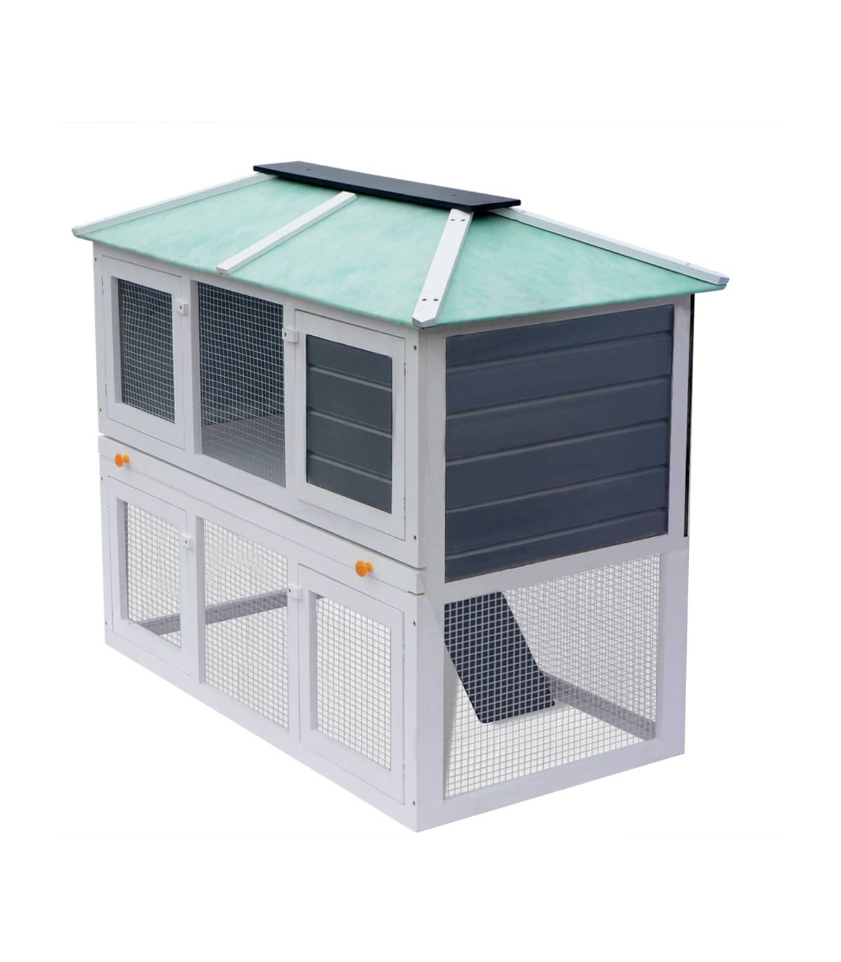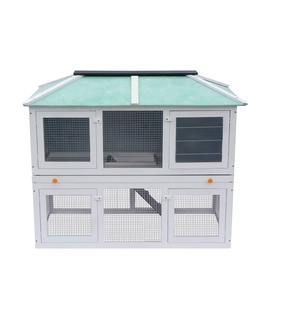 This high-quality hutch of 2 layers provides a large cozy place for keeping cute rabbits and chicken. It features multiple uses: playing, exercising or training. This cage provides your pets with plenty of exercise space. Meanwhile, the construction of iron wire grid ensures your monitoring of the pets and enables your pets to keep an eye on the surroundings and get enough fresh air. The animal hutch is built with fir wood frame, which lasts for years. Its green roof keeps rain away while the cozy cubby makes the perfect sleeping area. The easy-climb ladder leads from the lower ground level to the upper floor. The pull-out tray makes cleaning easy. And the doors close easily. This wooden rabbit cage is perfect for small pets. Important note: We recommend you placing the rabbit cage under shelter. Accordingly, it will last a longer life.