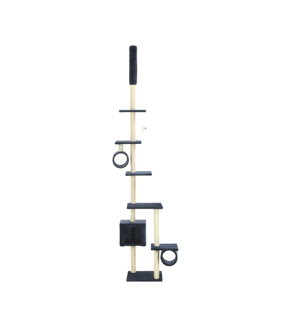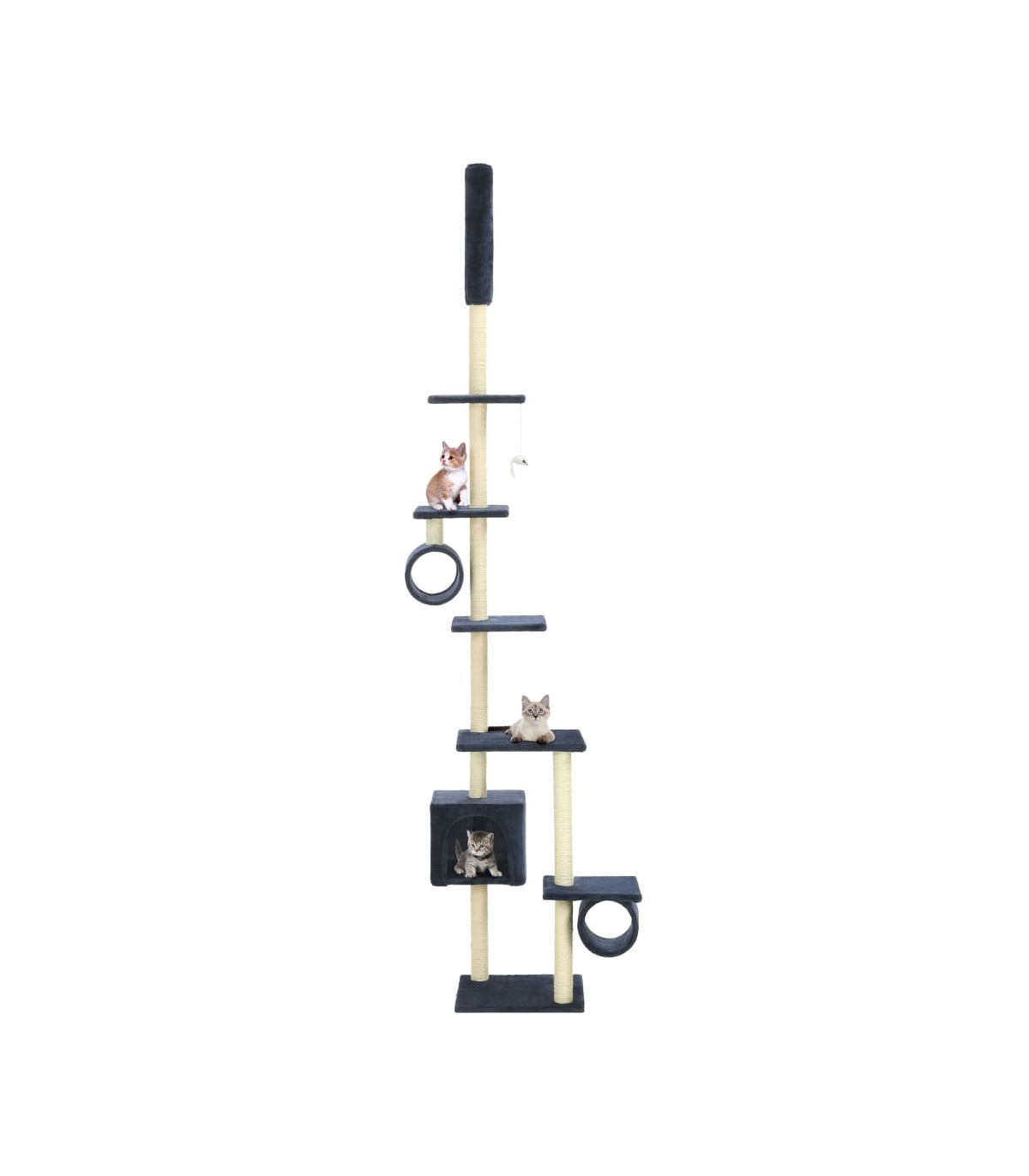 Give your feline friends a taste of luxury with our feature-packed cat tree! This multi-storey cats' play centre, with a solid frame covered in soft, comfortable plush, is the perfect retreat for your cats to scratch, climb, perch, hide, and rest. Your feline friends can sharpen their claws on the scratching posts wrapped in sisal rope, which provides a healthy outlet for their scratching instincts. They will also enjoy chasing after each other while jumping up and down this fun play centre. There is a dangling toy that will engage your curious cats. When they've had enough playtime fun, your little friends will love resting on the upper platforms where they have a better view. They can also hide in the cosy house or tunnels to take a nap. With all these fun features, this cat playhouse will become your furry friends' favourite hangout spot!