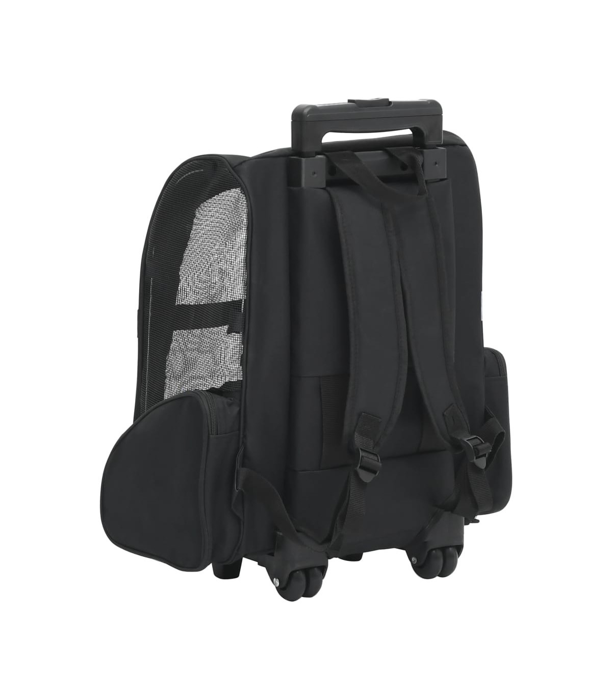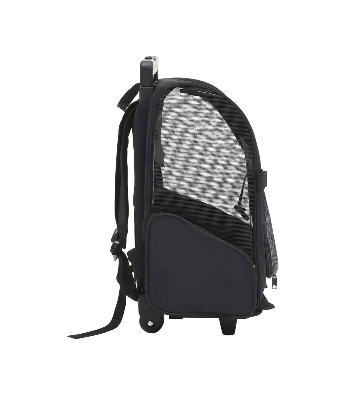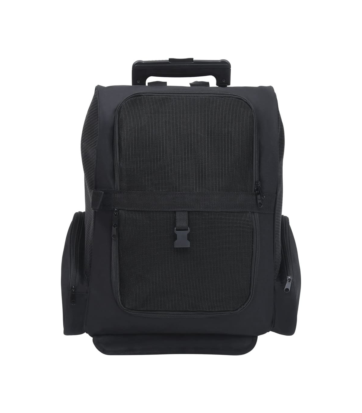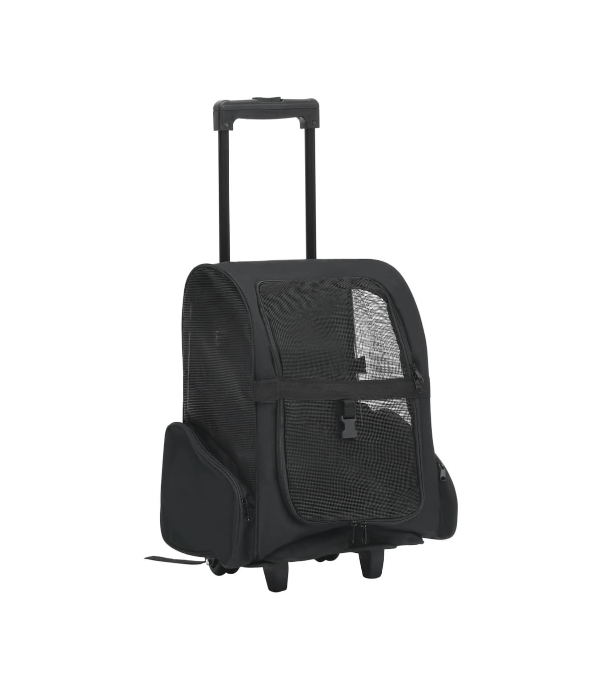 This pet trolley is lightweight and ventilated. It is designed for small pets like cats, dogs, rabbits, etc. Featuring an all-in-one design, this collapsible trolley can also be used as a pet backpack and a pet hand bag. It will really be a perfect choice for pet owners. This pet trolley is light and well-ventilated, with strong mesh windows on three sides, which makes it a comfortable shelter for your furry friend. The zippered doors can be rolled up or down, which makes it easy for your pet to get in and out. This pet trolley also boasts 2 zippered storage pockets for carrying small items like toys, treats, etc. Made of high-quality metal and fabric, this pet trolley is very durable.