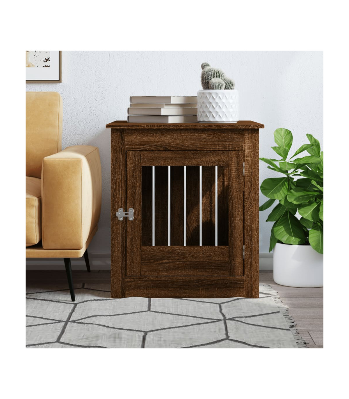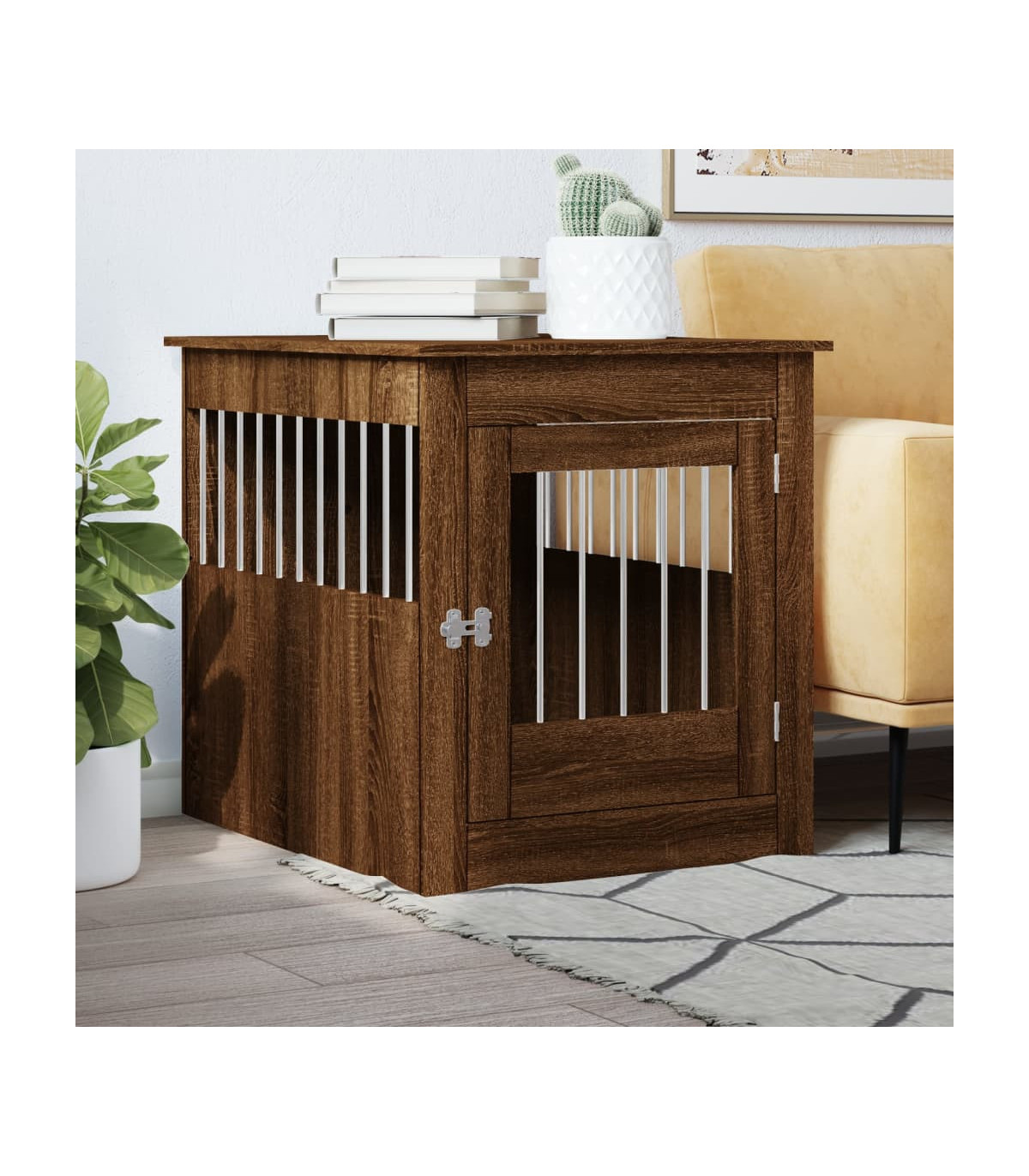 This dog crate furniture, serving as both a dog cage and an end table, makes a practical and eye-catching addition to your living room. Sturdy construction: The doghouse is made of steel wires and engineered wood, ensuring both safety and durability. The engineered wood is of exceptional quality with smooth surface and also features strength, stability and resistance to moisture.2-in-1 function: This dog kennel perfectly combines style and functions. It not only provides your furry friend with a cosy spot to nap but also doubles as an end table for you to place your favorite decorations.Ventilation design: The steel wire windows allow air to flow properly in the dog cage and prevent bad odours, creating a comfy sleeping environment for your dogs.Lockable door: This dog crate has a latched door for extra safety. Additionally, you can install the door either on the left side or right side based on your own needs.