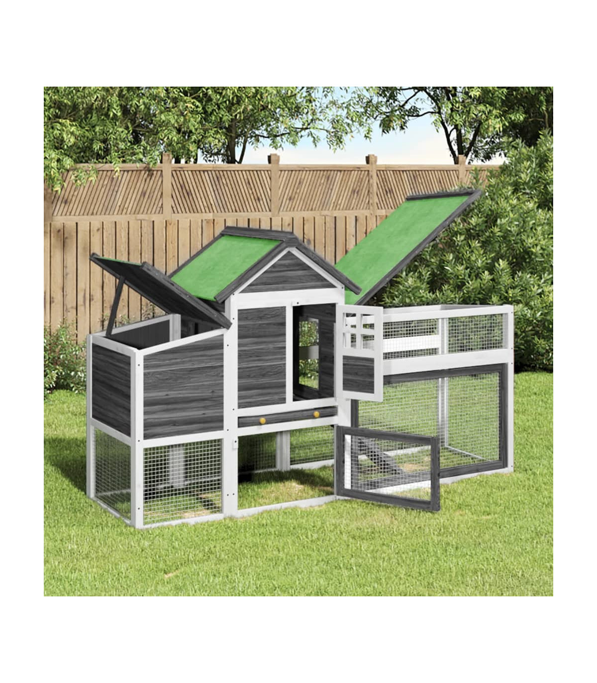The wooden chicken coop provides a cosy and comfortable place for keeping small animals, especially chickens, to relax. Solid pine wood: Solid pine wood is a beautiful natural material. Pine wood has a straight grain, and the knots give the material its signature, rustic look.All-in-one chicken run: Including a large nesting box, resting area and run ramp, the chicken cage always provides enough space for free activities for chickens.Mesh fences: The chicken house is equipped with breathable wire fences, protecting chickens or other animals from outside predators.Water-resistant roof: The water-resistant roof of this chicken pen provides your pets with a warm, dry, safe and comfortable environment.Widely usage: The chicken nesting box is also suitable for other animals, such as rabbits, ducks, geese and birds etc.