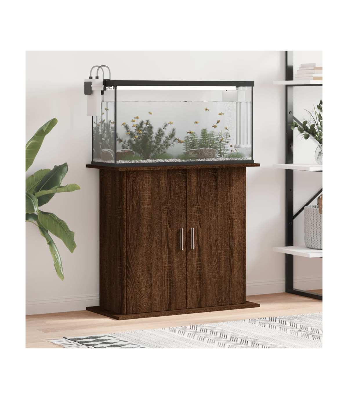This aquarium stand provides stable support and secure display space for your fish tank. Whether you're raising ornamental fish or arranging aquatic plants, this aquarium stand can meet your needs. Durable material: The engineered wood is of exceptional quality with a smooth surface and also features strength, stability, and resistance to moisture.Storage function: The aquarium cabinet has ample storage space, the top is designed for putting the fish tank, and the 4 compartments with doors are convenient for you to store fish feed, fishnet, disinfectants, water conditioner, and other items.Stylish design: This fish tank stand has a sleek design that complements various home decor styles. It serves not only as a practical fish tank stand but also as an exquisite home decoration, adding a touch of modern elegance to your living space. Warning:To prevent it being overturned, this product must be used with the provided wall attachment device.