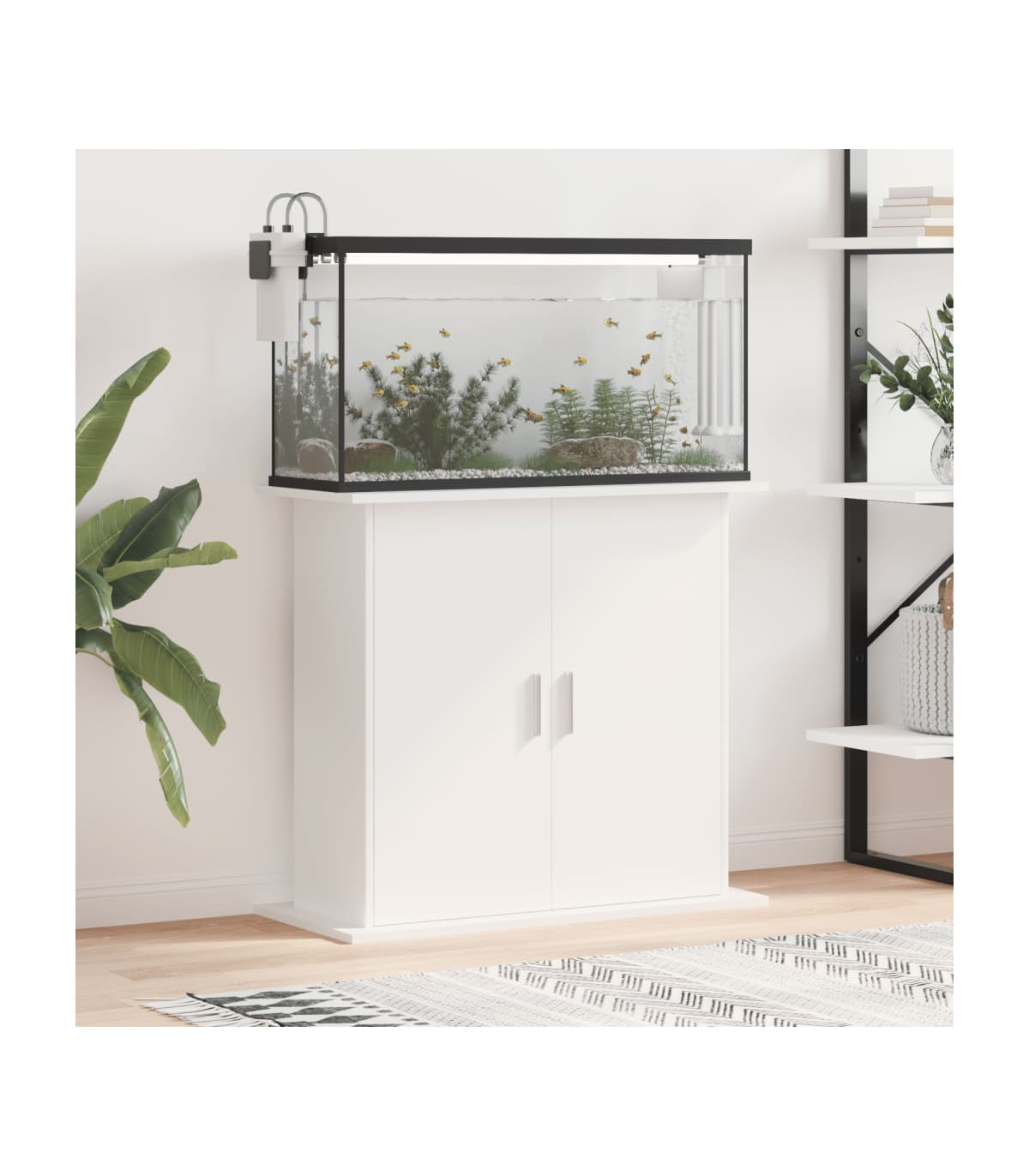 This aquarium stand provides stable support and secure display space for your fish tank. Whether you're raising ornamental fish or arranging aquatic plants, this aquarium stand can meet your needs. Durable material: The engineered wood is of exceptional quality with a smooth surface and also features strength, stability, and resistance to moisture.Storage function: The aquarium cabinet has ample storage space, the top is designed for putting the fish tank, and the 4 compartments with doors are convenient for you to store fish feed, fishnet, disinfectants, water conditioner, and other items.Stylish design: This fish tank stand has a sleek design that complements various home decor styles. It serves not only as a practical fish tank stand but also as an exquisite home decoration, adding a touch of modern elegance to your living space. Warning:To prevent it being overturned, this product must be used with the provided wall attachment device.