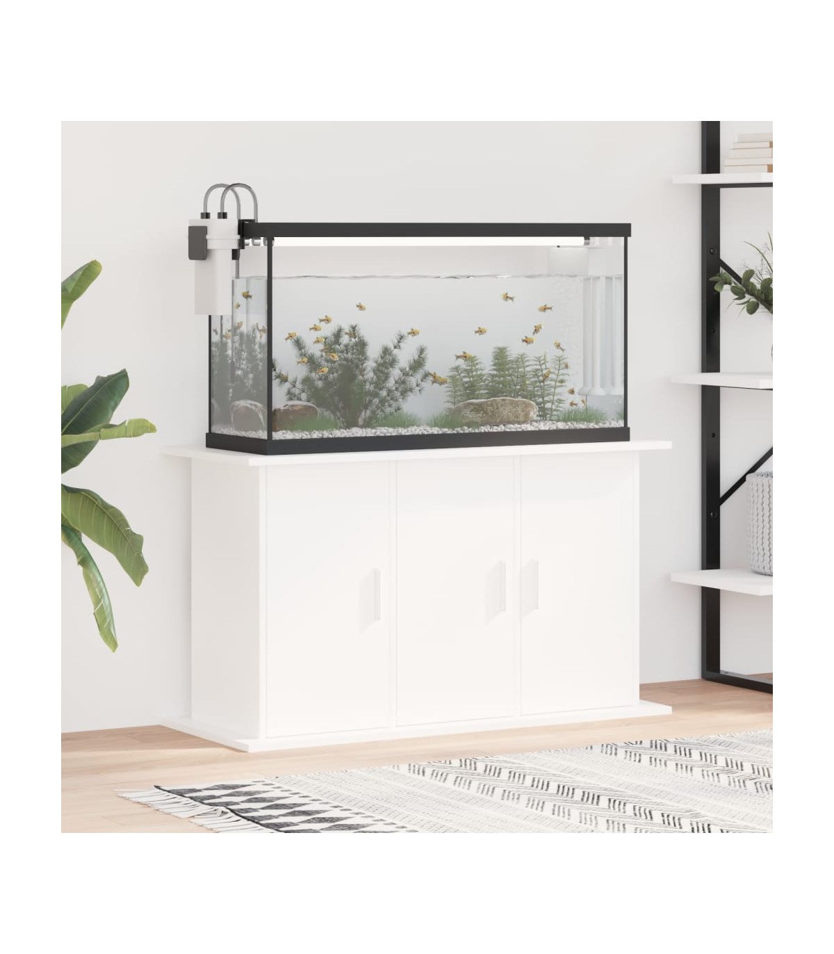 This aquarium stand provides stable support and secure display space for your fish tank. Whether you're raising ornamental fish or arranging aquatic plants, this aquarium stand can meet your needs. Durable material: The engineered wood is of exceptional quality with a smooth surface and also features strength, stability, and resistance to moisture.Storage function: The aquarium cabinet has ample storage space, the top is designed for putting the fish tank, and the 4 compartments with doors are convenient for you to store fish feed, fishnet, disinfectants, water conditioner, and other items.Stylish design: This fish tank stand has a sleek design that complements various home decor styles. It serves not only as a practical fish tank stand but also as an exquisite home decoration, adding a touch of modern elegance to your living space. Warning:To prevent it being overturned, this product must be used with the provided wall attachment device.