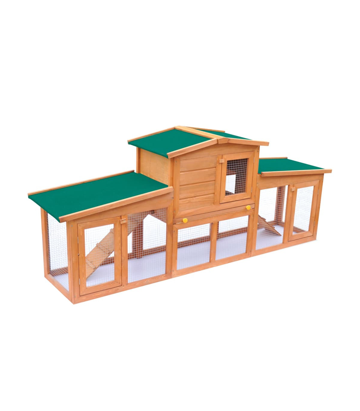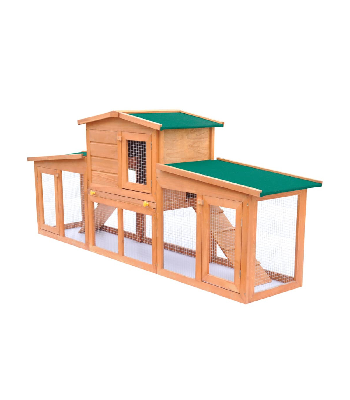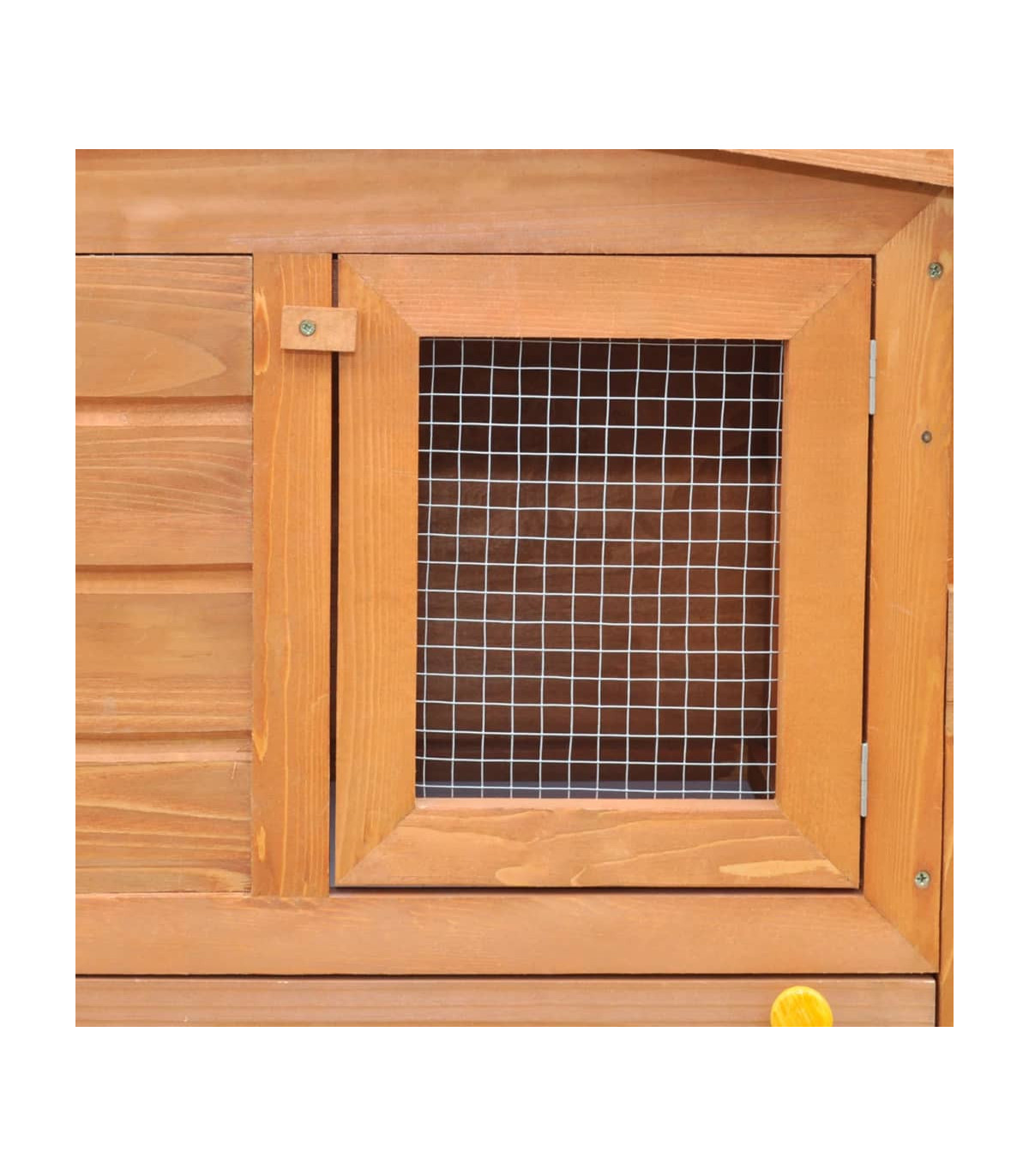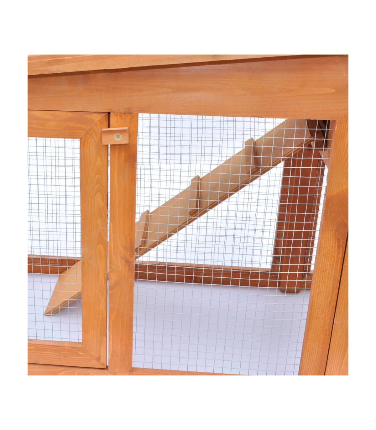 This quality hutch of 2 layers provides a large cozy place for keeping small animals, especially the cute rabbits. It features multiple uses: playing, exercising, training, or simply keeping your pets safely. This rabbit hutch provides your pets with plenty of exercise space while the tight iron wire mesh helps prevent mischievous behaviors and unexpected accidents. Meanwhile, the construction of iron wire grid ensures your monitoring of the pets and enables your pets to keep an eye on the surroundings and get enough fresh air. The rabbit hutch is built with high-quality wood frame, making it a strong and safe enclosure that lasts for years. Its green roof keeps rain away while the cozy cubby makes the perfect sleeping area. Two easy-climb ladders lead from the lower ground level to the upper floor. The pull-out tray makes cleaning easy. And the doors close easily and lock with slide-bolt latches. This spacious wooden rabbit cage is perfect for small pets. Important note: We recommend you placing the rabbit cage under shelter. Accordingly, it will last a longer life.