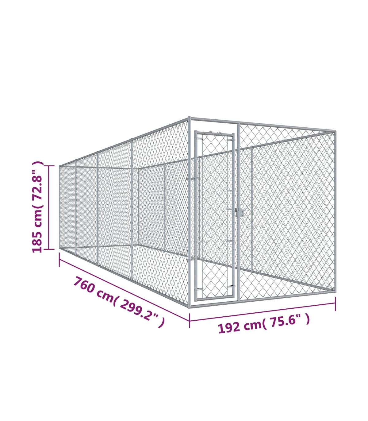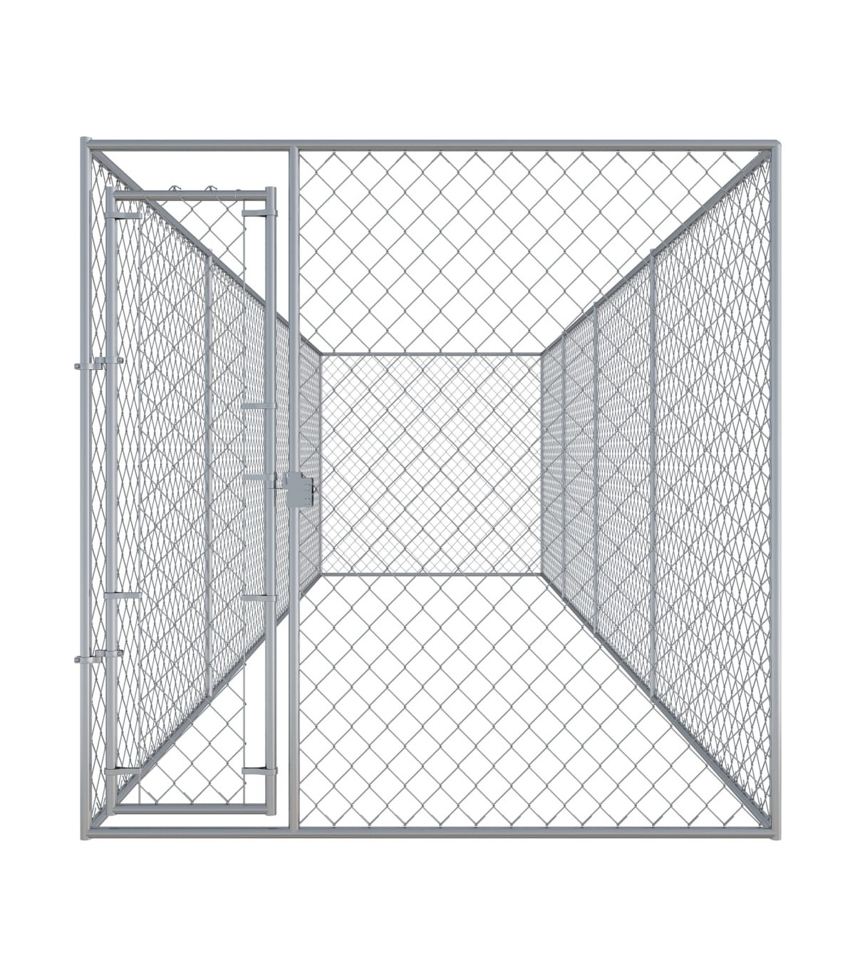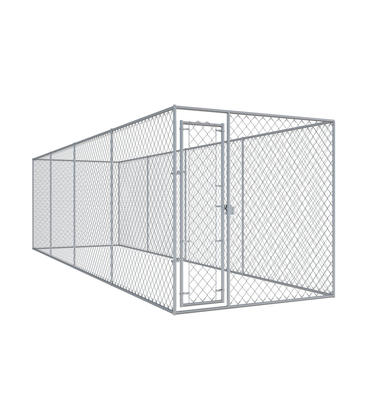 This versatile dog kennel has multiple uses: playing, exercising, training, or simply keeping your dogs safe. It will be the perfect play paradise for your furry friends! This large dog kennel provides ample exercise space while the chain link mesh all around helps prevent mischief and unexpected accidents, while enabling ventilation. Thanks to the sturdy and heavy-duty galvanised steel construction, this dog kennel is durable and built to last. The included top canopy, made of 100% polyethylene, is fire-resistant and UV protected, providing protection from sun, rain, snow and other weather conditions. The hinged door ensures extra security and safety for your dogs thanks to the lockable latch system. Assembly is easy.