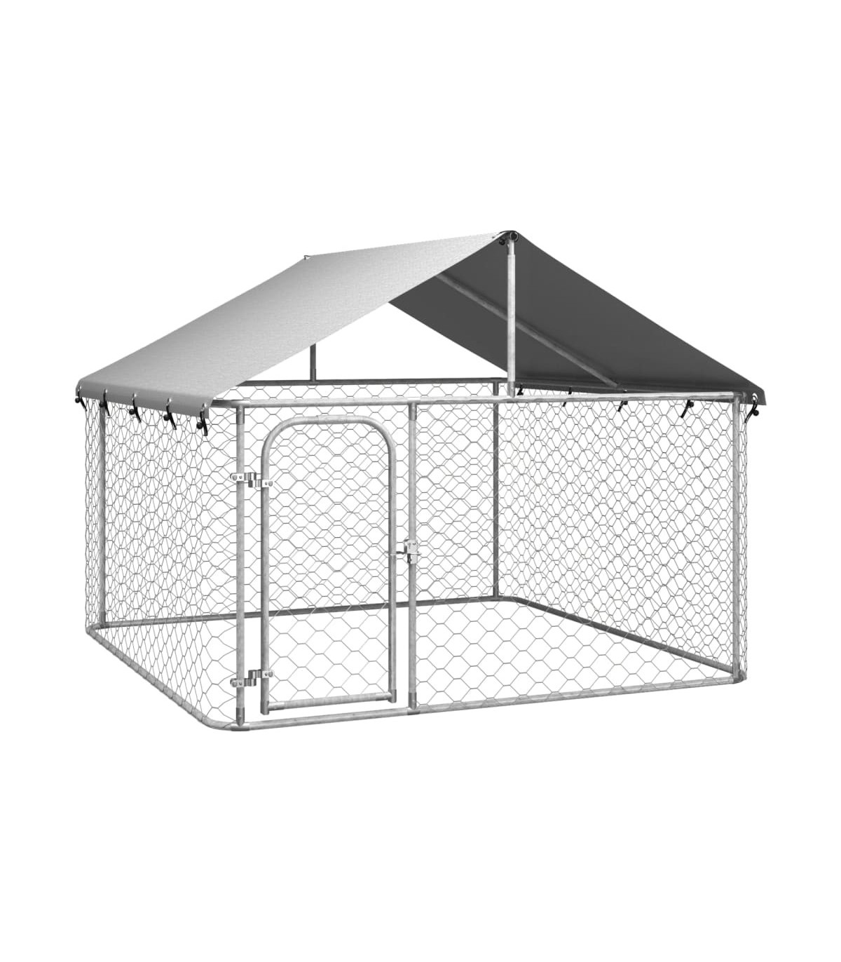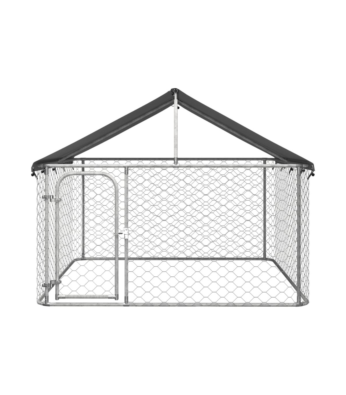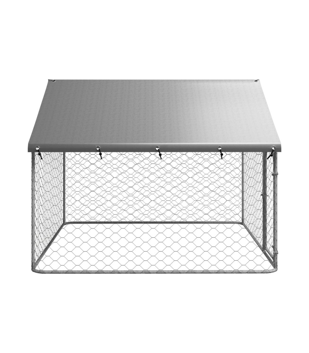 Provide safety, security and comfort for your puppy with this outdoor dog kennel. This versatile dog house features multiple uses: playing, exercising, training, or simply keeping your dog safe. It will be the perfect play paradise for your furry friends! This large dog kennel provides ample exercise space while the mesh all around helps prevent mischief and unexpected accidents while enabling ventilation. Thanks to the sturdy and heavy-duty galvanised steel construction, this quality dog kennel is durable and built to last. Made of 100% polyethylene, the included top canopy is fire-resistant and UV protected, providing protection from sun, rain, snow, as well as other weather conditions. The hinged door with lockable latch system ensures extra security and safety for your dogs.