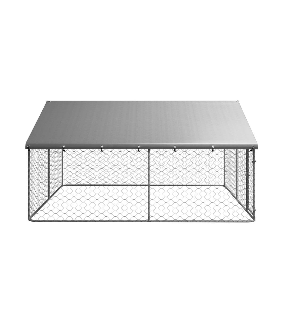 Provide safety, security and comfort for your puppy with this outdoor dog kennel. This versatile dog house features multiple uses: playing, exercising, training, or simply keeping your dog safe. It will be the perfect play paradise for your furry friends! This large dog kennel provides ample exercise space while the mesh all around helps prevent mischief and unexpected accidents while enabling ventilation. Thanks to the sturdy and heavy-duty galvanised steel construction, this quality dog kennel is durable and built to last. Made of 100% polyethylene, the included top canopy is fire-resistant and UV protected, providing protection from sun, rain, snow, as well as other weather conditions. The hinged door with lockable latch system ensures extra security and safety for your dogs.