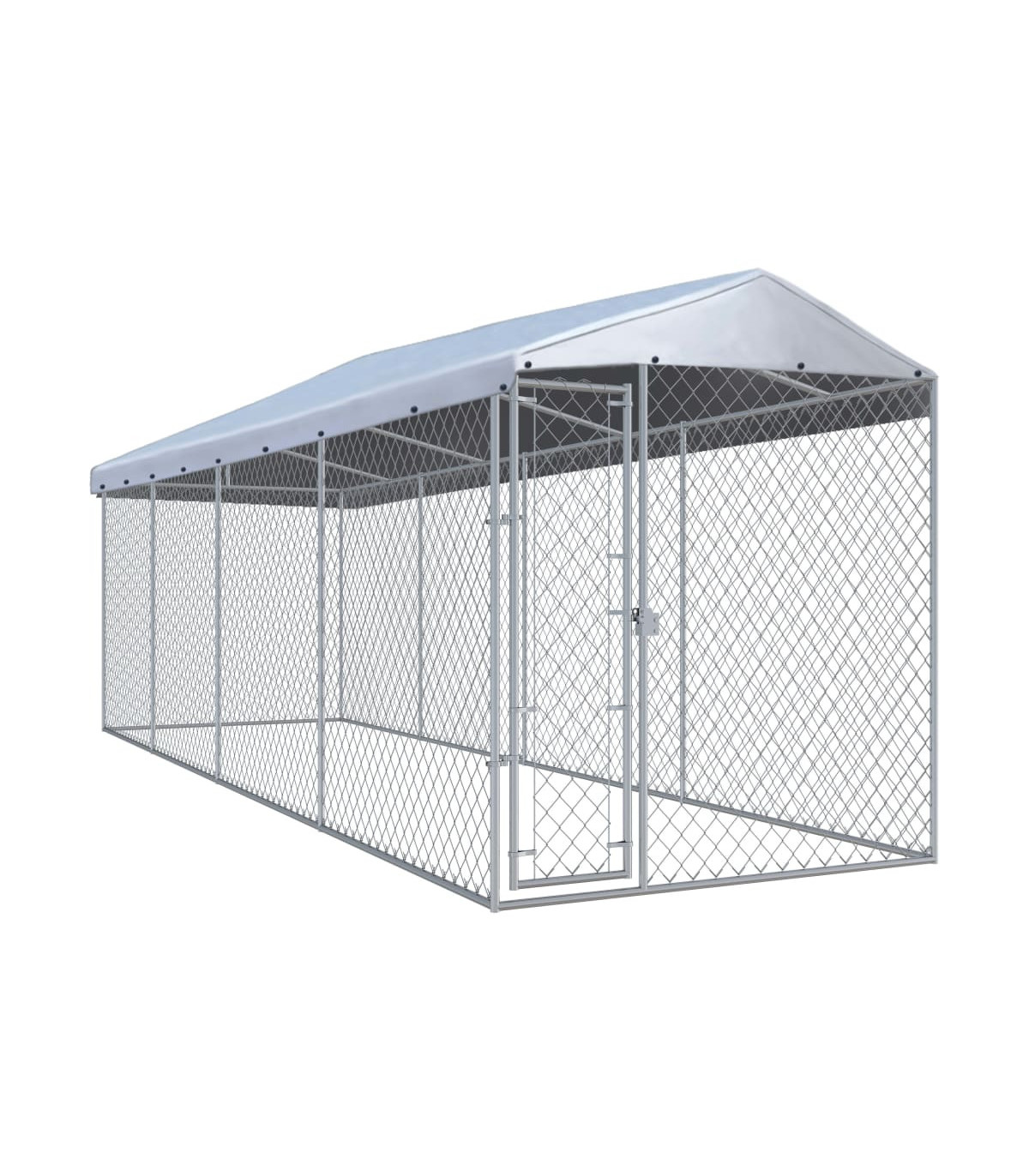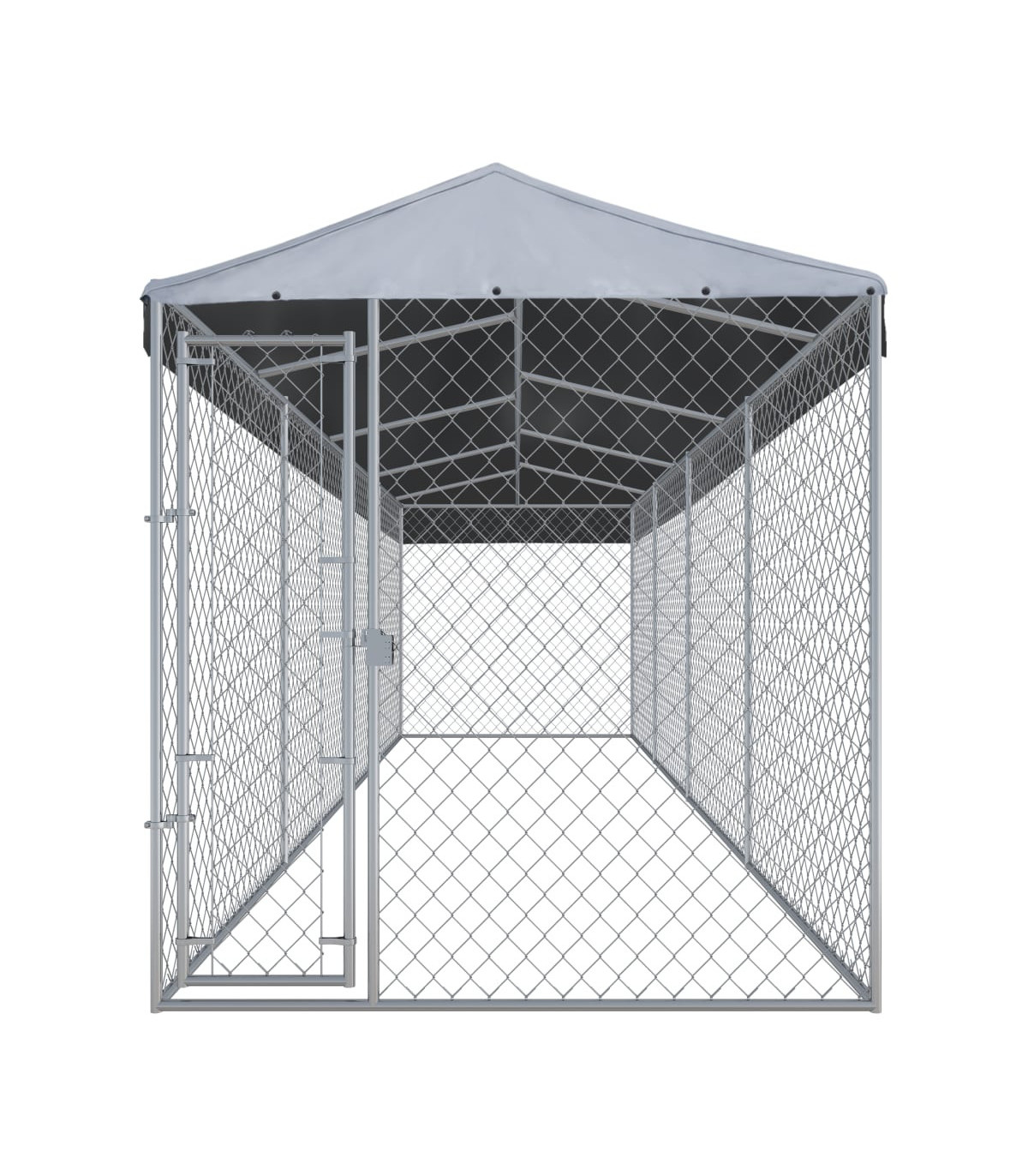 This versatile dog kennel has multiple uses: playing, exercising, training, or simply keeping your dogs safe. It will be the perfect play paradise for your furry friends! This large dog kennel provides ample exercise space while the chain link mesh all around helps prevent mischief and unexpected accidents, while enabling ventilation. Thanks to the sturdy and heavy-duty galvanised steel construction, this dog kennel is durable and built to last. The included top canopy, made of 100% polyethylene, is fire-resistant and UV protected, providing protection from sun, rain, snow and other weather conditions. The hinged door ensures extra security and safety for your dogs thanks to the lockable latch system. Assembly is easy.
