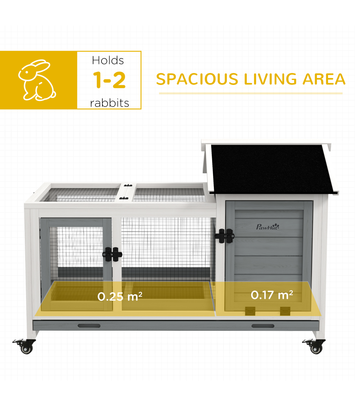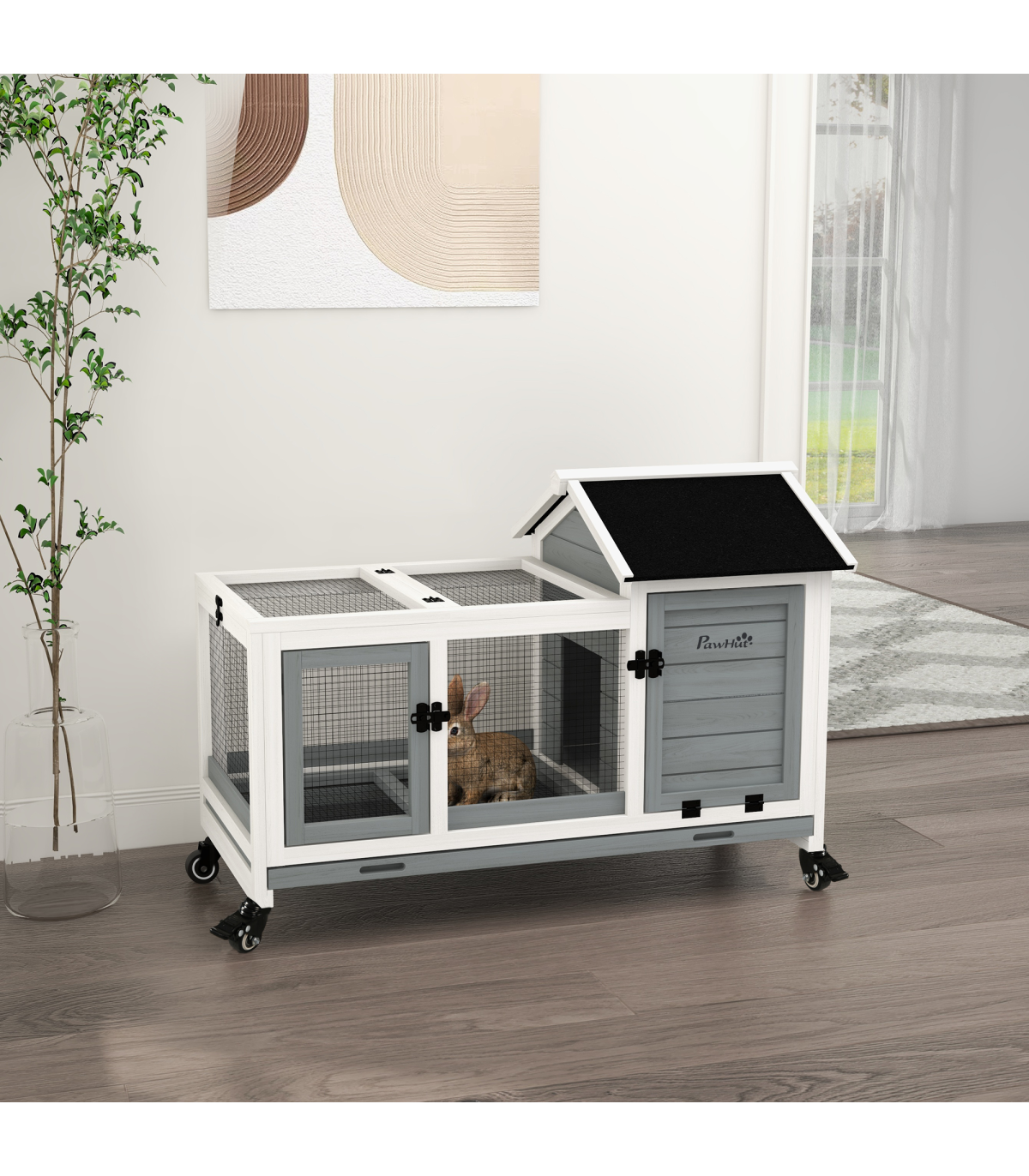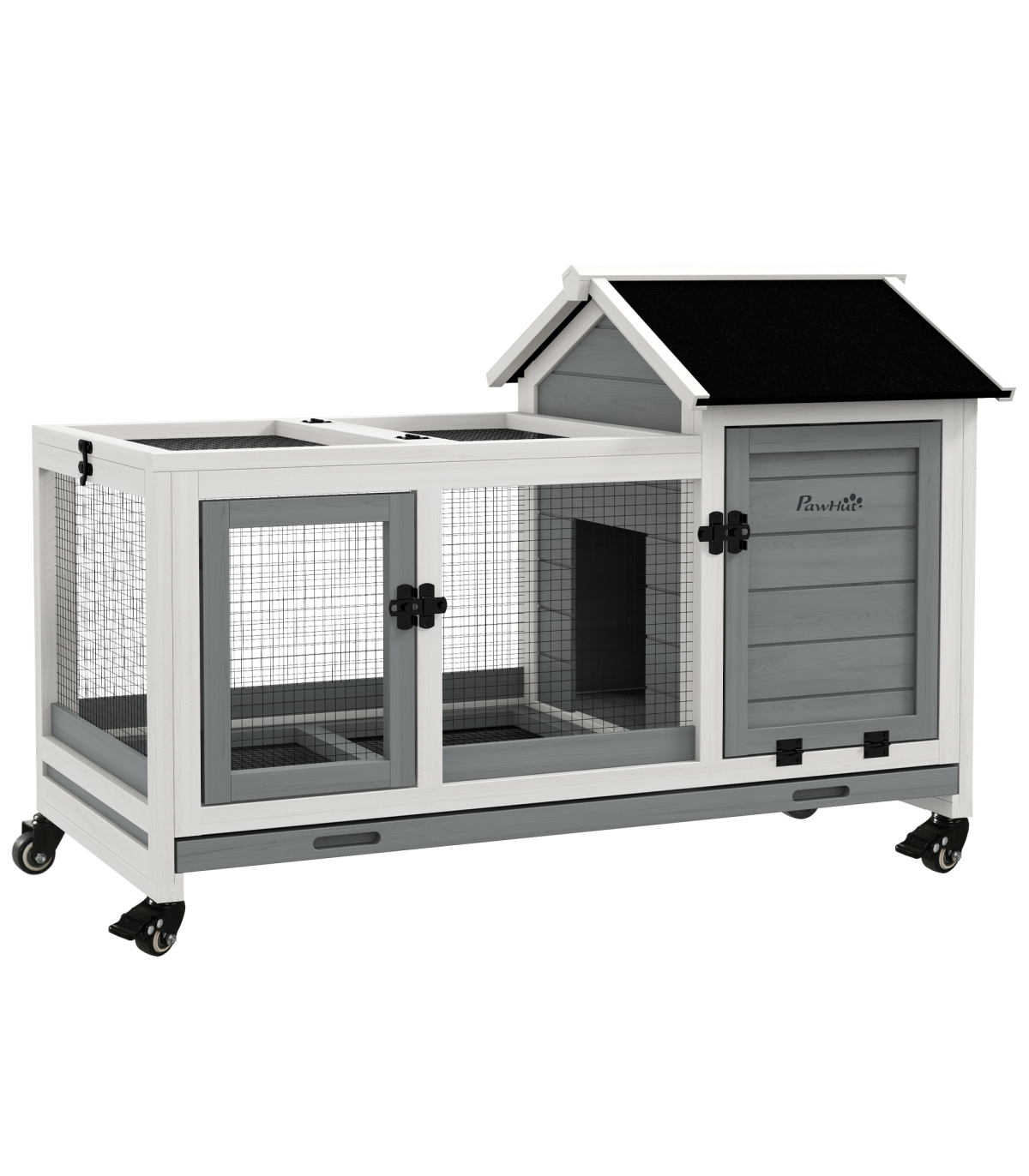 PawHut Wooden Rabbit Hutch, Small Animal House w/ Wheels, Removable Tray - Grey