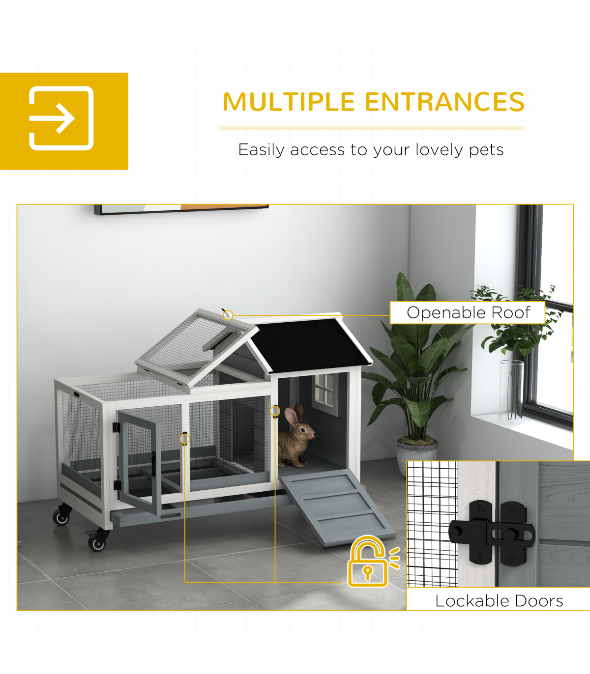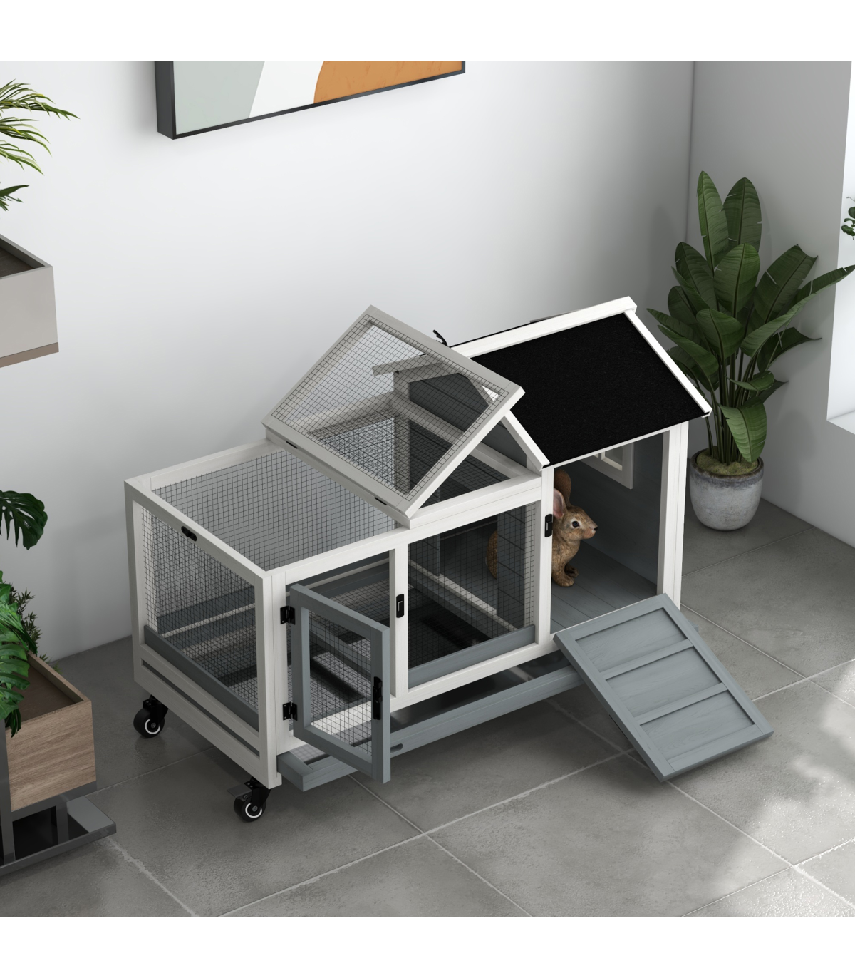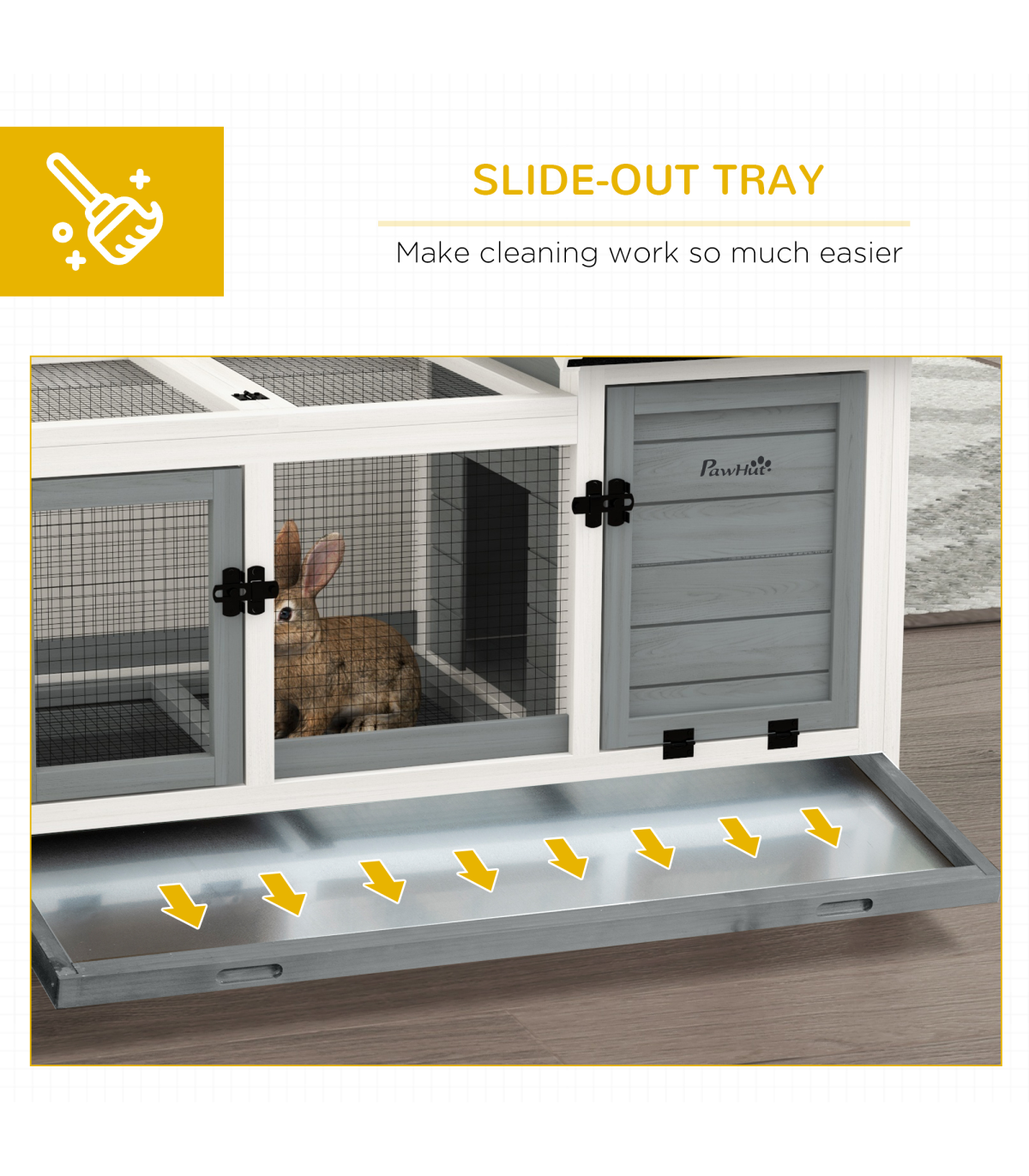 PawHut Wooden Rabbit Hutch, Small Animal House w/ Wheels, Removable Tray - Grey