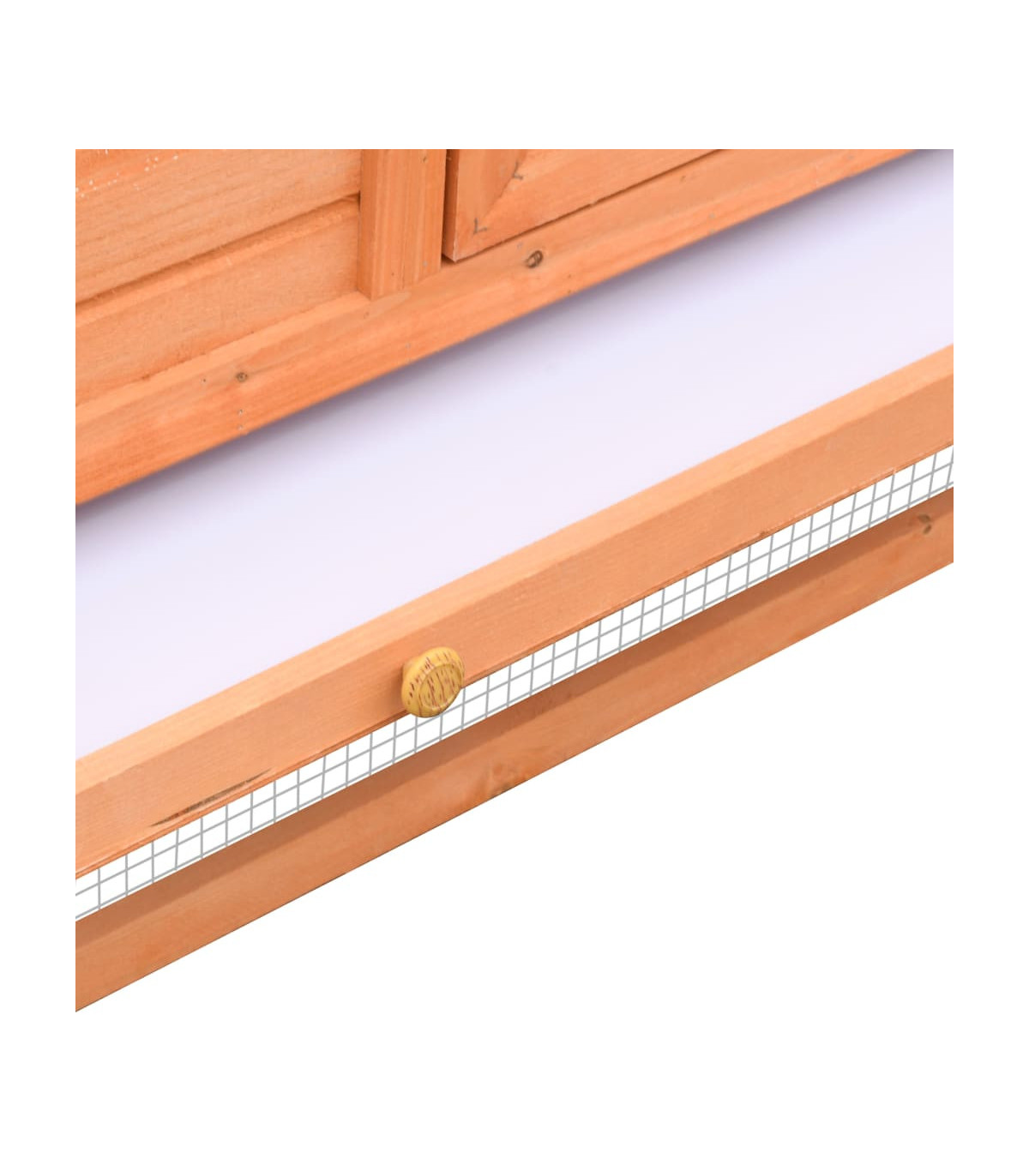 This quality hutch of 2 layers provides a large cosy place for keeping small animals, especially rabbits. It features multiple uses: playing, exercising, training, or simply keeping your pets safely. This rabbit hutch provides with plenty of exercise space while the tight iron wire mesh helps prevent mischievous behaviors and unexpected accidents. Meanwhile, the construction of iron wire grid ensures your monitoring of the pets and enables your pets to get enough fresh air. The rabbit hutch is built with high-quality wooden frame, making it a strong and safe enclosure that lasts for years. Its green roof keeps rain away while the cosy cubby makes the perfect sleeping area. An easy-climb ramp leads from the lower ground level to the upper floor. A pull-out tray makes cleaning easy. The doors close easily and lock with slide-bolt latches. This wooden rabbit cage is easy to assemble.