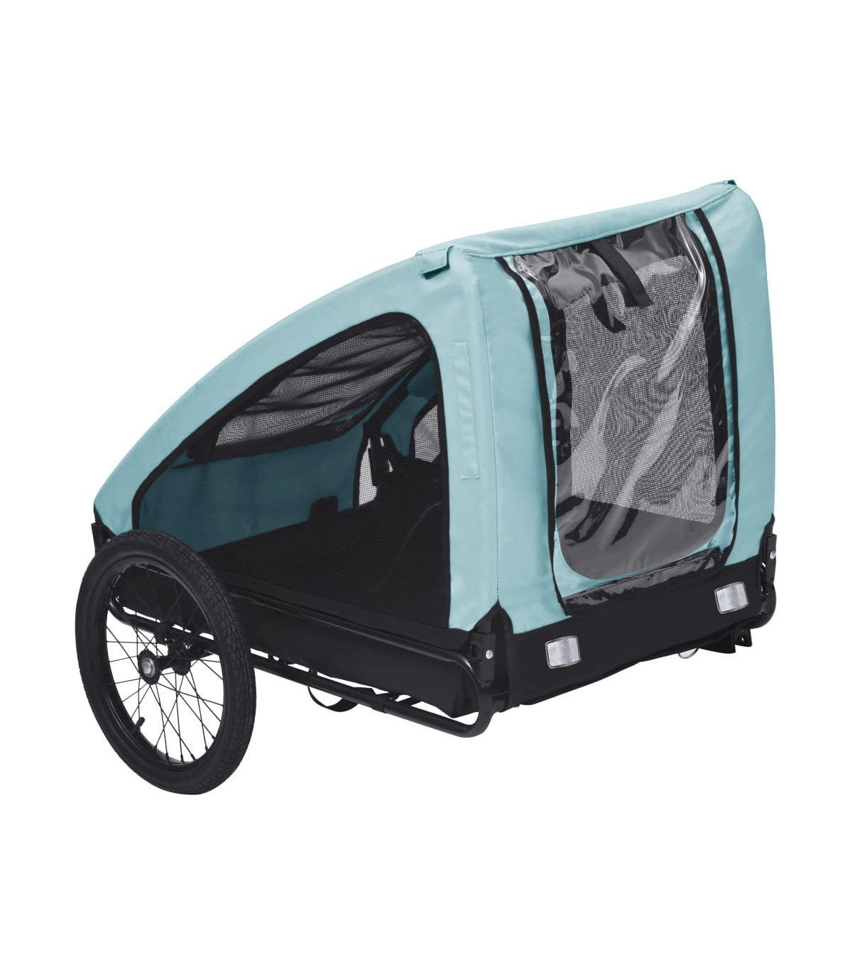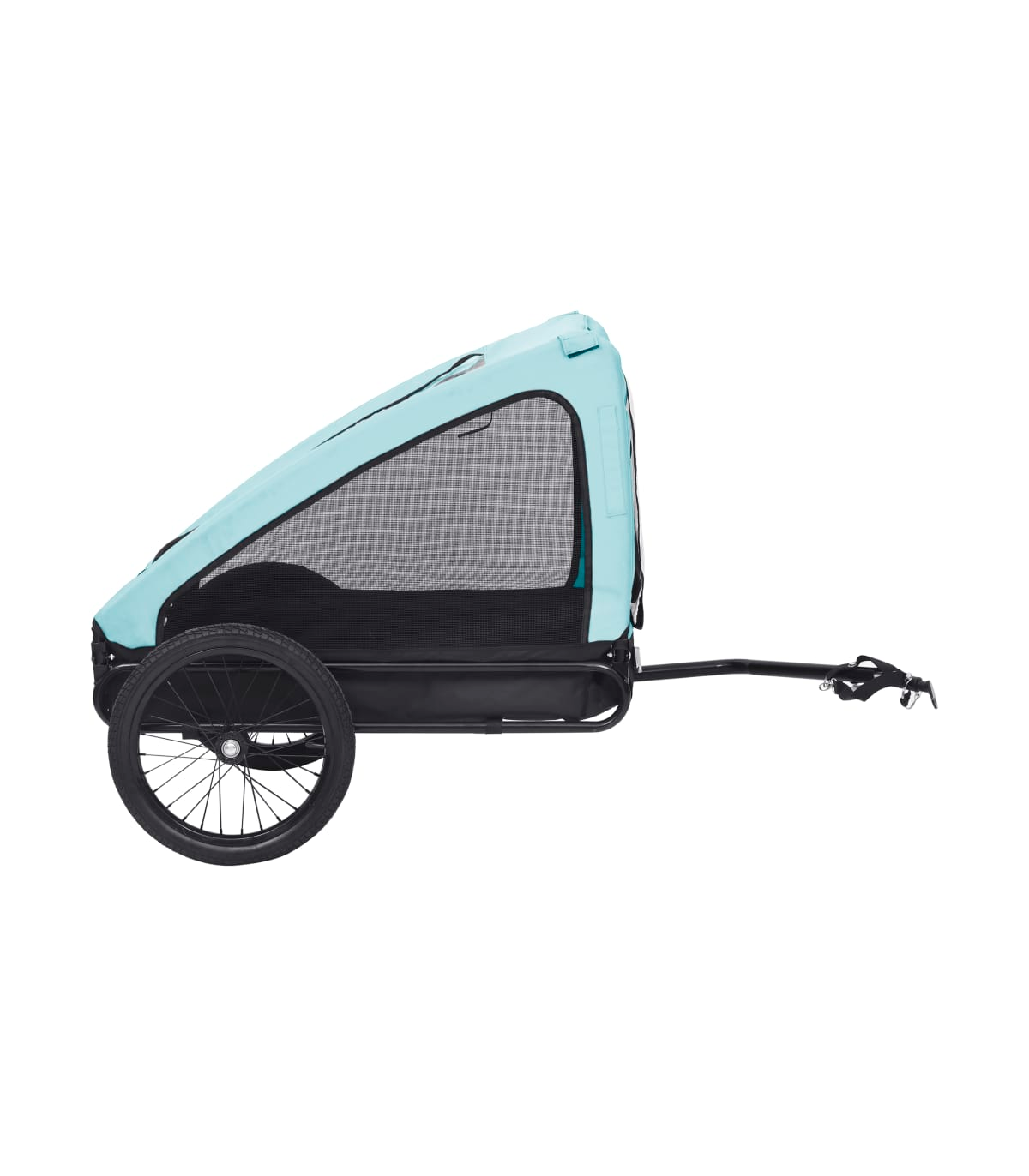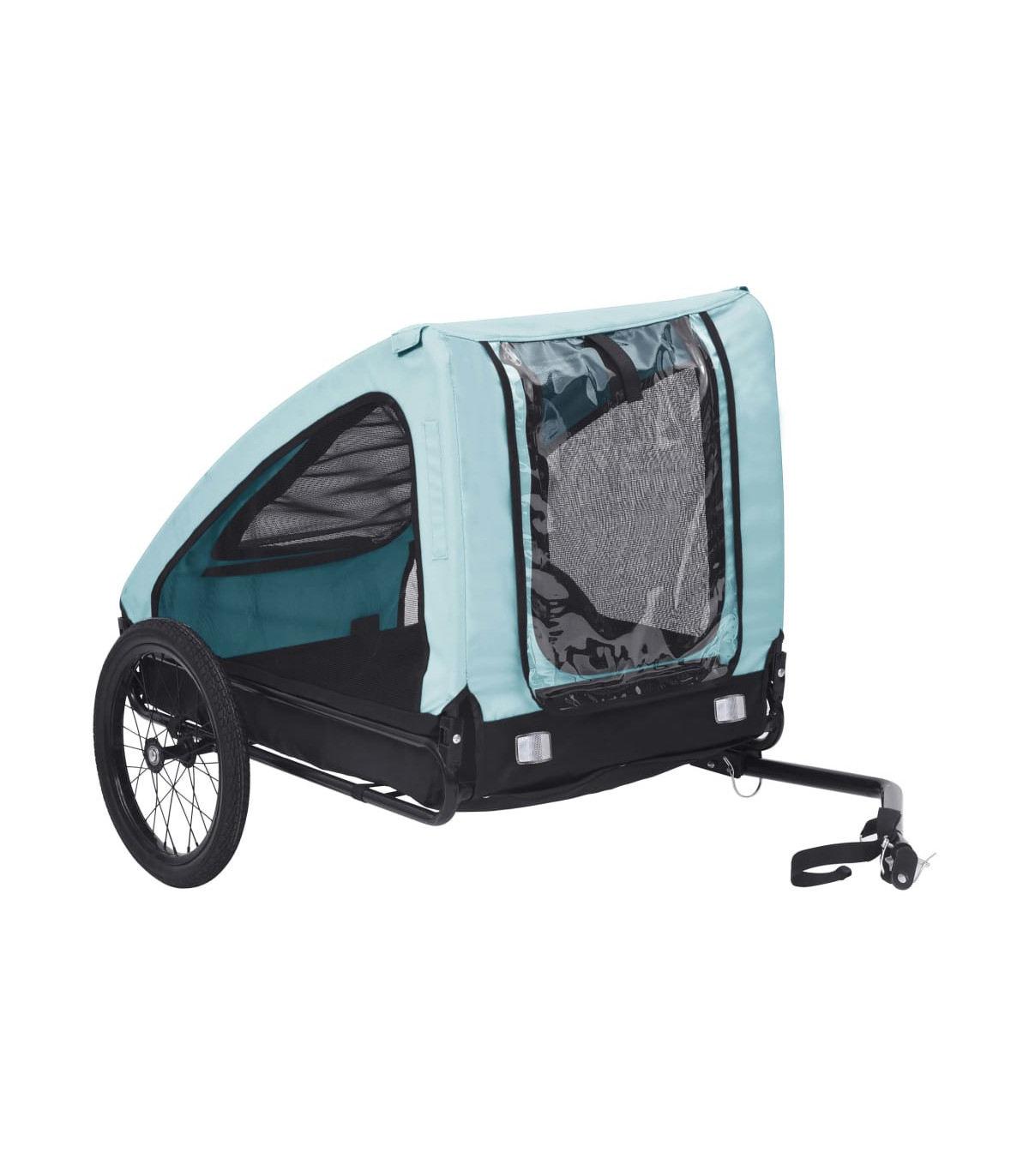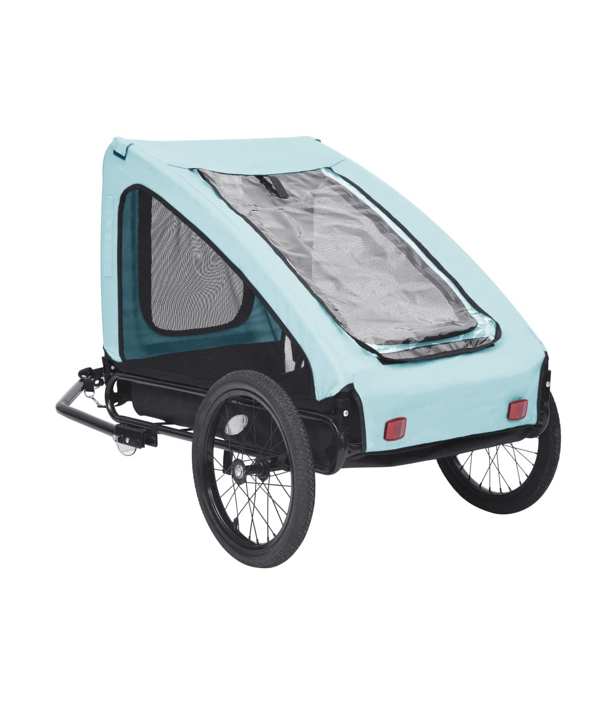 Take your dog or cat out on a bike ride in this cool pet bike trailer. The pet carrier features a sturdy steel frame and is made of oxford fabric, making it durable and easy to maintain. Its mesh windows on both sides allow for maximum air circulation, while the front and back offer dual entry for added convenience. The reflectors on the wheel and back keep you and your pet visible to others. The pet bike carrier has a quick release hitch for easy attachment to a bike. Additionally, it can be folded to save space when not in use.