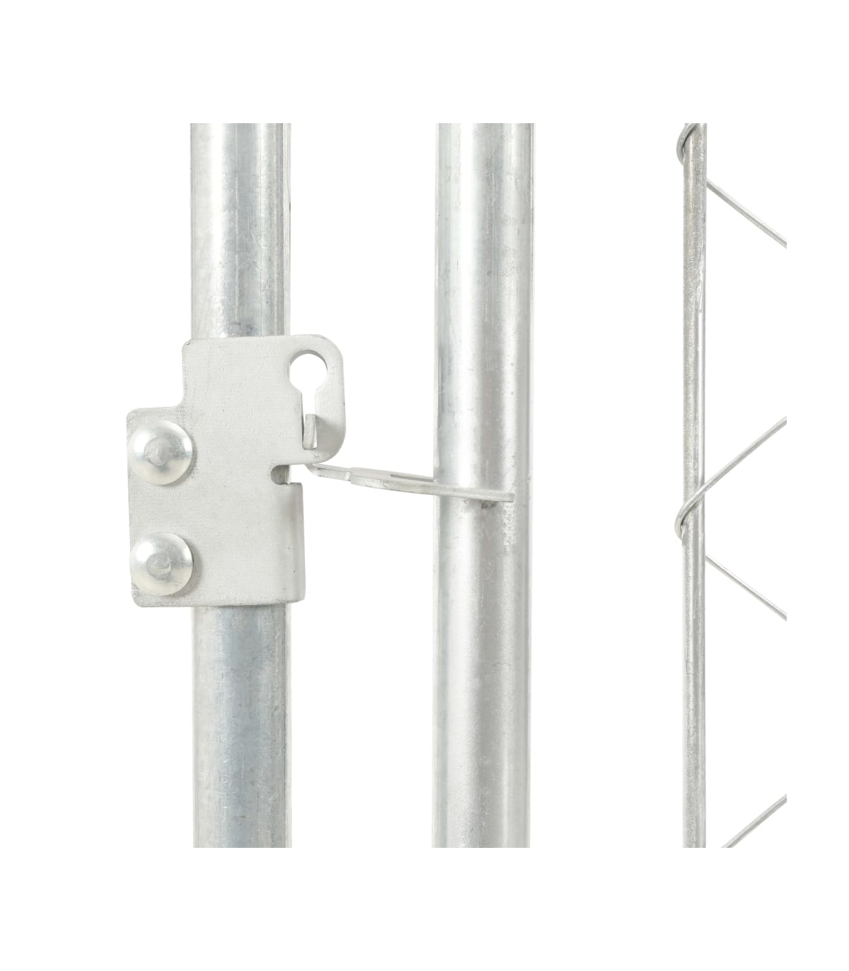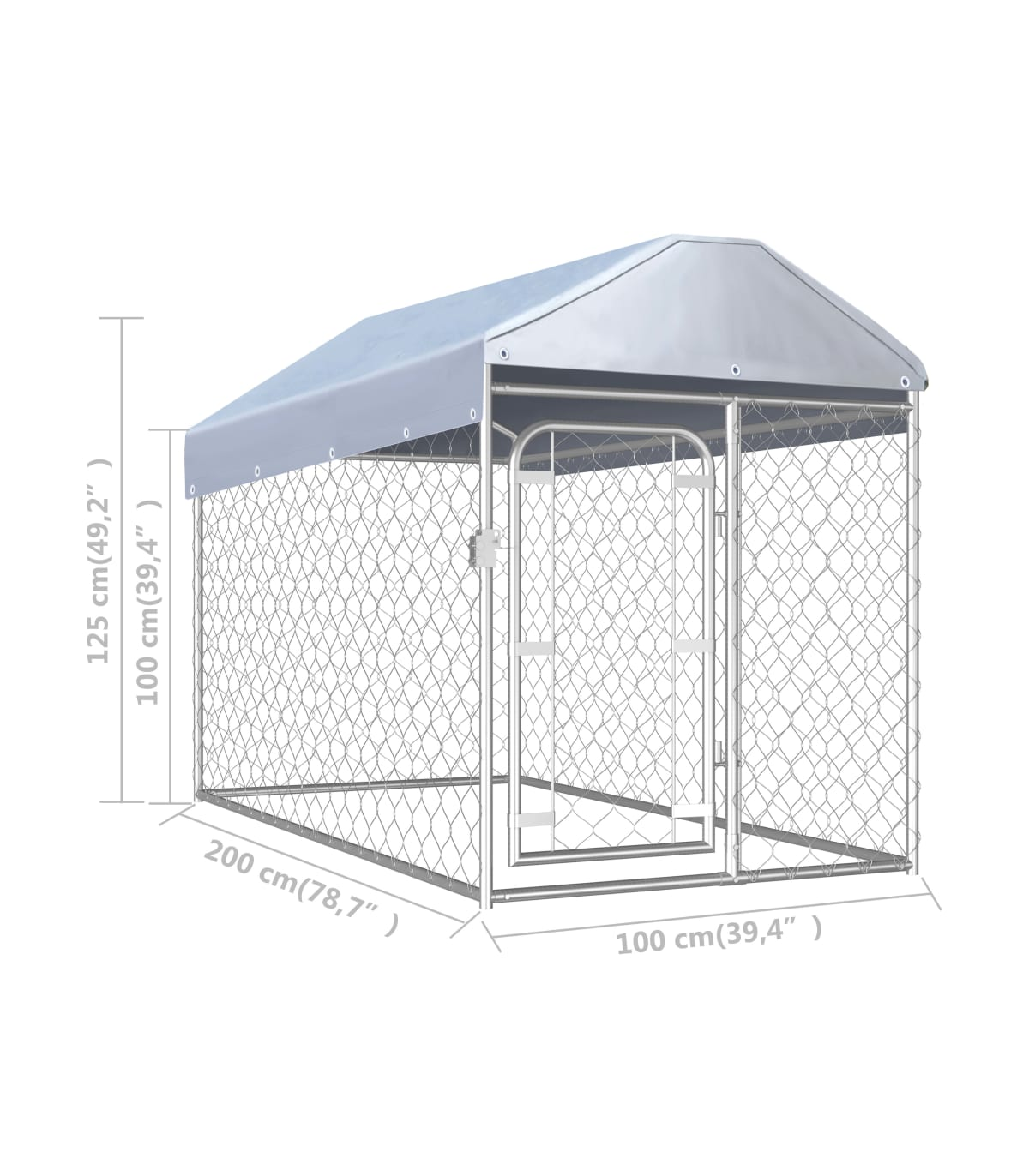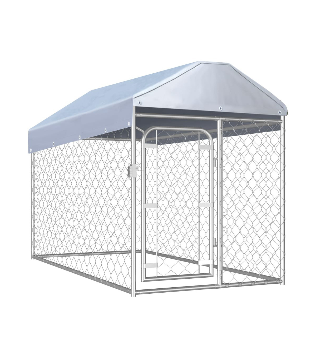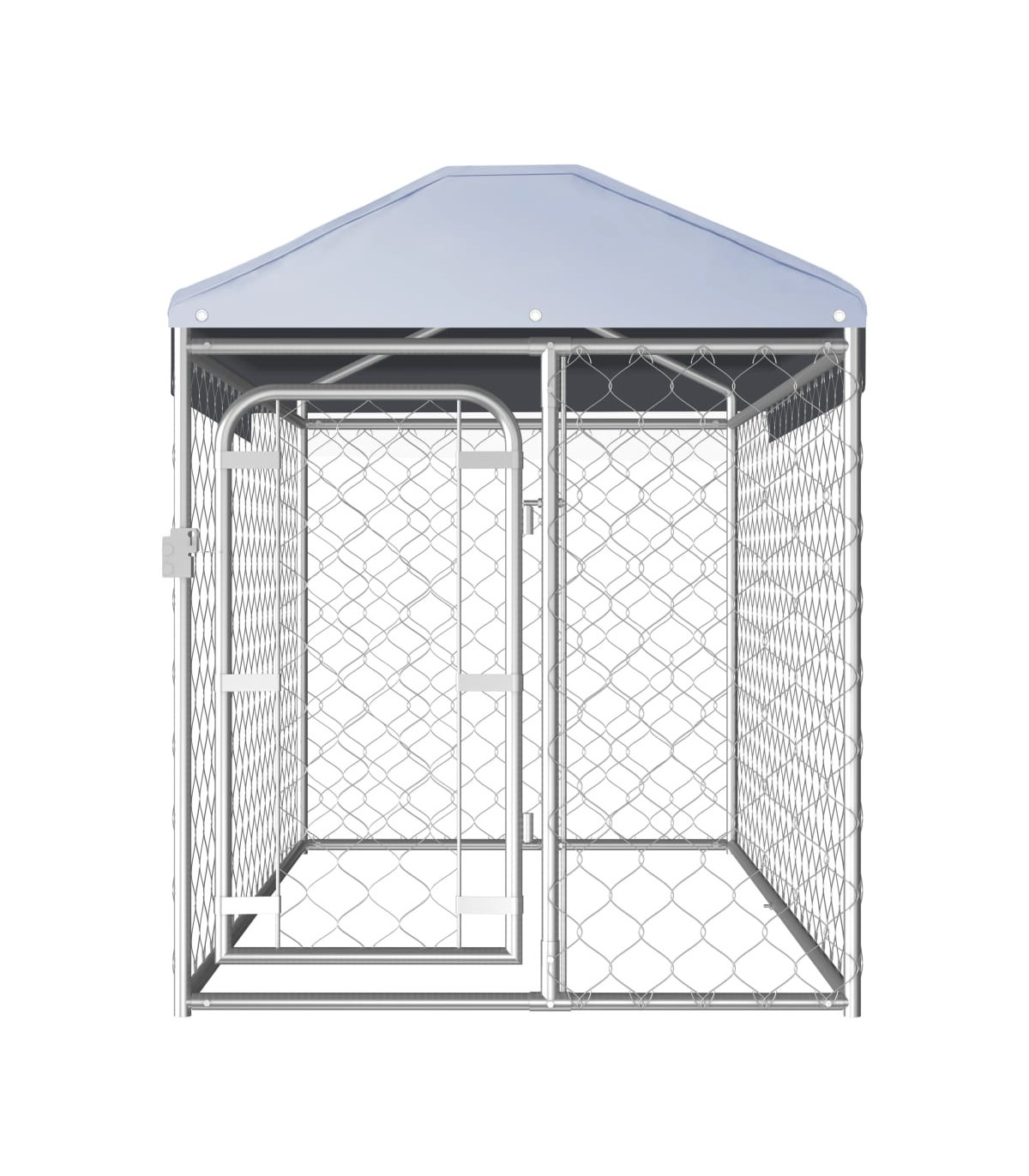 Provide safety, security and comfort for your puppy with this outdoor dog kennel. This versatile dog house features multiple uses: playing, exercising, training, or simply keeping your dog safe. It will be the perfect play paradise for your furry friends! This large dog kennel provides ample exercise space while the chain link mesh all around helps prevent mischief and unexpected accidents while enabling ventilation. Thanks to the sturdy and heavy-duty galvanised steel construction, this quality dog kennel is durable and built to last. Made of 100% polyethylene, the included top canopy is fire-resistant and UV protected, providing protection from sun, rain, snow, as well as other weather conditions. The hinged door with lockable latch system ensures extra security and safety for your dogs. The kennel is easy to assemble. Please note that the door can be installed on the left or right side, which depends on your own needs.